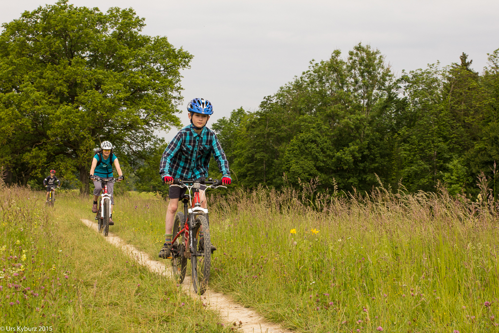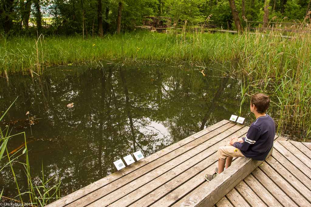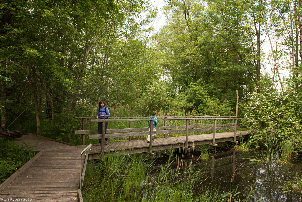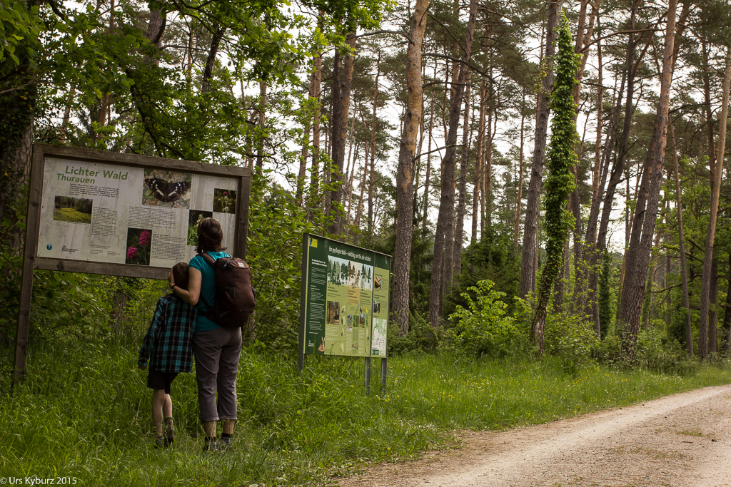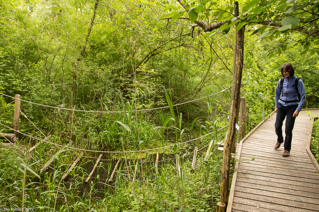 Wir fahren weiter zur Ellikoner Brücke, in deren Nähe wir unsere Bikes abstellen und zu Fuss weiter gehen. Ein Lehrpfad für Kinder führt uns durch die Gegend. Am Anfang wird uns eine Aufgabe gestellt: Dem Eisvogel wurden die Eier aus dem Nest geklaut und wir sollen herausfinden, wer es war. Alle weiteren Tafeln geben Hinweise auf den Täter. Und ganz nebenbei lernen wir viel über den Auenwald, deren Bewohner und die Gegend allgemein. Wie schon erwähnt mäanderte die Thur früher frei und unberechenbar durch die Gegend. Bei einer Tafel, mitten im Wald, steht, dass hier früher die Thur durchfloss. Unglaublich!