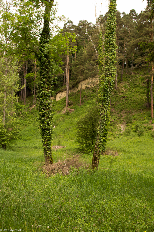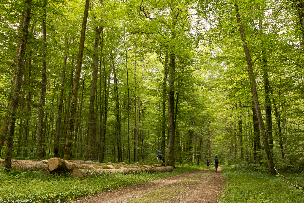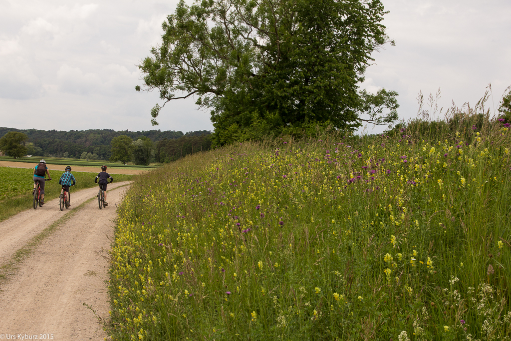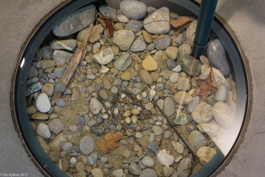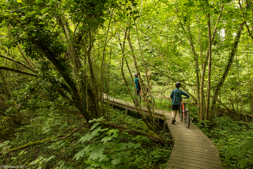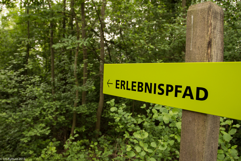 Wir fahren weiter zur Ellikoner Brücke, in deren Nähe wir unsere Bikes abstellen und zu Fuss weiter gehen. Ein Lehrpfad für Kinder führt uns durch die Gegend. Am Anfang wird uns eine Aufgabe gestellt: Dem Eisvogel wurden die Eier aus dem Nest geklaut und wir sollen herausfinden, wer es war. Alle weiteren Tafeln geben Hinweise auf den Täter. Und ganz nebenbei lernen wir viel über den Auenwald, deren Bewohner und die Gegend allgemein. Wie schon erwähnt mäanderte die Thur früher frei und unberechenbar durch die Gegend. Bei einer Tafel, mitten im Wald, steht, dass hier früher die Thur durchfloss. Unglaublich!