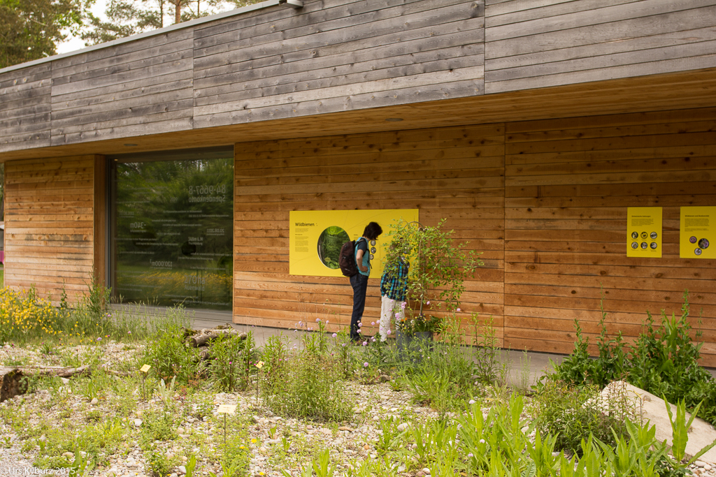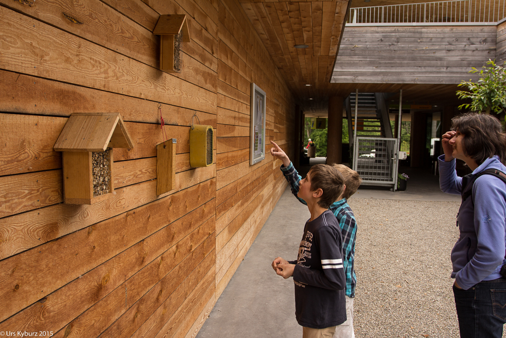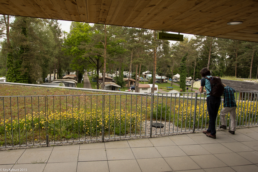 Wir begeben uns zum Naturzentrum Thurauen, das im Campingplatz integriert ist. Es ist ein moderner Holzbau, der 2011 eröffnet wurde. Im gleichen Bau befindet sich das Restaurant „Rübis & Stübis“, in dem man gut, aber nicht ganz billig isst.