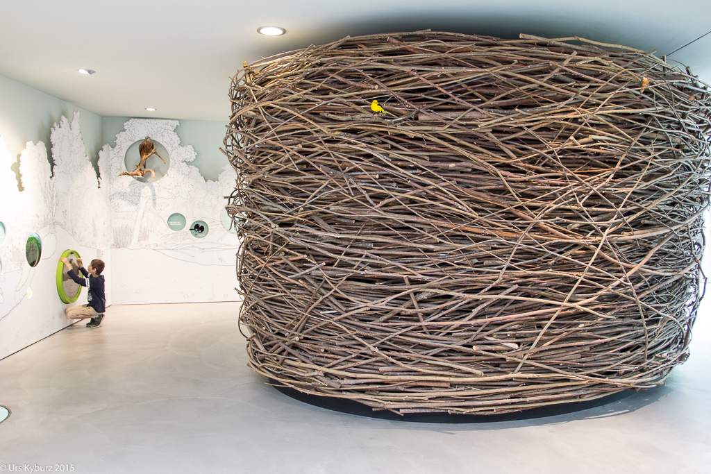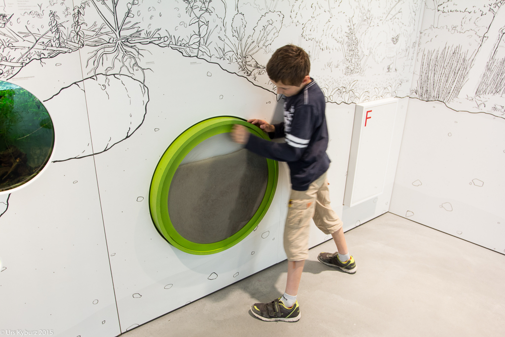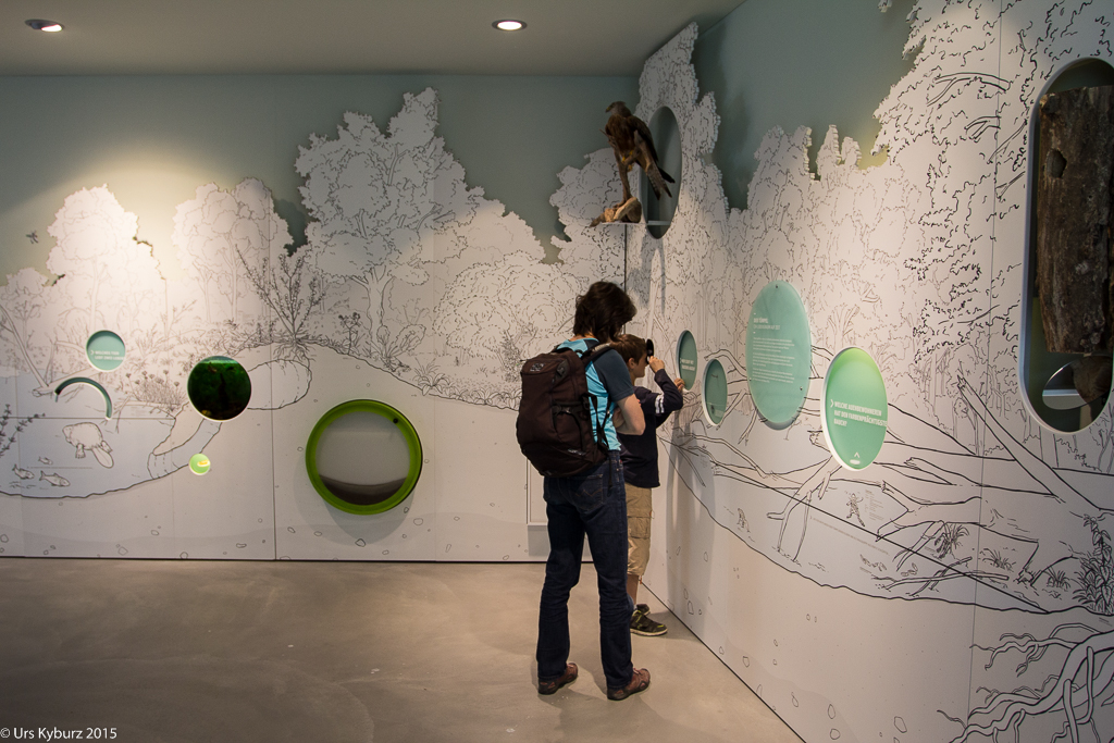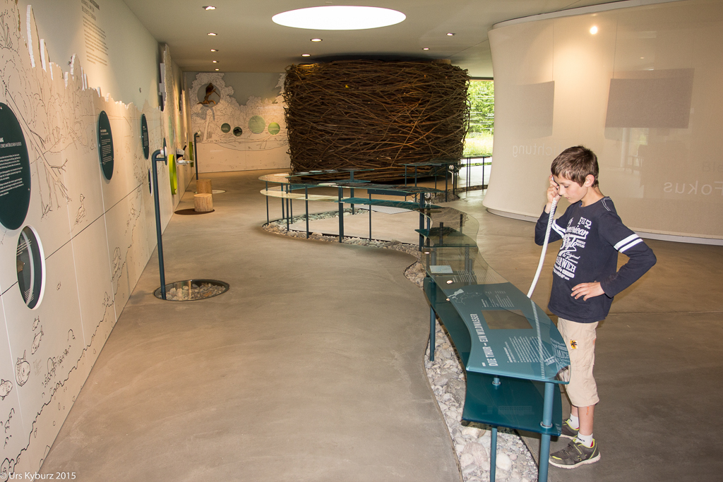 Die Ausstellung ist relativ klein, nur auf einem Geschoss in einem Raum, bietet aber eine Fülle an Informationen. Zum einen erfahren wir etwas über die Thur selber. Bis ca. 1860 mäandrierte sie frei durch die Ebene und bedrohte die Siedlungen immer wieder mit Hochwasser. Mit der Thurkorrektion, bei der der Fluss in einen Kanal gelegt wurde, konnte dieses Risiko entschärft, aber nicht beseitigt werden. Durch die Korrektion gingen aber auch wertvolle Lebensräume und mit ihnen viele Arten verloren. Diesen Fehler korrigierte man zu Beginn des neuen Jahrtausends wieder. Der alte Verlauf konnte zwar nicht wieder hergestellt werden, aber mit umfangreichen Massnahmen renaturierte man das Mündungsgebiet, wo die Thur in den Rhein fliesst.