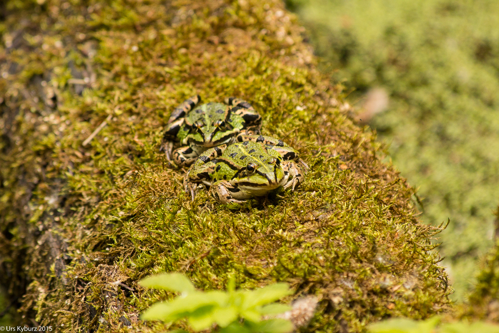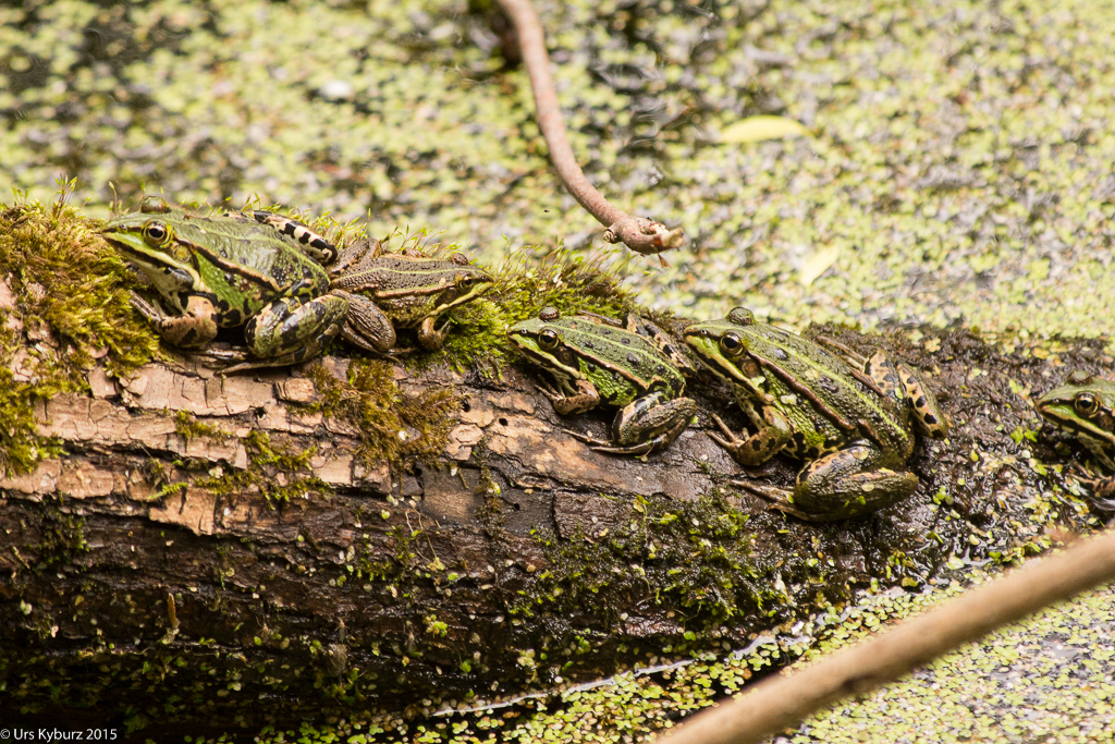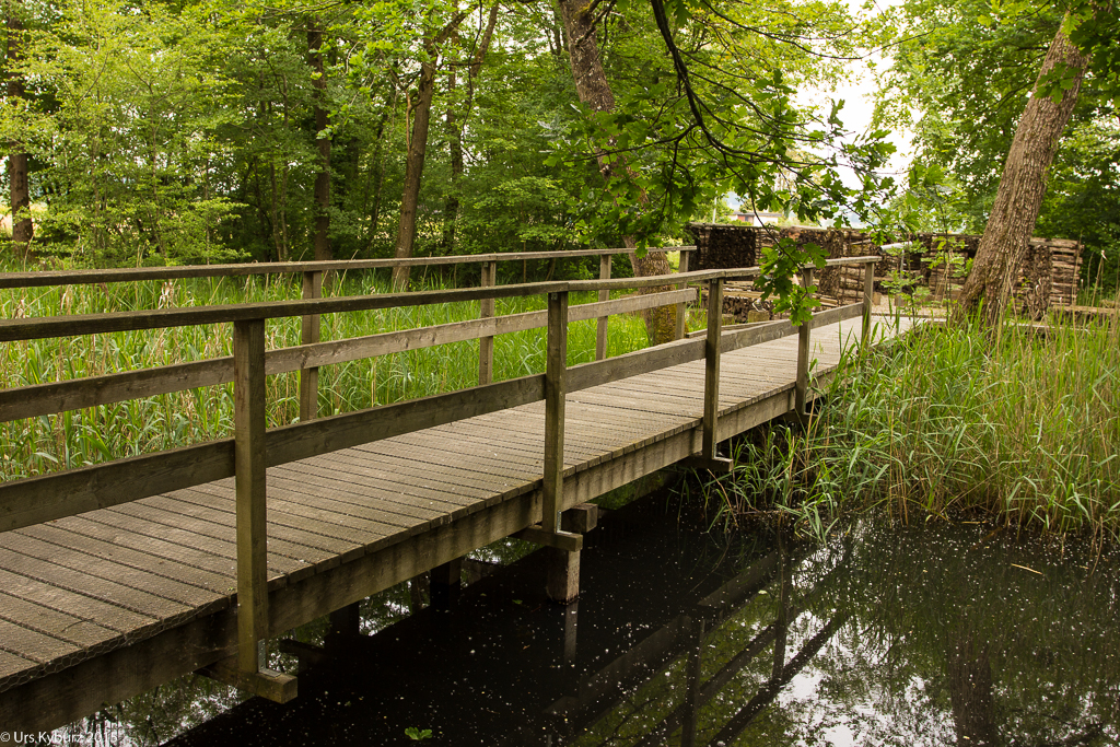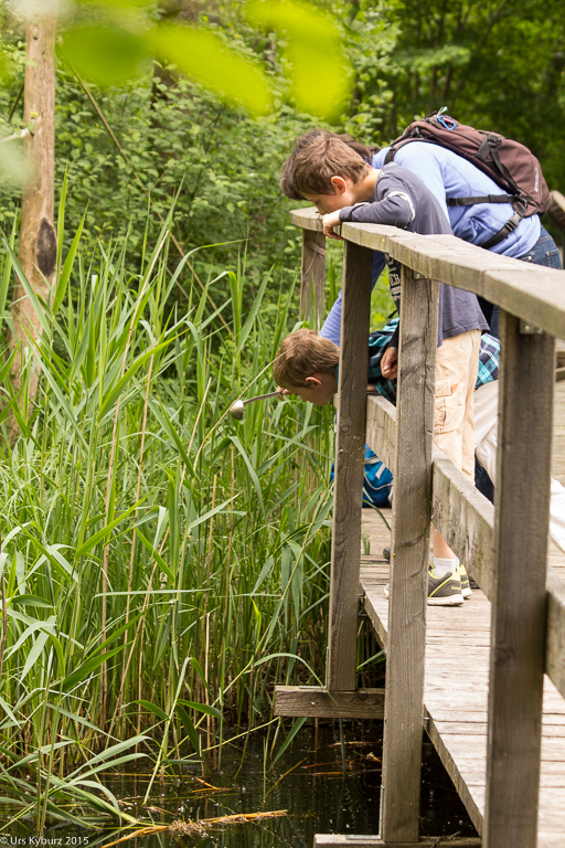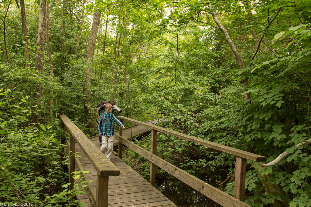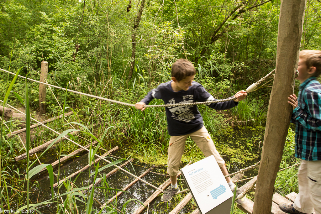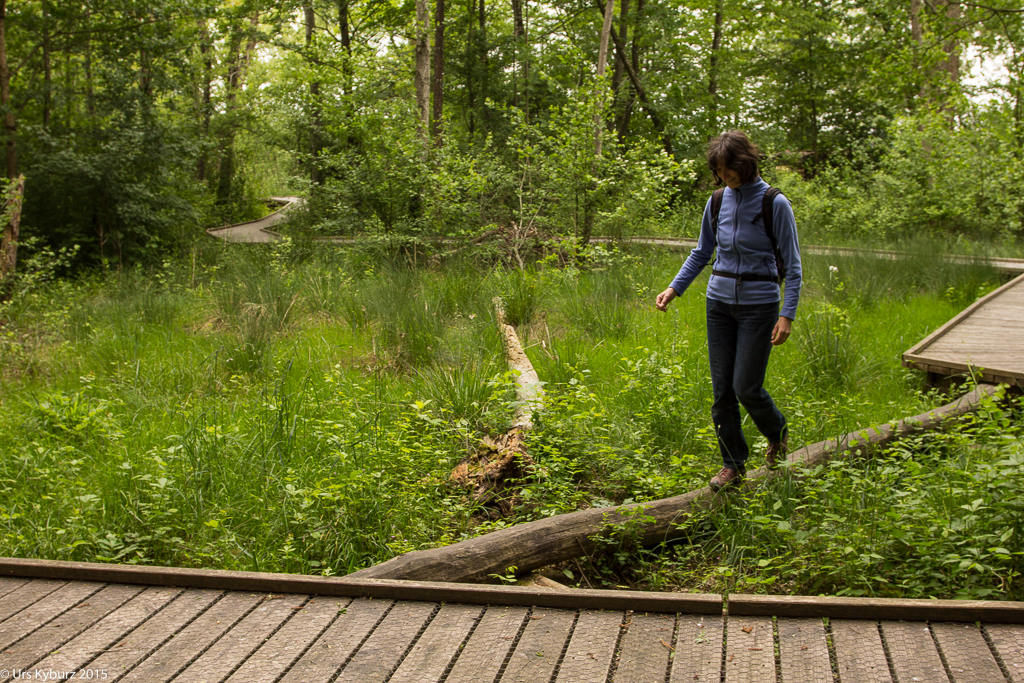 Nun haben wir genug gelernt, wir wollen nach draussen. Über eine Treppe steigen wir auf das Gebäude und haben einen schönen Überlick über das Gelände. Ein Brücke führt über den Platz darunter. Auf der anderen Seite hat man einen Anblick, den man normalerweise nicht hat: Man sieht direkt in die Baumkronen. Nach dem Abstieg befinden wir uns mitten in einem Stück Auenwald, mit Sümpfen, Bächen und Teichen. Ich komme mir vor wie im tropischen Regenwald. Überall sind Frösche, wahrscheinlich Teichfrösche. Regungslos sitzen sie auf Ästen, die im Wasser liegen.
