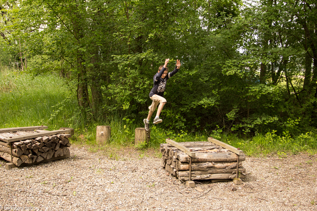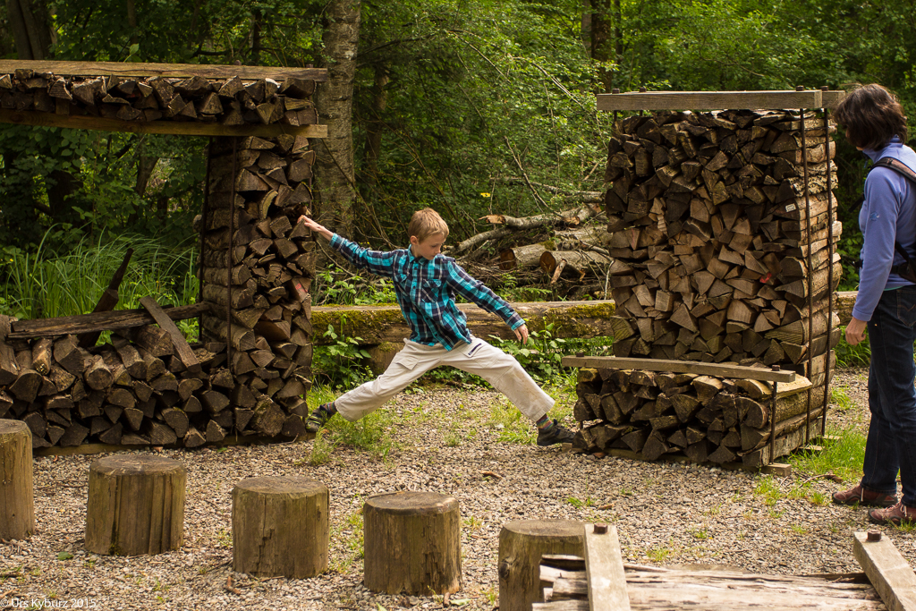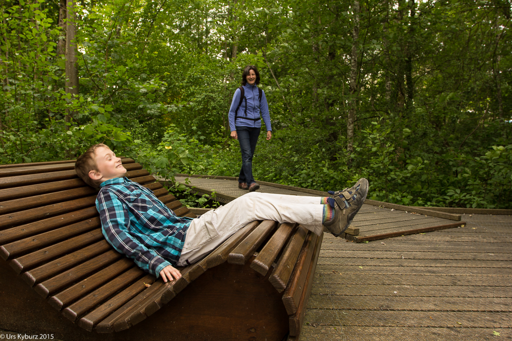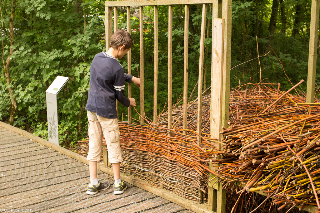 Eine Seilbrücke führt über einen Teich, jedoch würde man jetzt ziemlich nasse Füsse kriegen. Und überall sieht man Spuren vom Biber: Seine Pfade, die er immer geht, geschälte Äste, angenagte Bäume. Damit er nicht jeden annagt, sind sie zum Teil mit Drahtgeflecht eingewickelt. Bequeme Liegen laden zum Verweilen, Lauschen und Sehen ein. Es ist eine richtige kleine Oase der Ruhe im Trubel des Zeltplatzes. Holzbeigen dienen, je nach Lust und Laune, zum Absitzen oder zum Rumturnen. Die Kinder haben sich natürlich für zweiteres entschieden. Im Schilf macht ein Teichrohrsänger auf sich aufmerksam. Bei der nächsten Station lernt man die Bedeutung von Silberweiden kennen und mit bereitgestellten Weidenästen kann man sich im Flechten versuchen. Da der Rundgang so schön ist, machen wir ihn gleich nochmals.