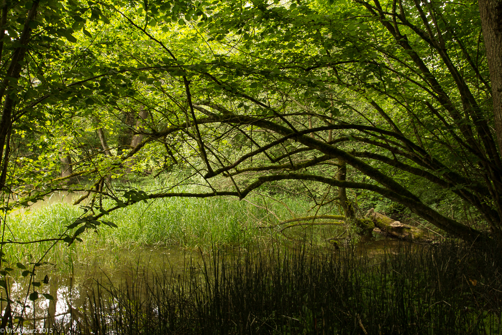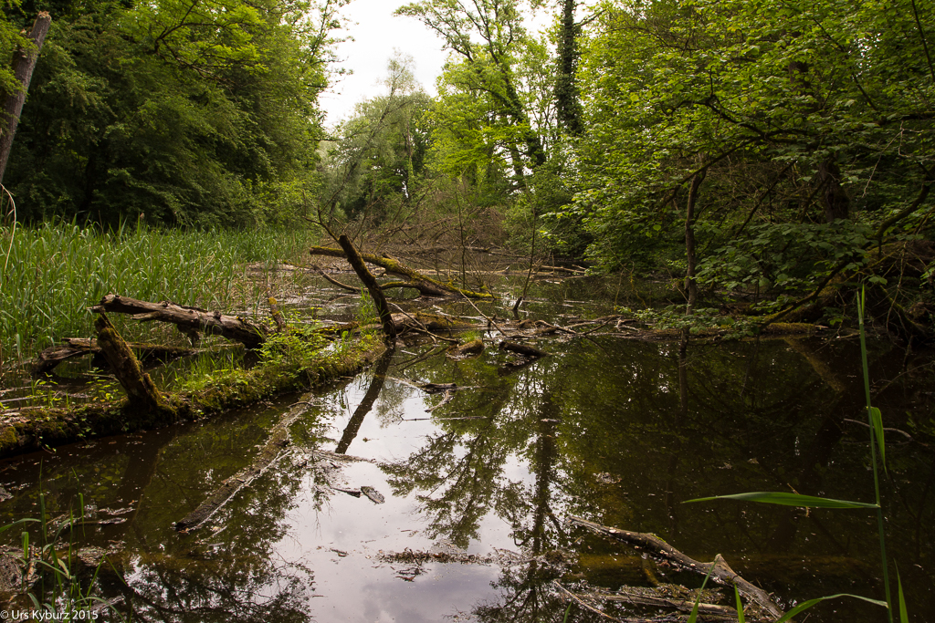 Am Pfingstmontag fahren wir mit den Bikes in die Thurauen, die etwa 1 1/2 Kilometer vom Zeltplatz entfernt sind. Im Wald können wir auch wieder trockenen Fusses auf einem Holzsteg gehen. Die Äste hängen tief, Weiher reiht sich an Weiher. Wunderschön wild! Immer wieder meinen wir den Pirol zu hören, sind uns aber trotzdem nicht sicher.