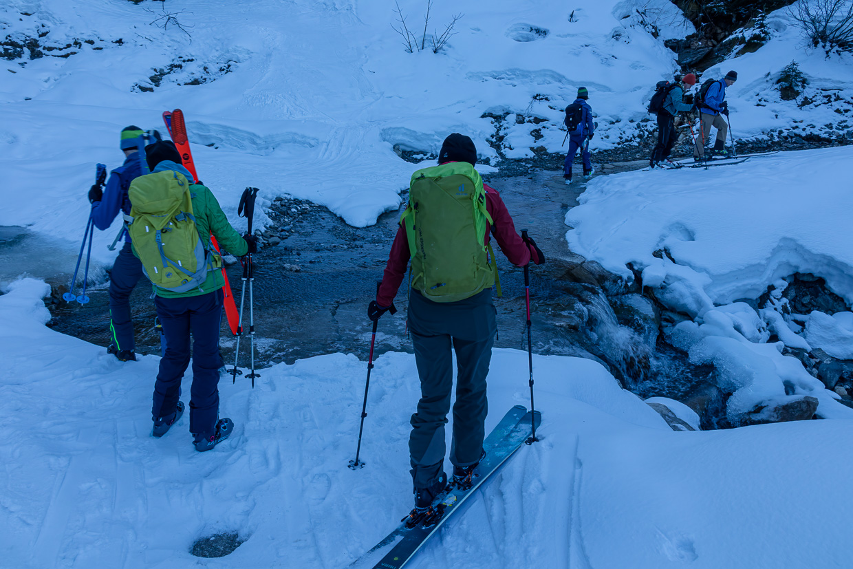 Neun Mitglieder des SAC Homberg treffen sich um halb acht zuhinterst in Sörenberg. Dass fünf davon miteinander verwandt sind, ist kein Zufall. Was aber wichtiger ist: Es ist wie eine Nostalgietour, wir kennen alle schon fast 30 Jahre. Ausser unseren Fabian, den mit Abstand Jüngsten der Gruppe. Wir starten also auf der gesperrten Panoramastrasse unsere Tour. Bei der ersten Haarnadelkurve geht es bereits wieder abwärts zur Waldemme. Sie ist dort erst ein kleines Bächlein. Zum Glück, denn es gibt keine Brücke, nur eine Furt. Da der Schnee doch eher Mangelware ist, müssen wir die Skis abziehen. Anschliessend steigen wir auf zu Mittlist Arni (Undrist Arni haben wir offensichtlich schon passiert, einen Ort mit diesem Namen findet man nicht auf der Karte). Bald kommen wir an die Sonne. Gelegenheit, eine erste Pause einzulegen.