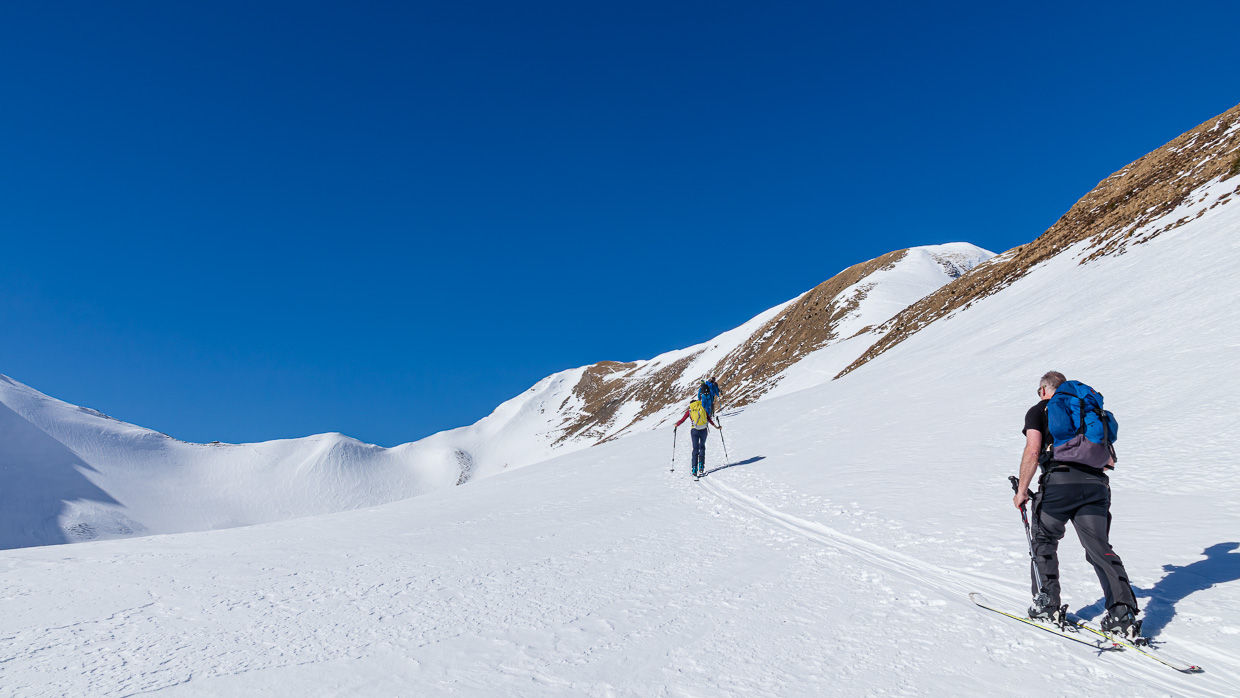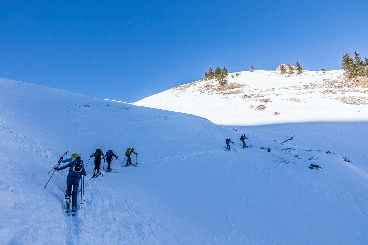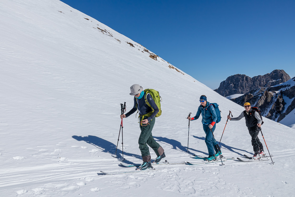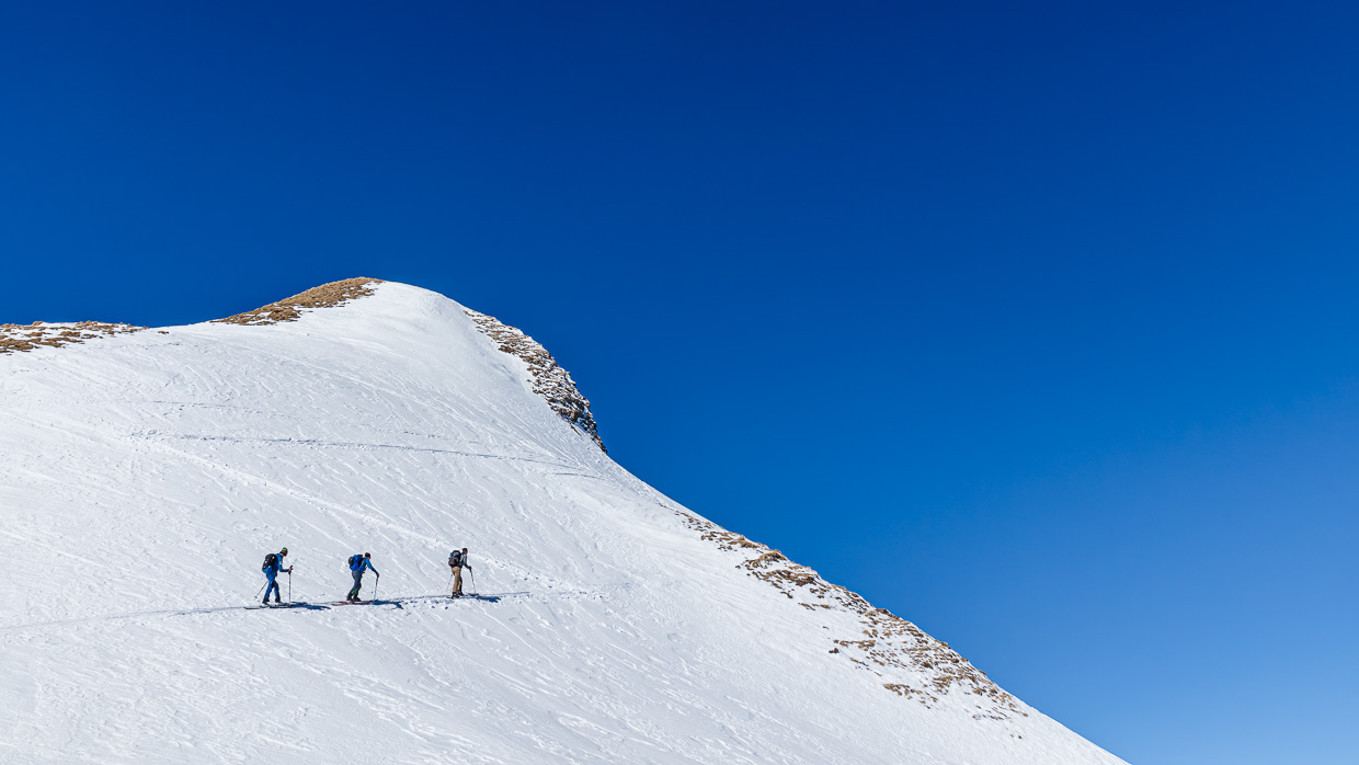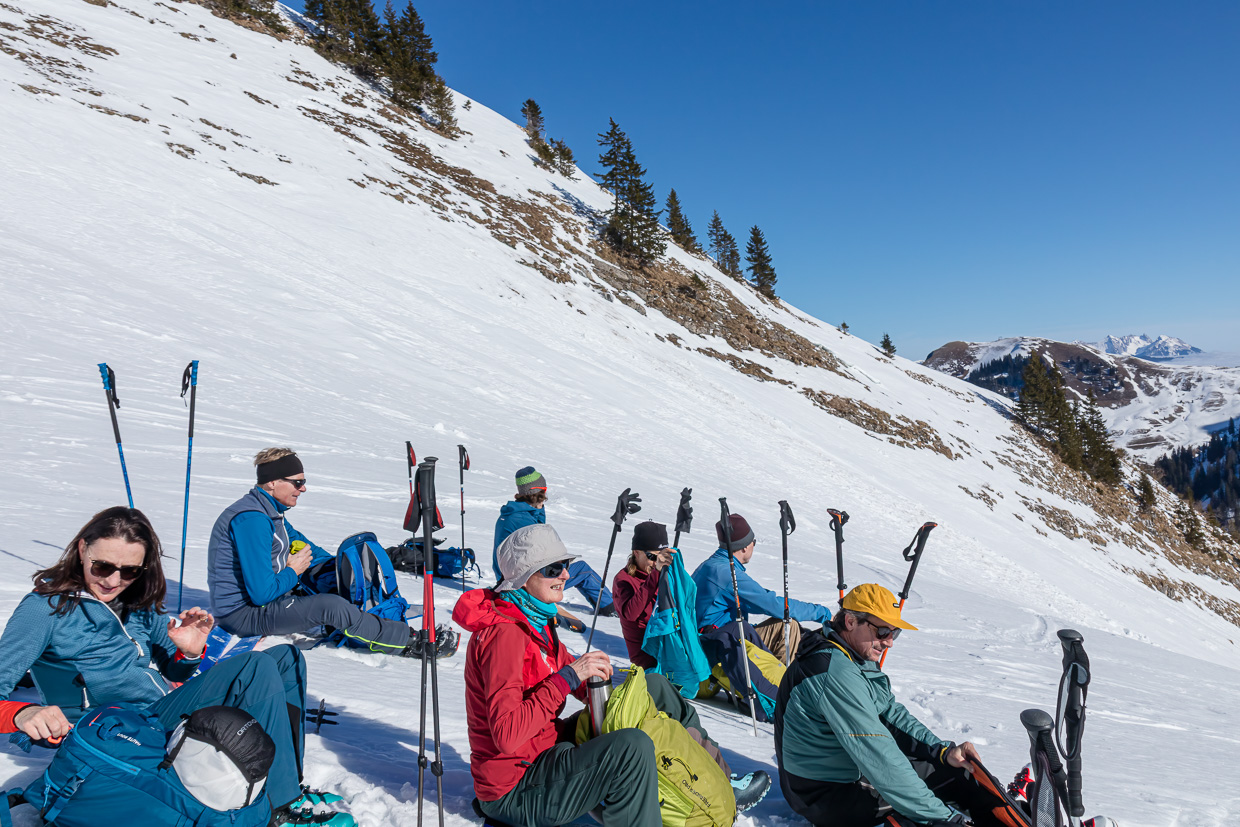Der Gipfelhang ist steil, zum Glück ist die Lawinensituation gut. Einer nach dem anderen fährt hinein, der Schnee ist gar nicht so übel. Meistens. Gegen unten läuft der Hang aus, die Schneeverhältnisse sind, schön ausgedrückt, abwechslungsreich. Währen man im schönen Pulverschnee schwingt, kommt plötzlich eine Stelle mit windgepresstem Schnee, was dann ab und zu Stürzen führt. Man muss den Schnee genau lesen, nur eine minime Änderung der Hangausrichtung macht den entscheidenden Unterschied zwischen Genuss und Krampf.