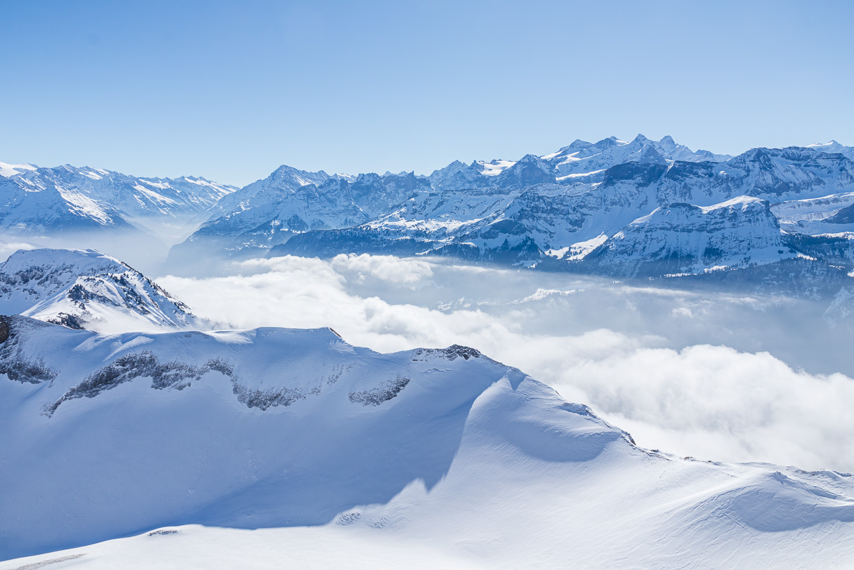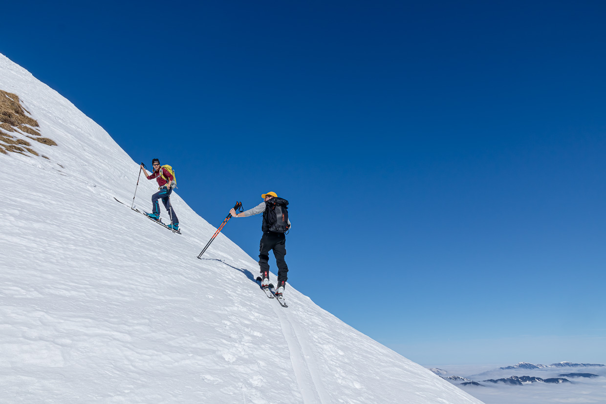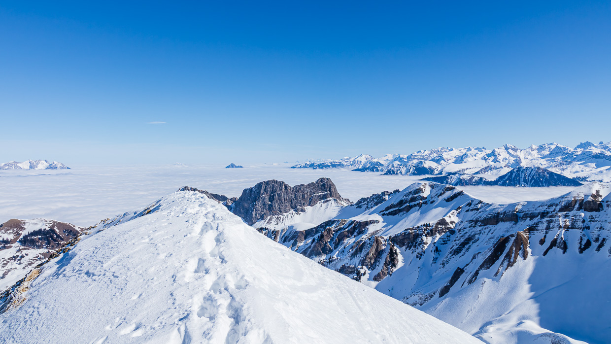 Wir gehen weiter zu Obrist Arni und weiter über den Rücken Richtung Gipfel. Es gibt zahlreiche Möglichkeiten, die Spitzkehre zu üben. Die Gruppe zieht sich in die Länge, aber bald haben alle den Gipfel erreicht. Eine grossartige Aussicht bietet sich uns, wie schon Wochen zuvor auf dem Hengst blicken wir auf zahlreiche Gipfel und ein Nebelmeer über dem Mittelland. Gleich nebenan erhebt sich der Höch Gumme, den wir schon von der anderen Seite von Lungern aus bestiegen haben. Und auf der anderen Seite blicken wir auf das Brienzer Rothorn mit seinem kleinen Skigebiet.