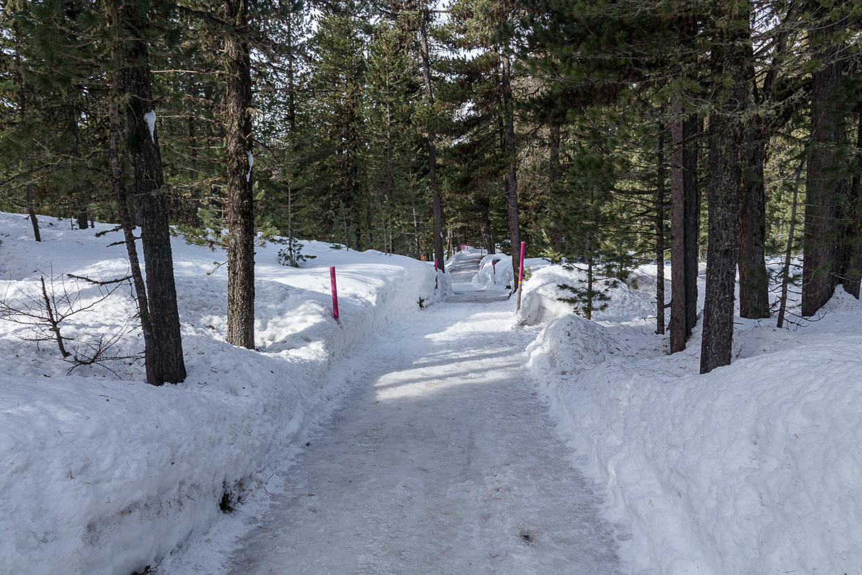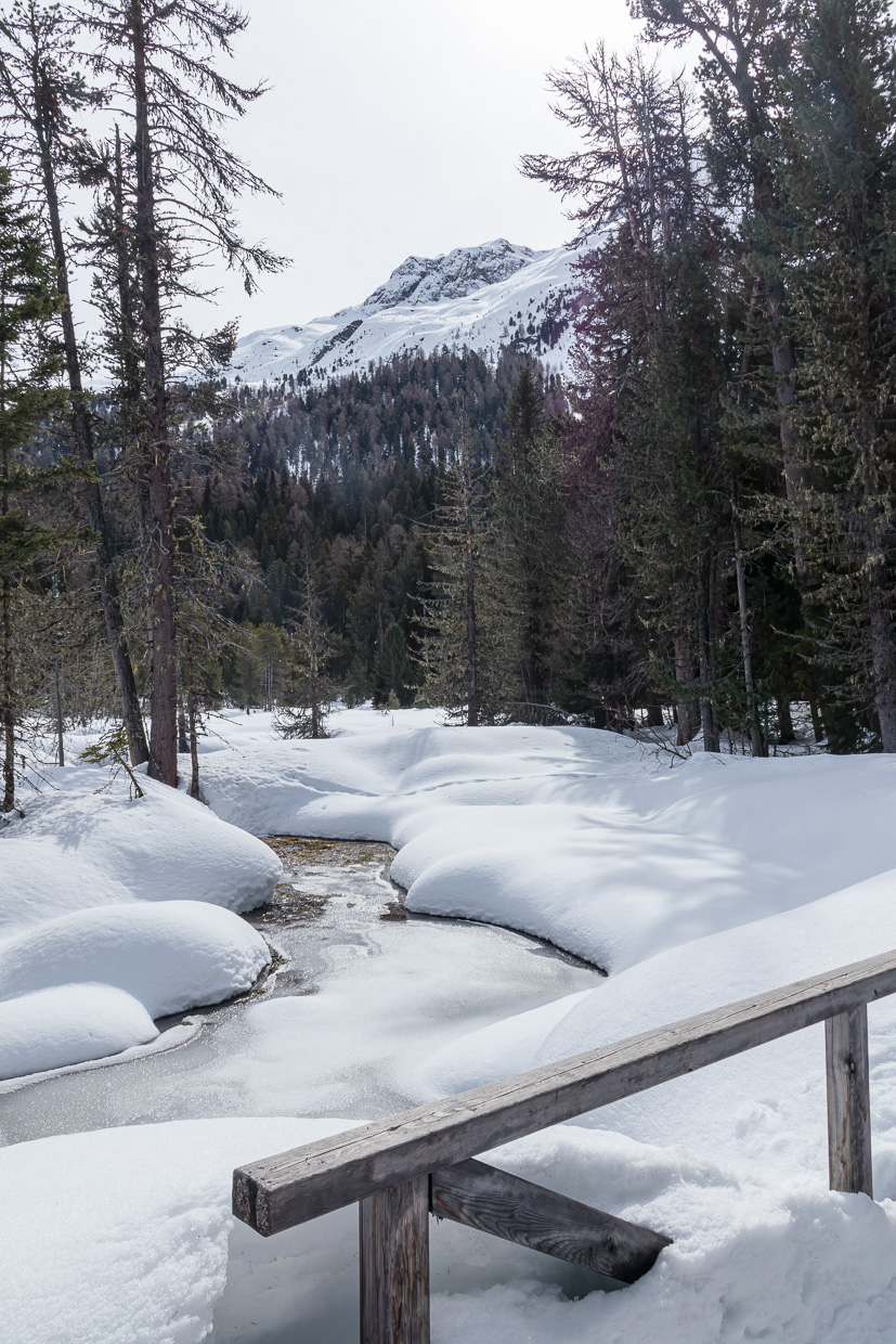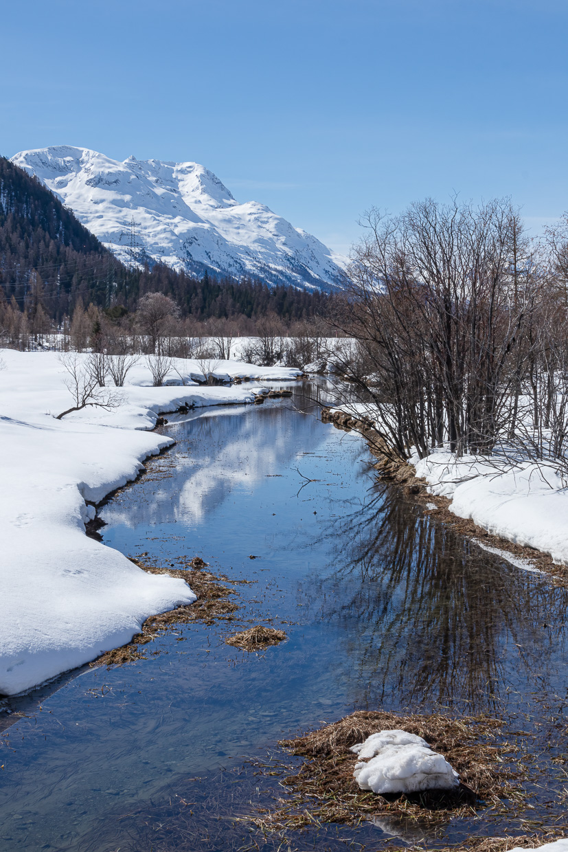 Beim Stazersee folge ich dem Wegweiser Richtung St. Moritz Bad. Der Weg führt durch ein Hochmoor, das man natürlich jetzt nicht sieht, aber es ist wunderschön hier. Allmählich führt der Weg abwärts, bei St. Moritz Bad komme ich aus dem Wald und direkt in die Zuvielisation, es graust mir. Ich suche den Wanderweg zum See, wo ich erstmals raste. Das Eis auf dem See taut allmählich, jedenfalls ist die Pferderennsaison vorbei. Ich steige hoch nach St. Moritz und muss die Nase rümpfen, es stinkt richtiggehend nach Geld. Schnell wieder raus, der Wegweiser führt mich zum Start des Crestaruns, der berühmten Rodelbahn, wo die Verrückten bäuchlings den Eiskanal hinuntersausen. Jetzt allerdings nicht mehr, die Eisbahn ist nur noch ein schmelzender Haufen Schnee. In Celerina ist Endstation, ich fahre mit der Rhb zurück nach Madulain.