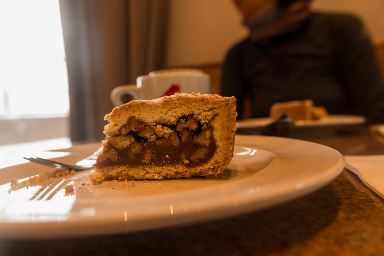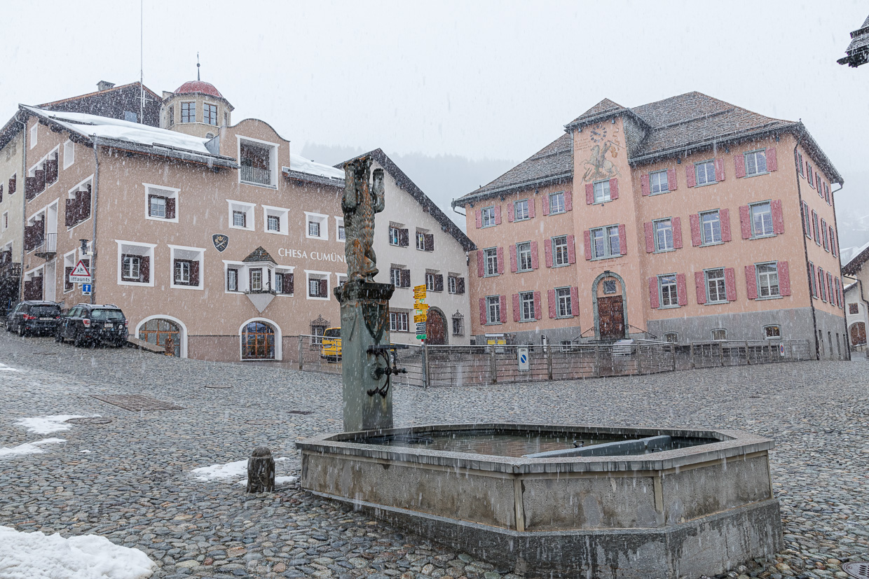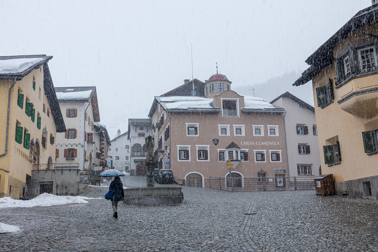 Heute schneit es ergiebig. Da die Frau auch nicht ganz fit, kommt sie bei dem Wetter mit mir mit. Wir machen nur einen kurzen Spaziergang nach Zuoz und geniessen dort ein Stück Engadiner Nusstorte. Zurück gehen wir dem Inn entlang, immer noch bei Schneefall, allerdings ziemlich nassem.