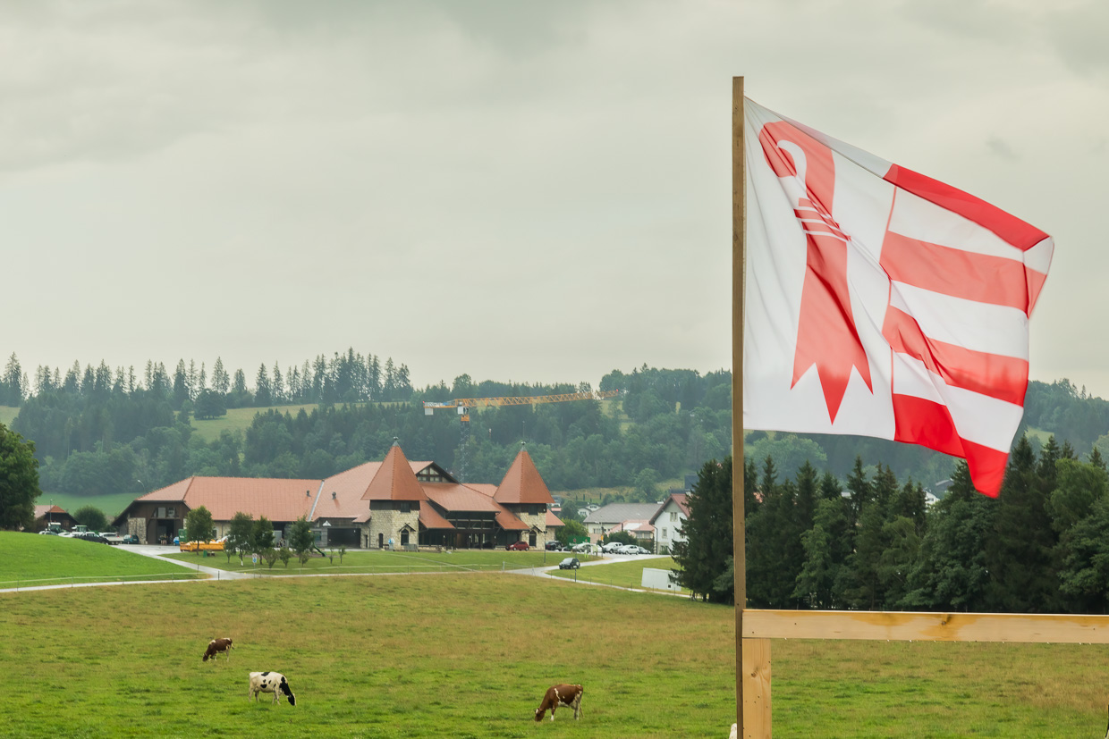 Nach gut drei Stunden ÖV-Fahrt checken wir im Hôtel de la Gare in Saignelégier ein. Nur, um das Gepäck im Zimmer abzuladen und uns umzuziehen. Gleich darauf gehen wir wieder nach draussen, das Ziel ist der Étang des Royes. Wir starten, vorbei an der Halle du Marché-Concours National des Chevaux, dem ehemaligen Zentrum für die Zucht der Freibergerpferde. Heute wird die Halle für verschiedene Aktivitäten verwendet.