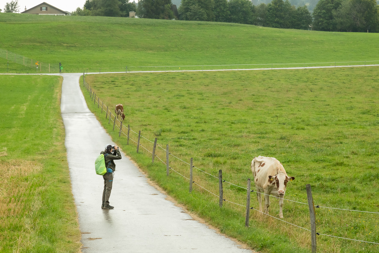 Die dunklen Wolken mahnen uns, den Rückweg anzutreten. Wir schlagen einen anderen ein, überqueren Pferdeweiden. Bald beginnt es zu regnen, aber darauf sind wir ja vorbereitet, ziehen die Regenjacken an. Im strömenden Regen streben wir nun strammen Schrittes Saignelégier zu. Kurz davor ist das Gewitter auch schon wieder vorbei, wir aber nass, jedenfalls die Hosen. Eine gute Gelegenheit, sich im örtlichen Café bei K.u.K (Kaffee und Kuchen) aufzuwärmen.