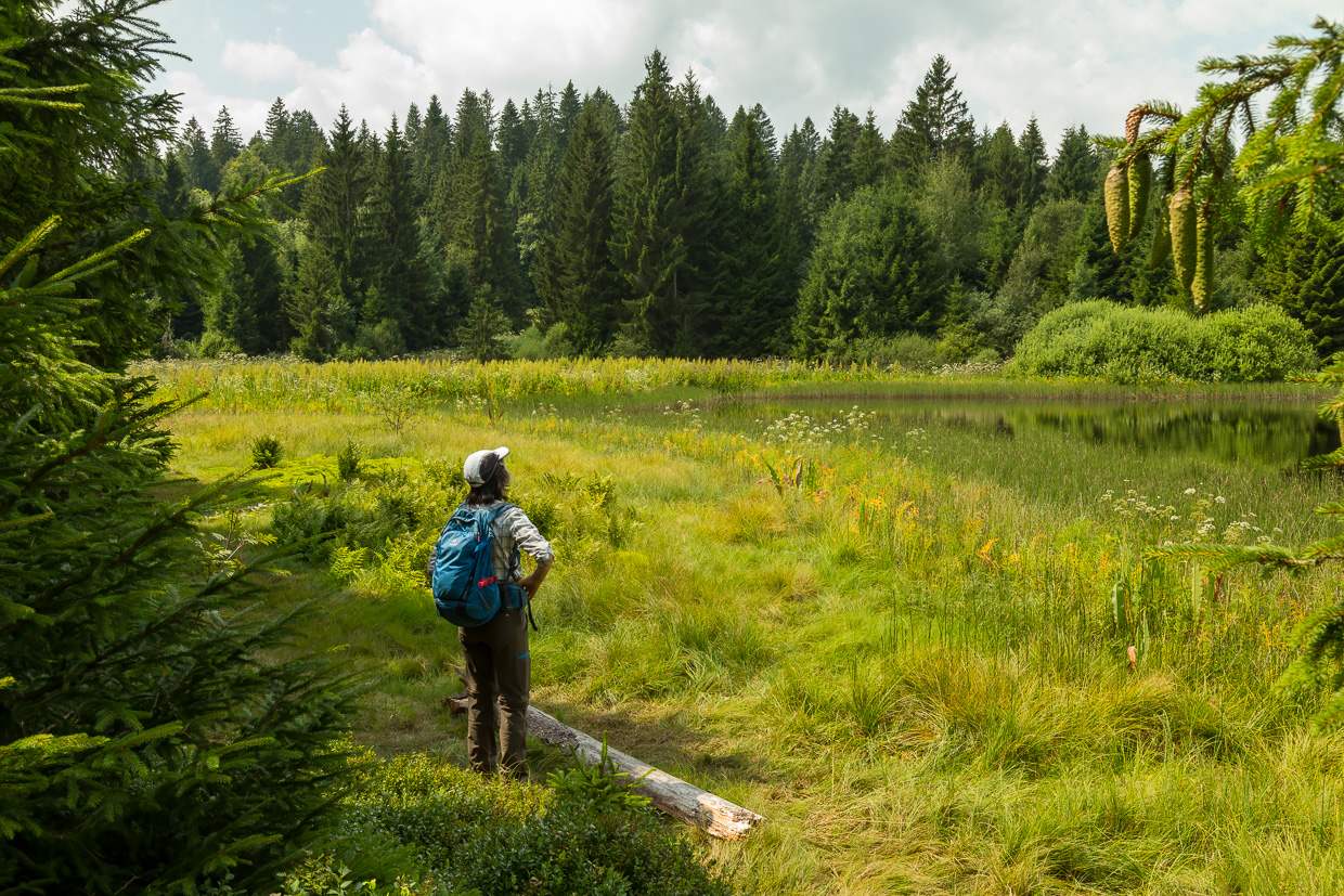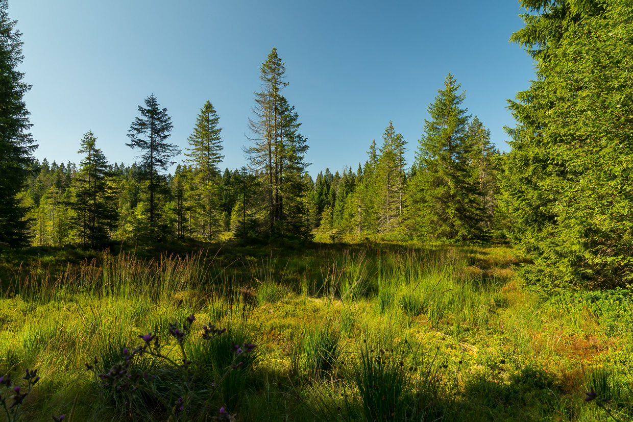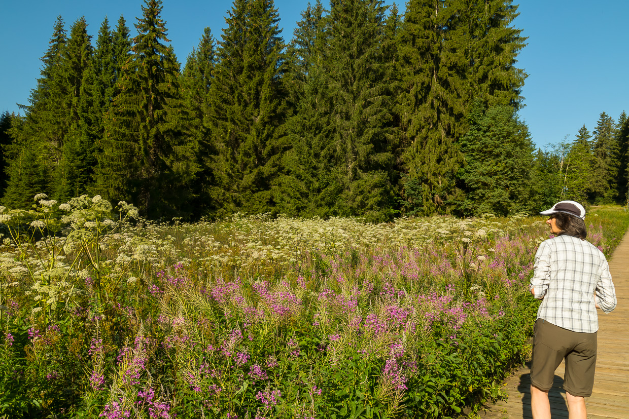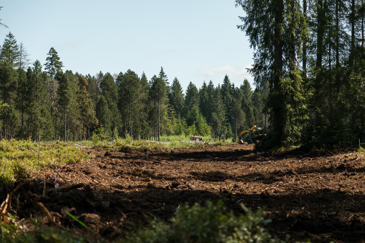 Der Weg führt fast immer durch den Wald, was bei diesen heissen Temperaturen angenehm ist. In einer Lücke blickt man auf eine Kahlschlagfläche, darauf grosse Baumaschinen. Und das in einem Naturschutzgebiet! Aber ein Plakat klärt auf: Ursprünglich war hier eben ein Hochmoor, das aber entwässert und mit Fichten bepflanzt wurde. Nun wird versucht, den ursprünglichen Zustand wieder herzustellen, was halt sehr martialisch aussieht.