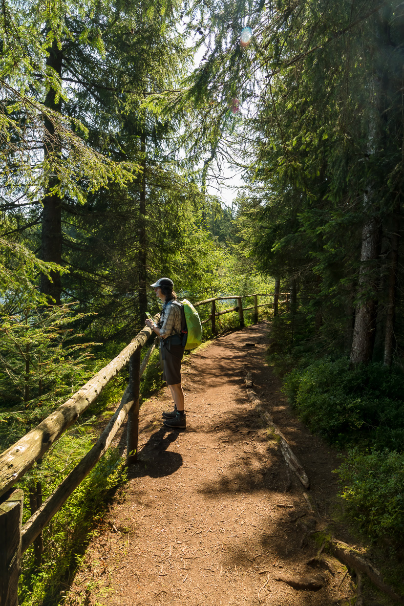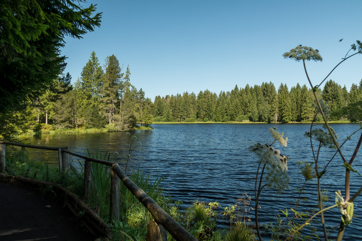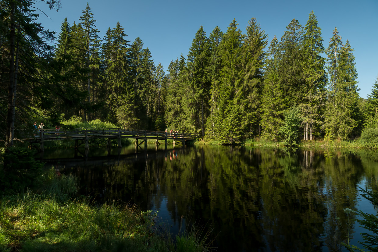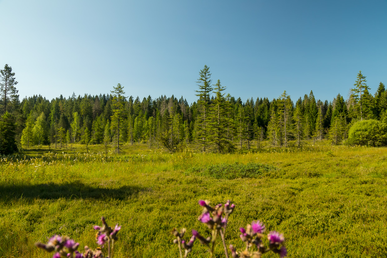 Der Weg führt fast immer durch den Wald, was bei diesen heissen Temperaturen angenehm ist. In einer Lücke blickt man auf eine Kahlschlagfläche, darauf grosse Baumaschinen. Und das in einem Naturschutzgebiet! Aber ein Plakat klärt auf: Ursprünglich war hier eben ein Hochmoor, das aber entwässert und mit Fichten bepflanzt wurde. Nun wird versucht, den ursprünglichen Zustand wieder herzustellen, was halt sehr martialisch aussieht.