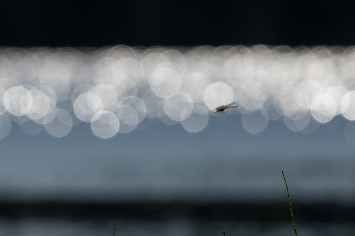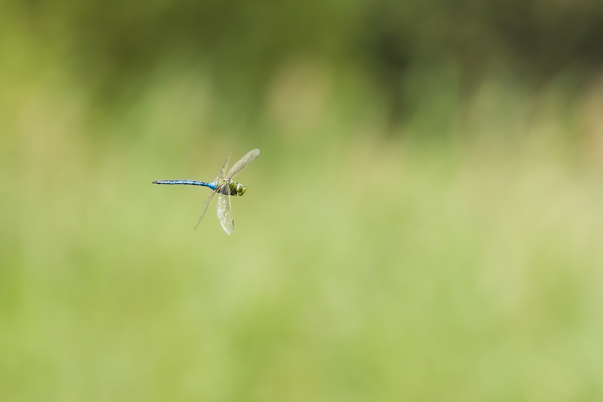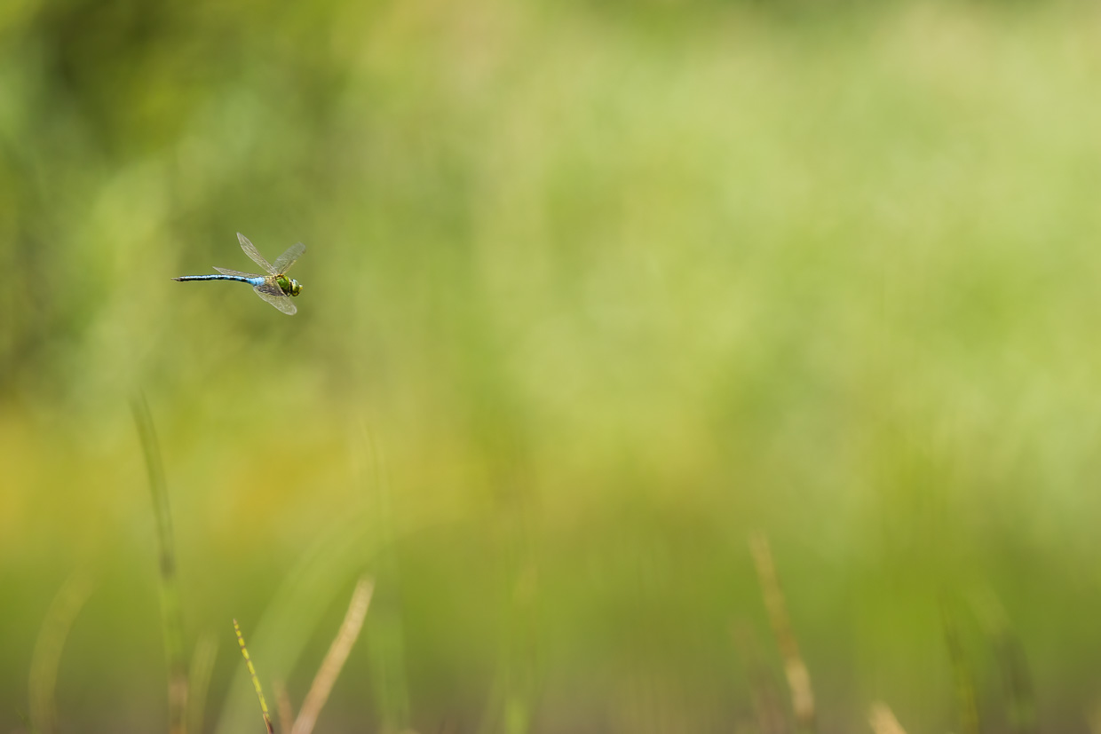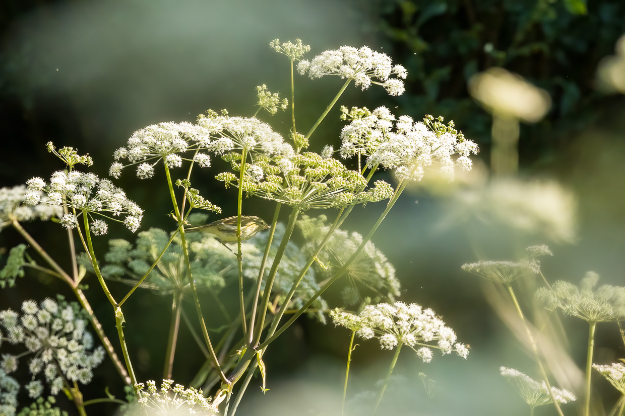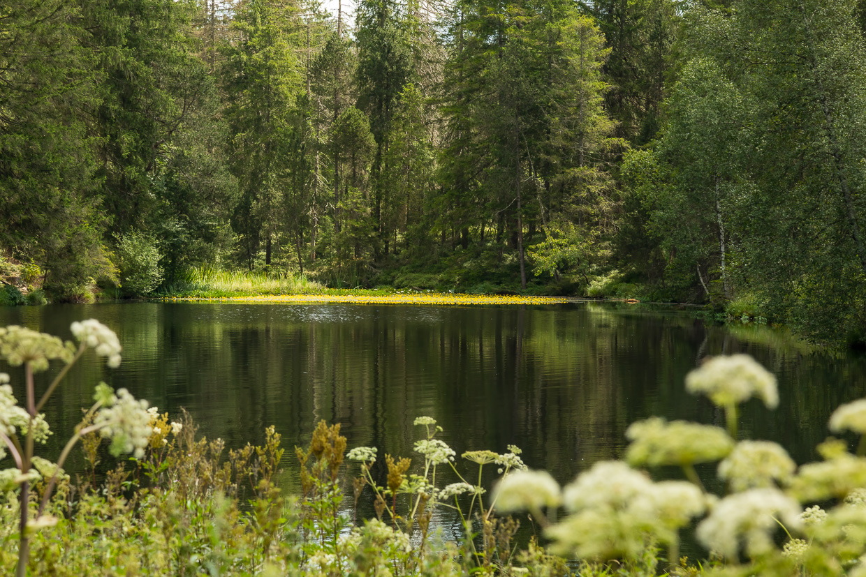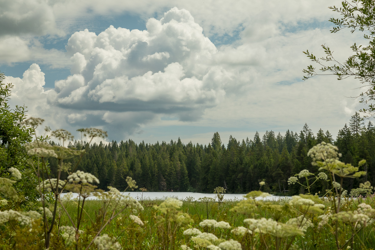 Wir erreichen das Naturschutzgebiet. Der Holzsteg führt durch eine Wiese mit blühendem Wiesenkerbel, worin sich Mönchsgrasmücken und Zilpzalpe tummeln. Ennet dem kleinen Wald erstreckt sich auf der einen Seite das Moor, das an Skandinavien erinnert, auf der anderen Seite glitzert der Étang de la Gruère. Libellen flitzen auch hier herum, Vierfleck, Grosse Königslibelle und andere.