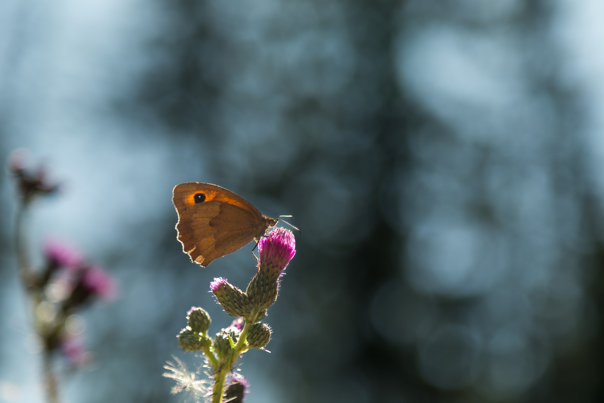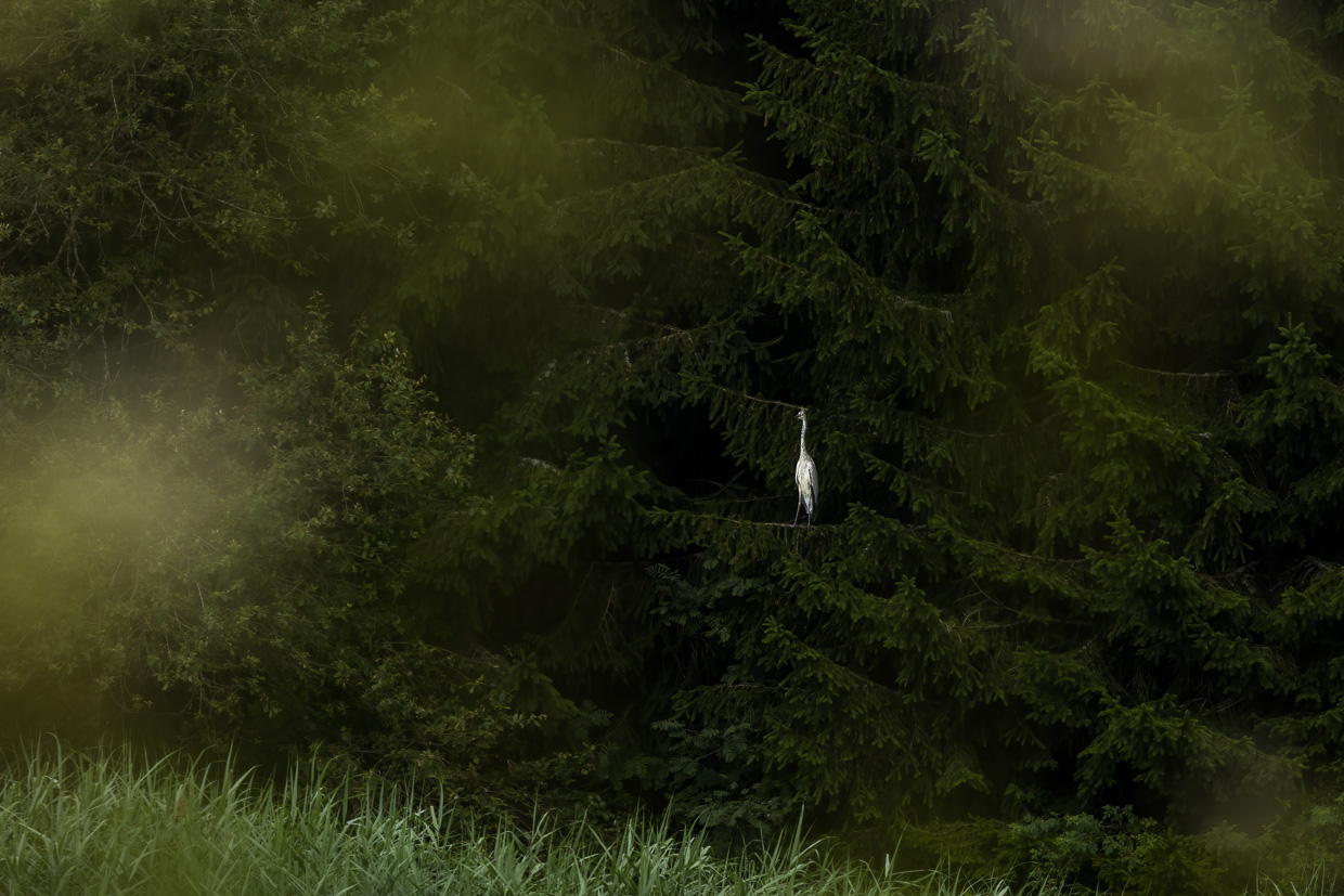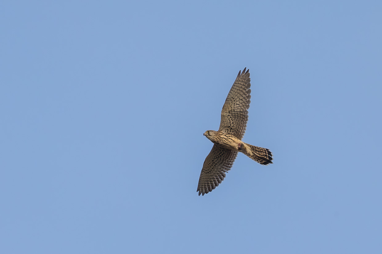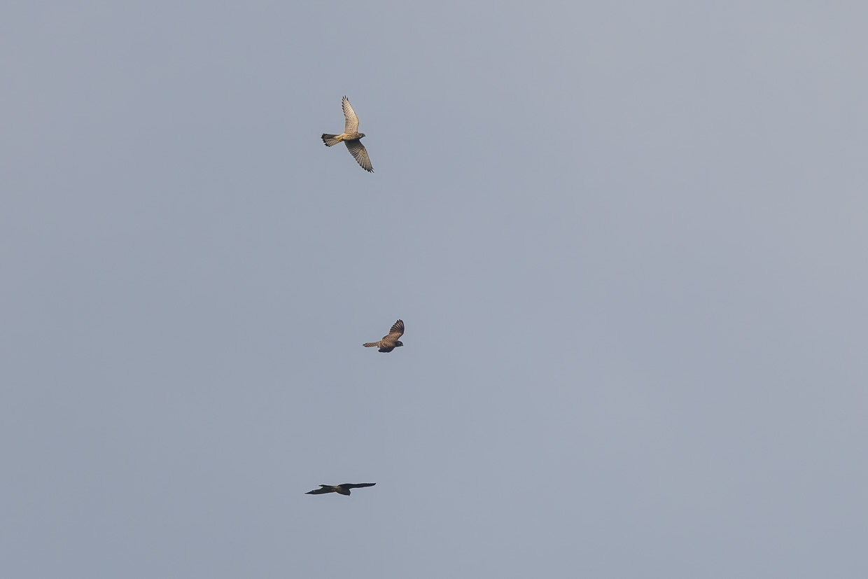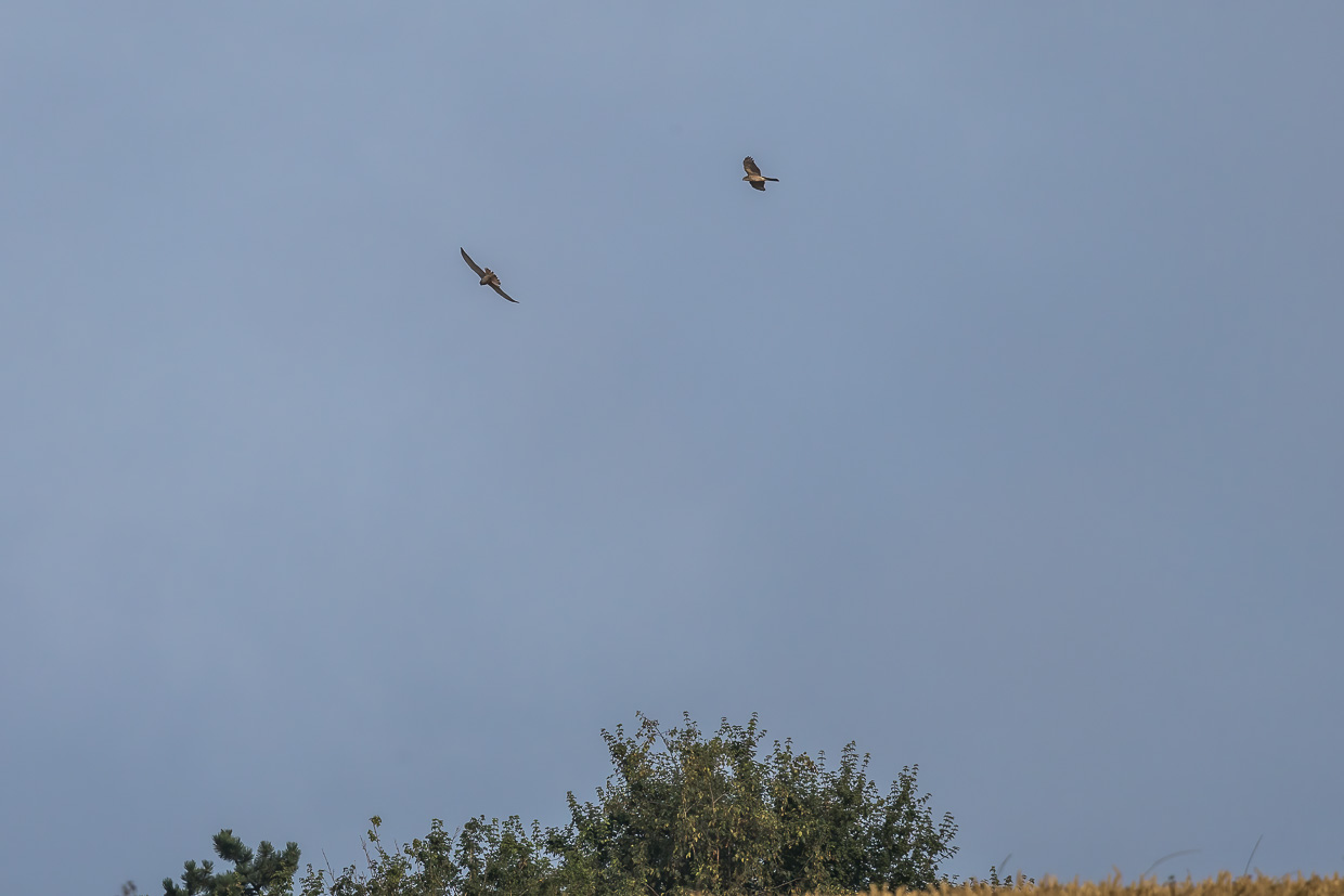 Am Morgen stehen wir früh auf und unternehmen einen kleinen Spaziergang. Die Nacht davor hat es geregnet, über den Wäldern hängt Nebel. Ein Sperber legt sich mit einem Turmfalken an, der sein Revier verteidigt. Weitere drei Turmfalken sehen wir über dem Wald. Offenbar hatten sie eine erfolgreiche Brut.
