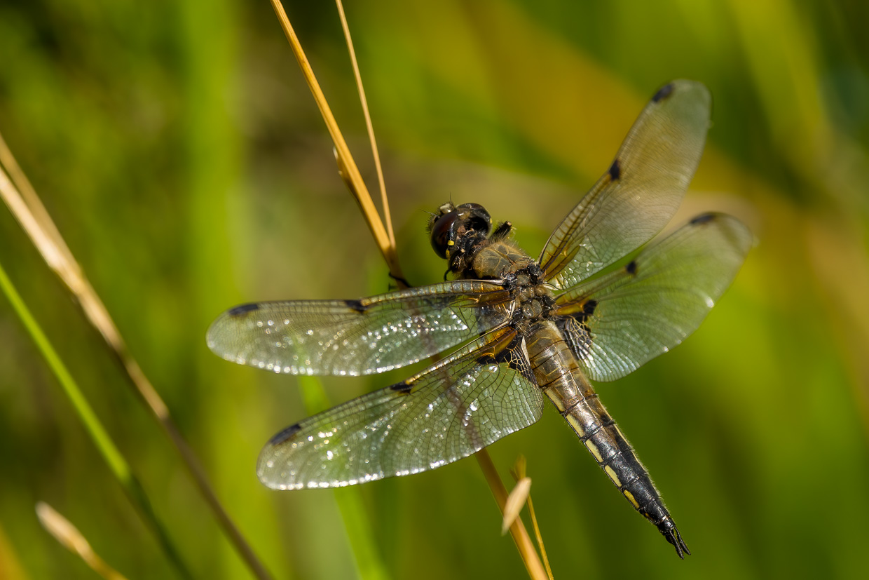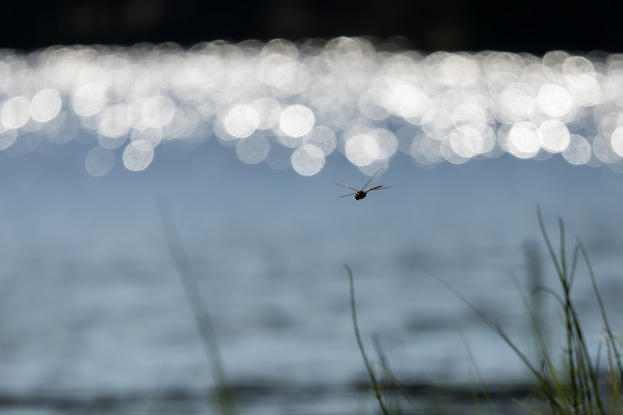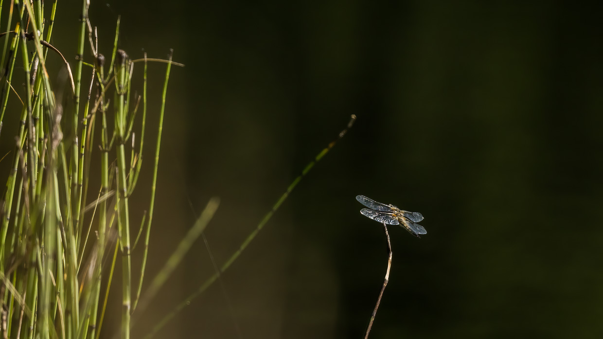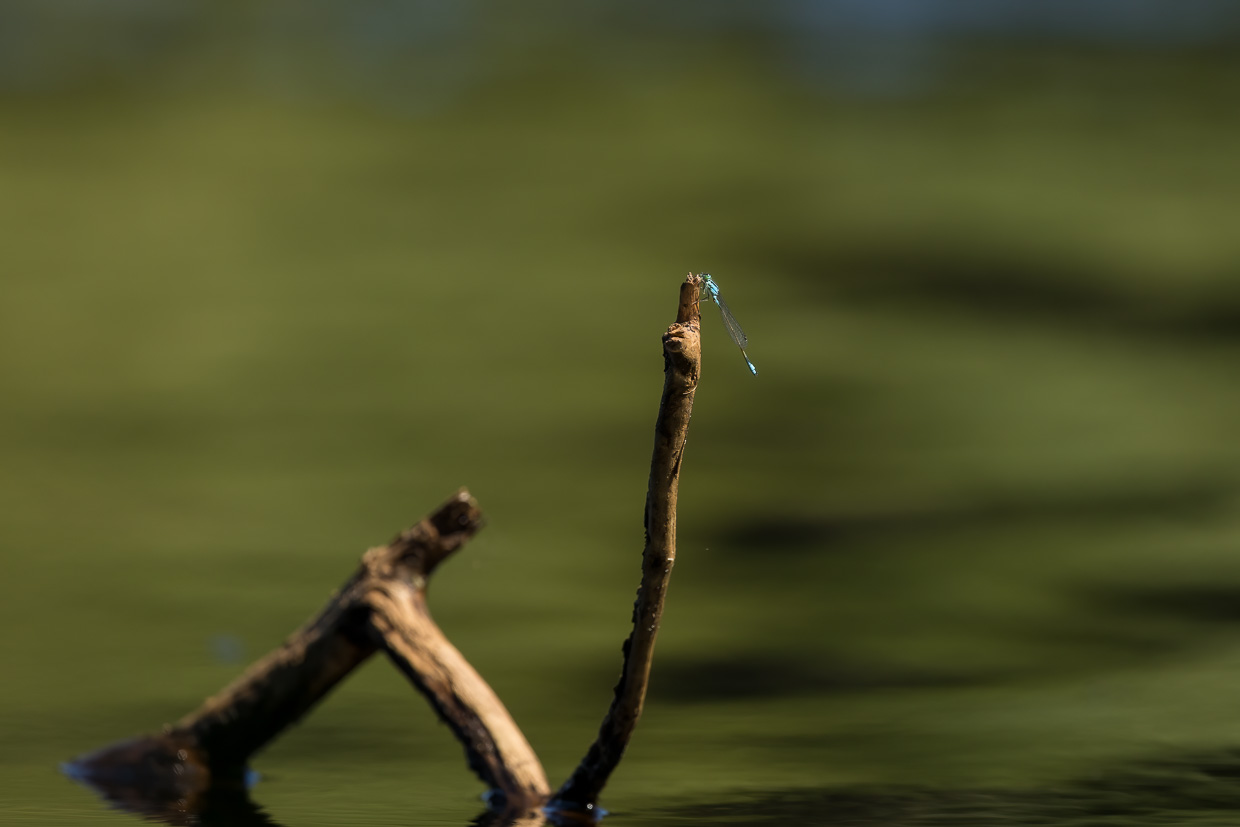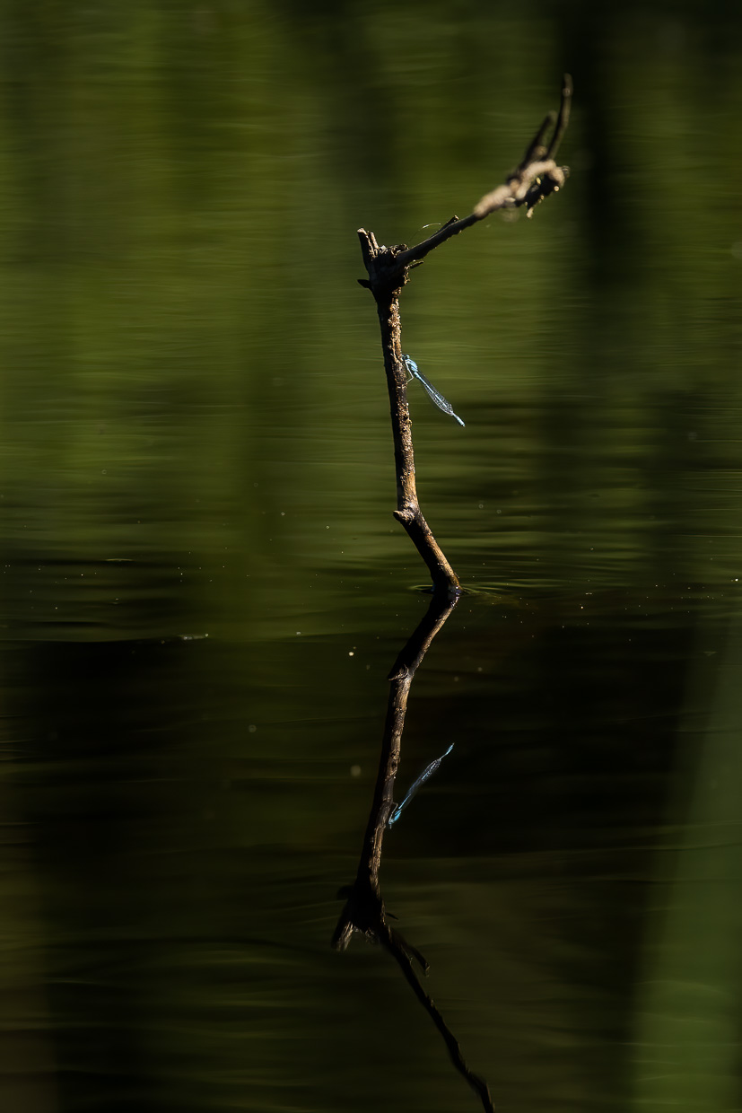 Wir verweilen längere Zeit hier, bevor wir den Rundweg fortsetzen. Eine Brücke überquert eine Bucht des Étang. Von dort oben kann man ins dunkelbraune Moorwasser blicken, worin grosse Karpfen schwimmen. Man wähnt sich in Schweden mit den fichtengesäumten Ufern. An einem Plätzchen am See finden wir wieder Libellen, denen ich Zeit widme. Diesmal sind es Azurjungfern und Vierfleck.