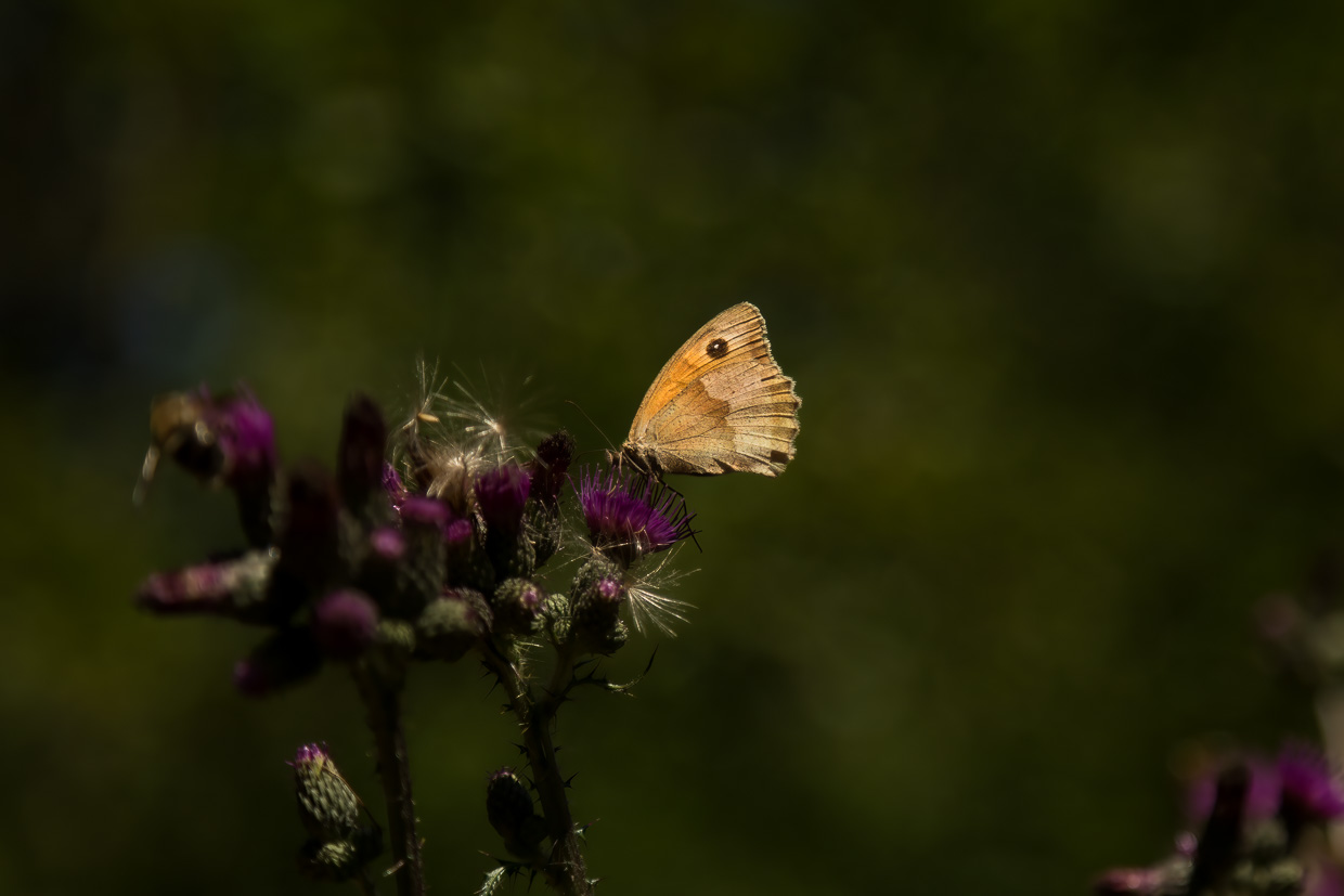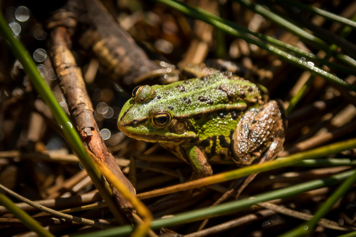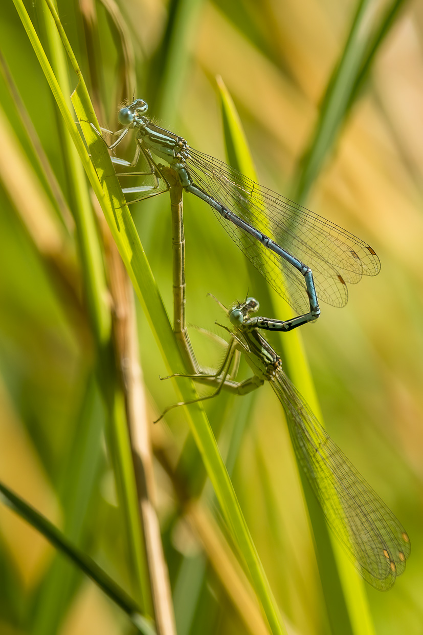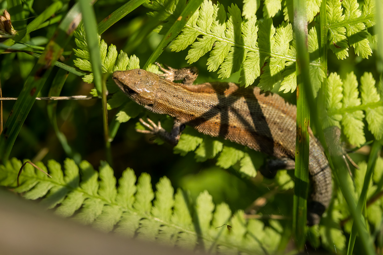 Wir verweilen längere Zeit hier, bevor wir den Rundweg fortsetzen. Eine Brücke überquert eine Bucht des Étang. Von dort oben kann man ins dunkelbraune Moorwasser blicken, worin grosse Karpfen schwimmen. Man wähnt sich in Schweden mit den fichtengesäumten Ufern. An einem Plätzchen am See finden wir wieder Libellen, denen ich Zeit widme. Diesmal sind es Azurjungfern und Vierfleck.