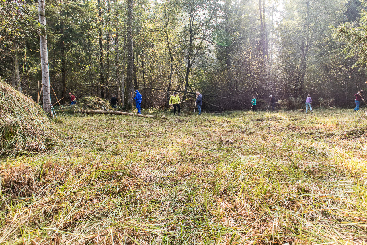 Die Schneide brach an der Stelle, an der sie schon mal gelötet wurde. Ich fasste eine andere Sense, wir machten zu zweit weiter, während die anderen das Gras stapelten wie beim Weiher, unten Äste, darauf das Gras. Wir kamen schnell vorwärts, so dass wir schon bald fertig waren und uns eine verdiente Verpflegung gönnen durften.