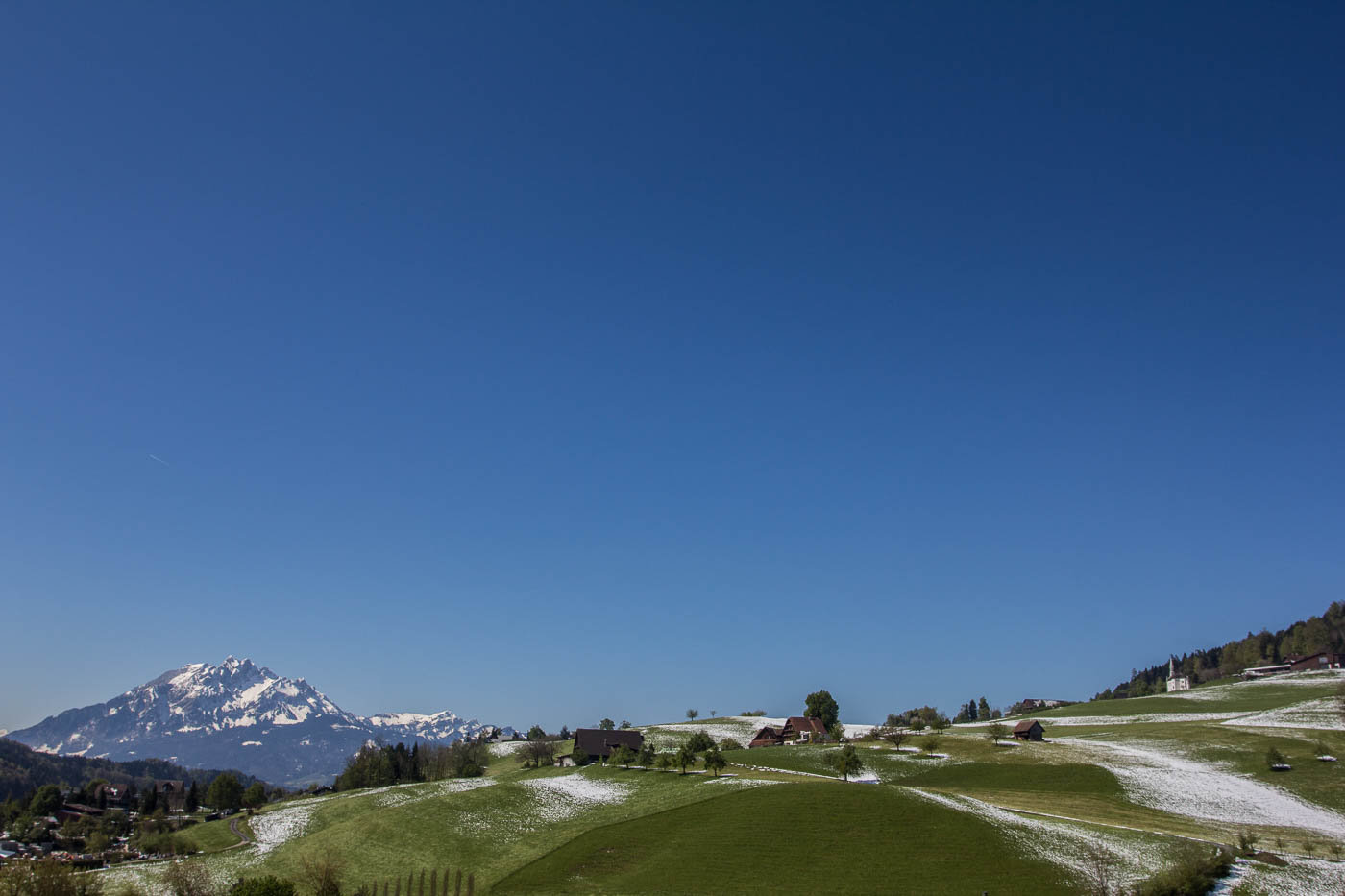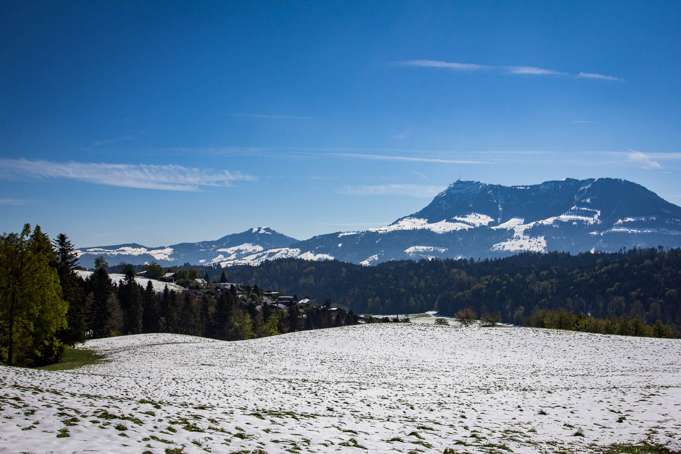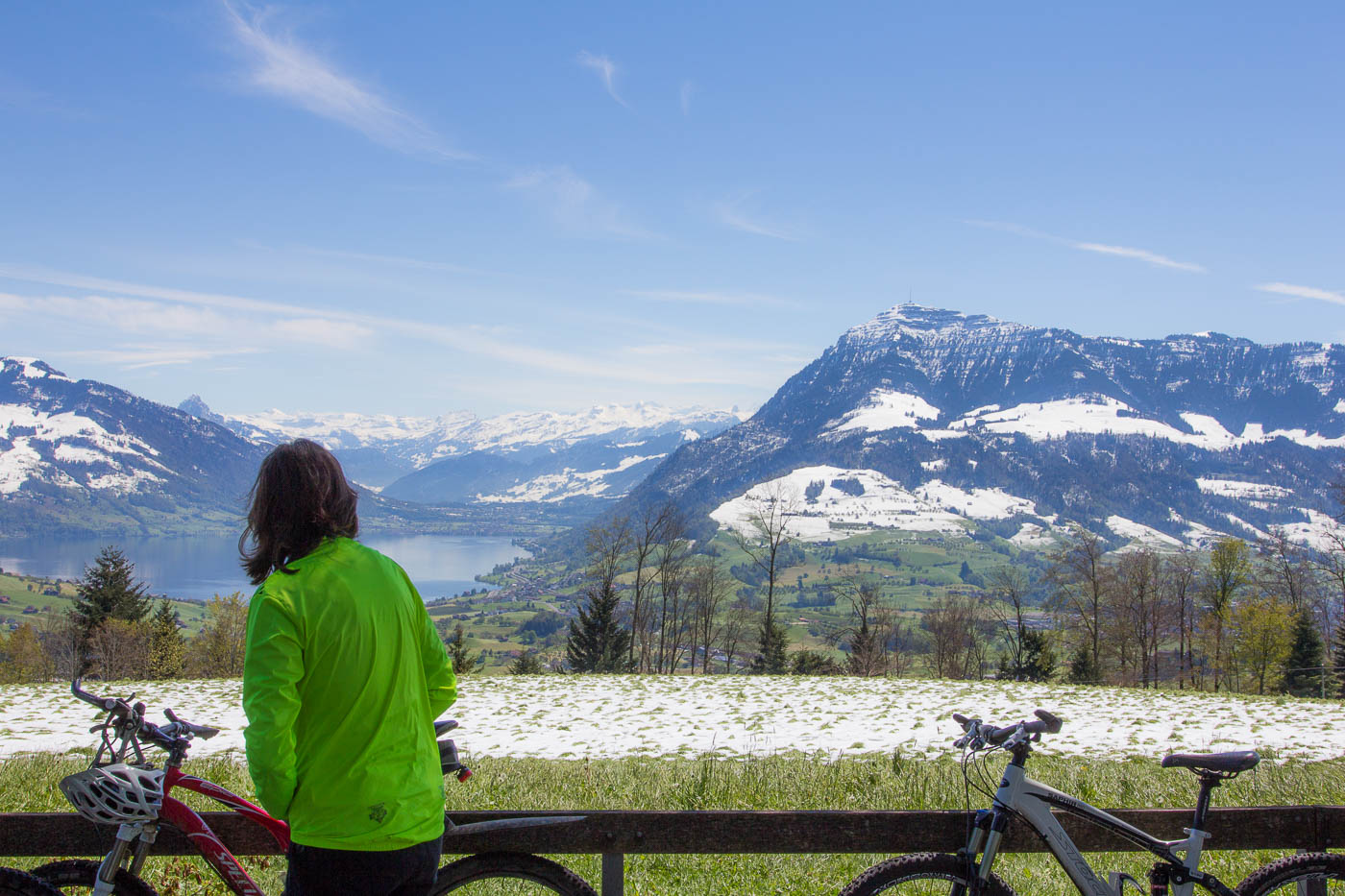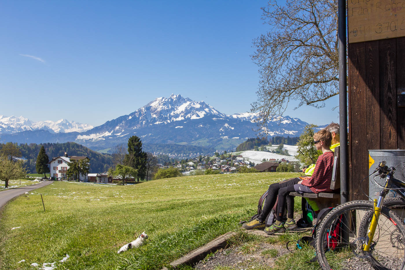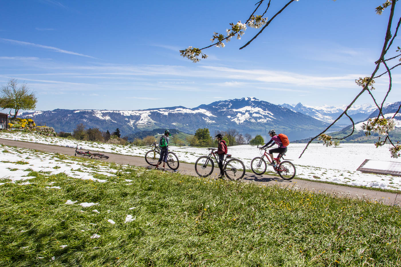 Dieser ist aber schnell vorbei, auf der Hauptstrasse fahren wir nach Adligenswil und durch dieses hindurch, bevor wir auf einer Nebenstrasse hochfahren und auf gut 600 Meter eine erste Pause machen. Von hier hat man wieder eine tolle Aussicht auf Pilatus und Rigi. Wir fühlen uns wie auf einem riesigen Balkon. Aber wir sind jetzt auch im Schnee. Am 30. April, auf 600 Meter, auf der Südseite.