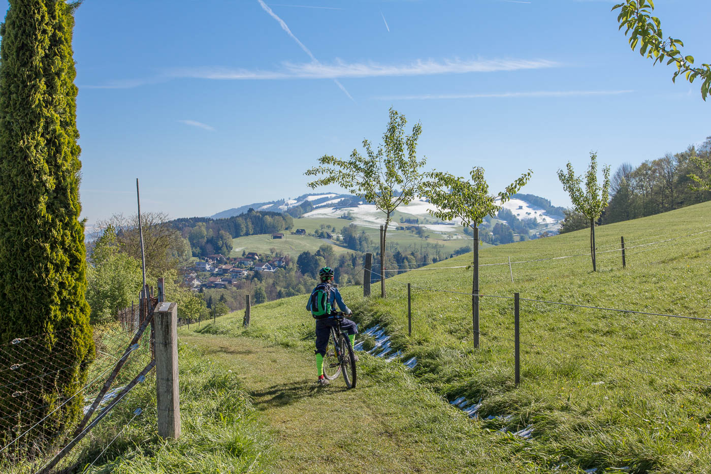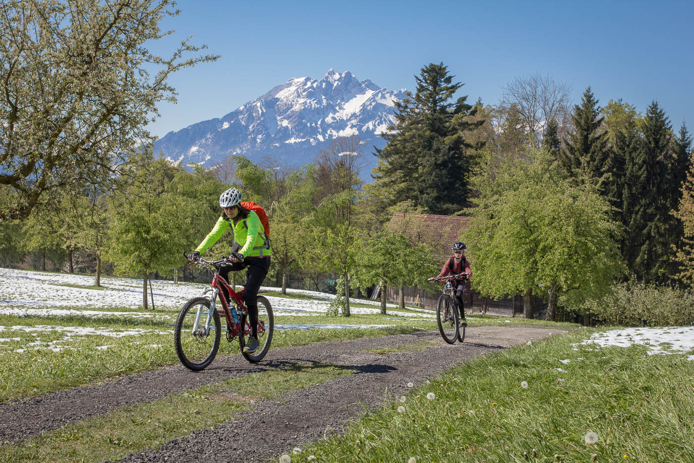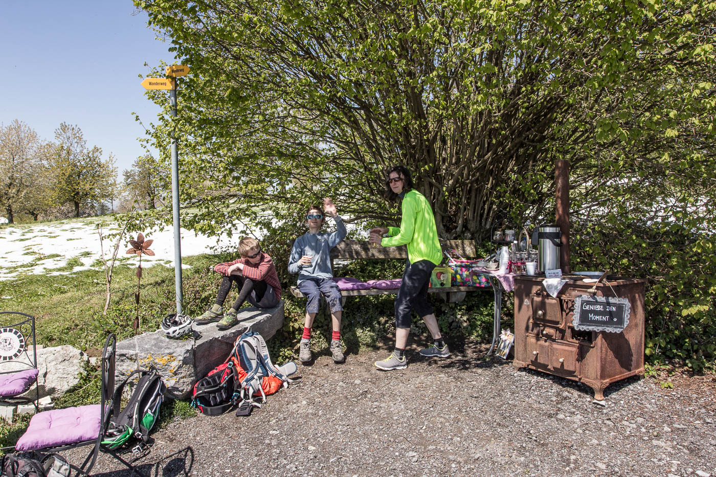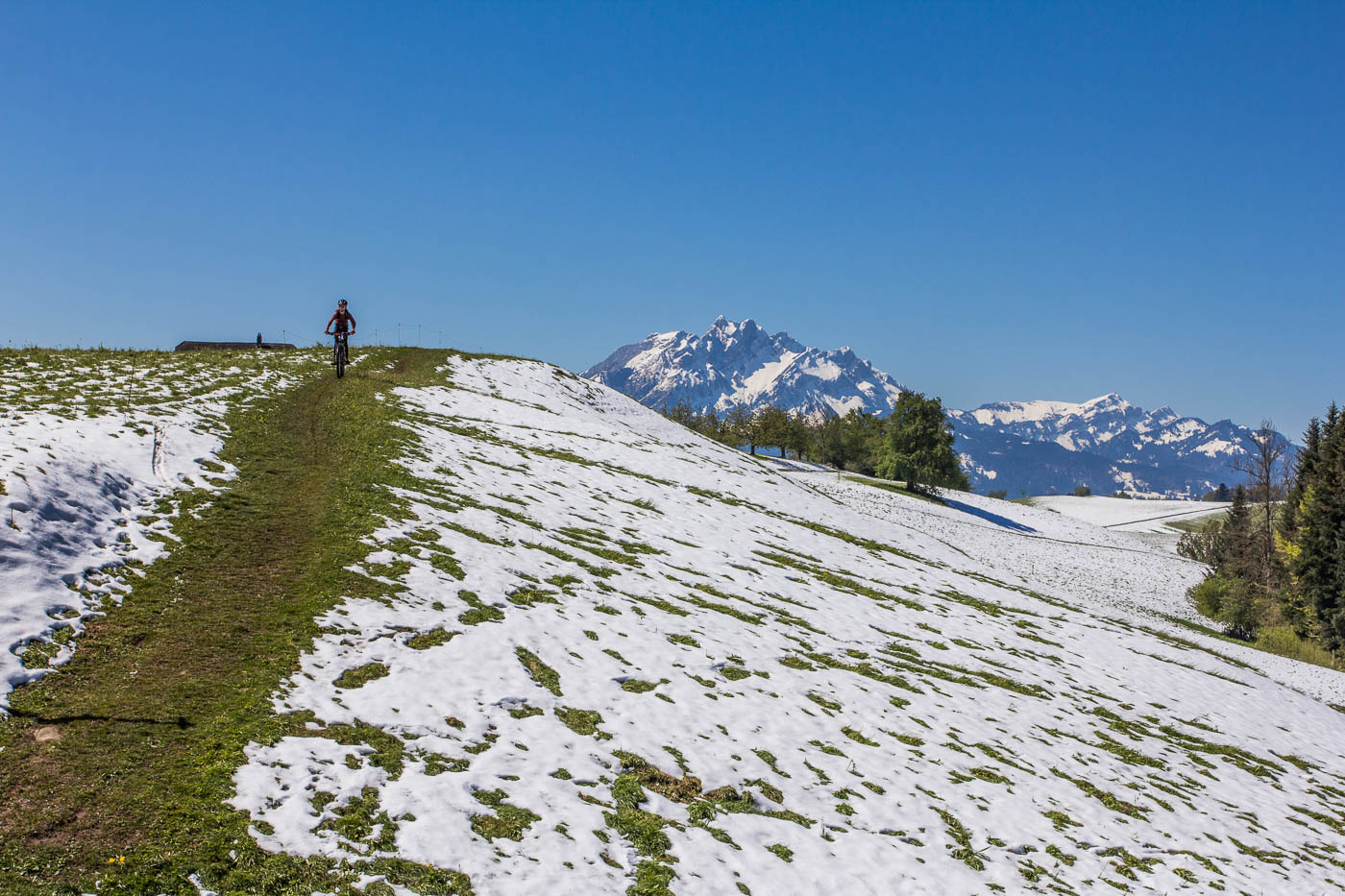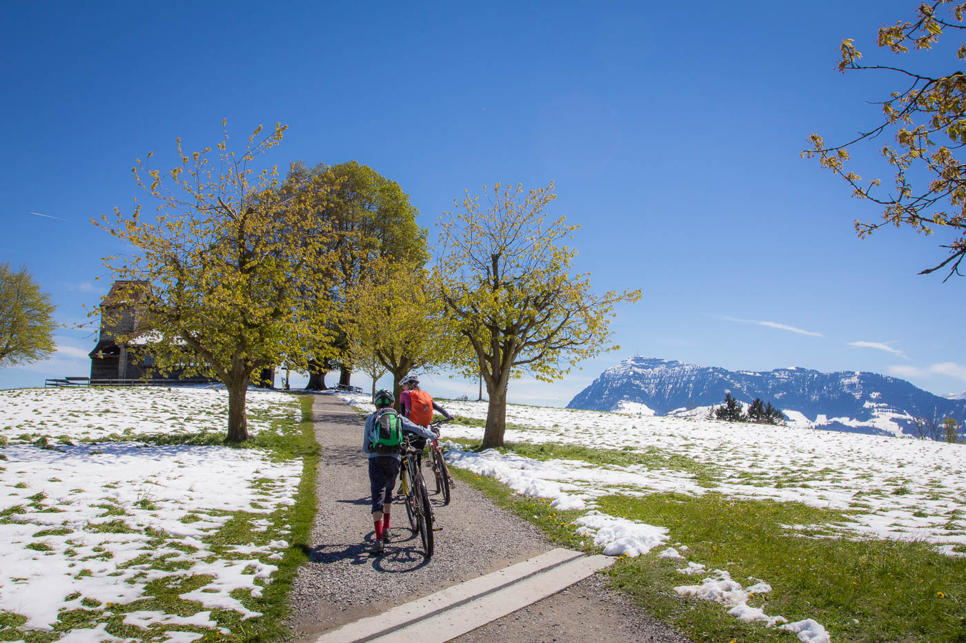 Wir fahren abwärts nach Udligenswil (ja, besonders fantasievoll sind sie nicht bei den Ortsnamen, die Luzerner), nehmen den Wanderweg ins Dorf, was wohl nicht die beste Idee ist, denn auf diesem liegt ebenfalls noch Schnee, aber es ist machbar. Wir müssen unseren Jüngsten dazu motivieren, für den Schlussanstieg zum Michaelskreuz noch durchzubeissen. Der Weg ist steil, wir schieben, die Frau und ich übernehmen abwechslungsweise sein Bike. Oben auf einer Strasse angekommen, haben wir es geschafft. Na ja, fast. Es geht mehr oder weniger geradeaus, aber beim Houenhof ist Schluss damit. Ein nettes Besenbeizli lädt zu einer Pause ein, nochmals stärken für das letzte Stück zum Michaelskreuz. Wanderer kommen vorbei und warnen uns, dass es da Schnee hat, dreckig und nass ist. Die Augen des Älteren beginnen zu leuchten. Der Weg ist tatsächlich sumpfig, nass und voller Schnee – die Essenz des Bikens. Das letzte Wegstück führt auf einer trockenen Strasse abwärts zum Restaurant.