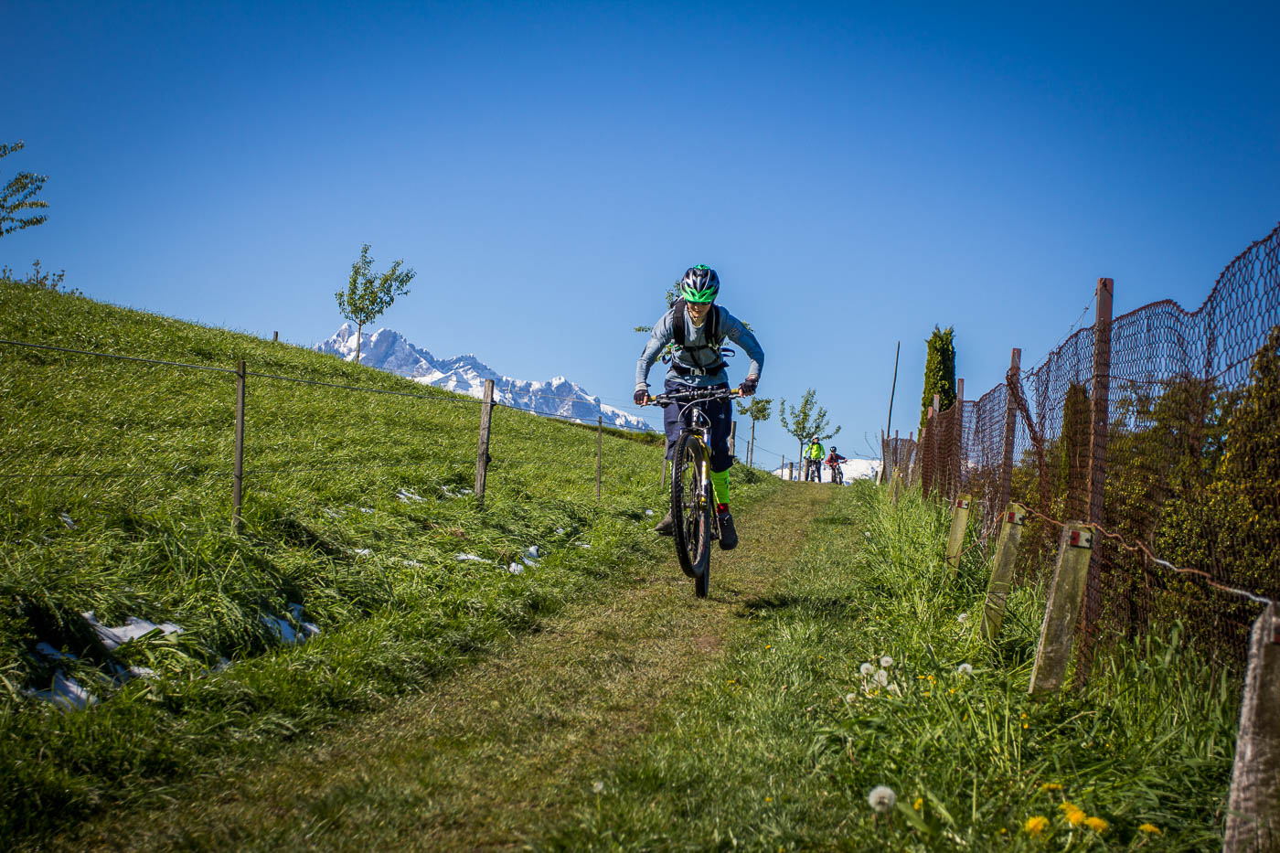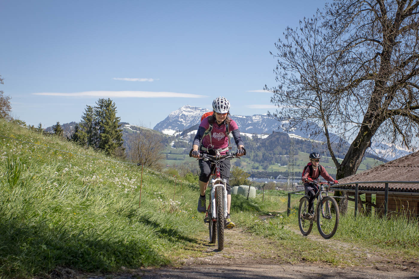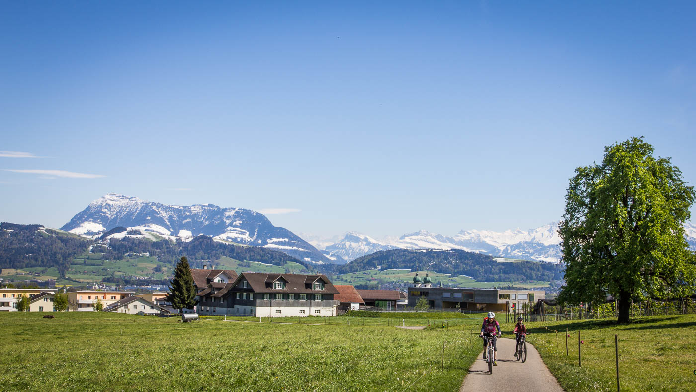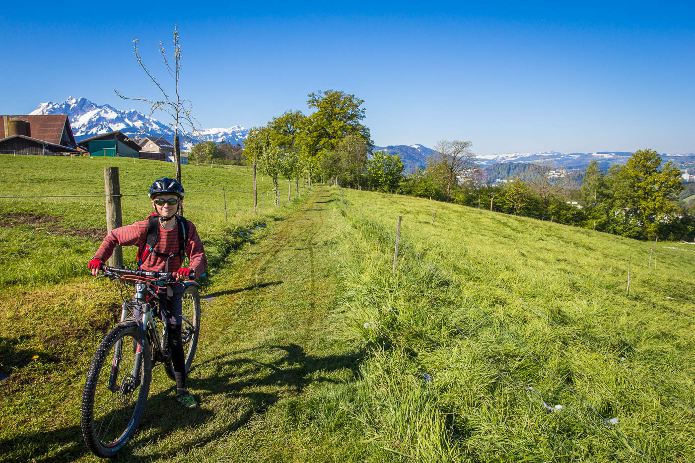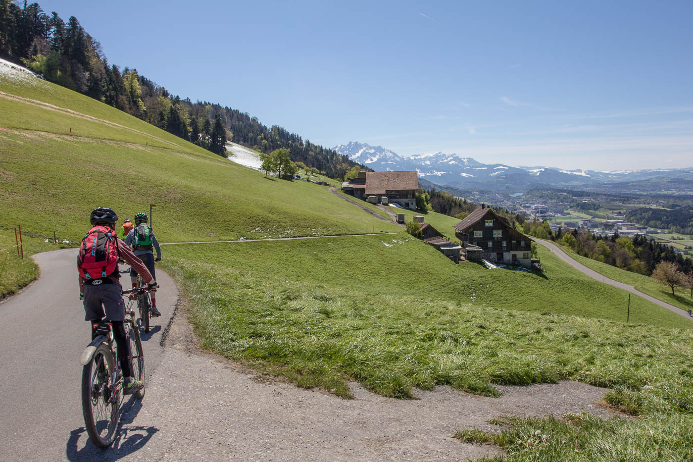 Wir fahren mit dem Zug nach Luzern zum Start der Biketour. Zwischen Eschenbach und Emmenbrücke erblicken wir den Hügelzug, den wir überqueren wollen. Und der ist – weiss! Schnee bis unten, und das am 30. April! Ich setze darauf, dass die Südseite aper ist. Luzern lassen wir möglichst schnell hinter uns. Dieser Verkehr! Und dann muss man immer noch aufpassen, dass man nicht aus Versehen von einem Touristen mit dem Selfistick geschlagen wird. Schnell wird es ruhiger, aber auch zünftig steil. Bald blicken wir auf Luzern hinunter, die Aussicht in die Berge ist auch schon ganz passabel. Wir umfahren den Hombrig links, es geht abwärts Richtung Ebikon. Nass ist es wegen der Schneeschmelze und entsprechend dreckig, die Kinder haben dafür umso mehr Spass.