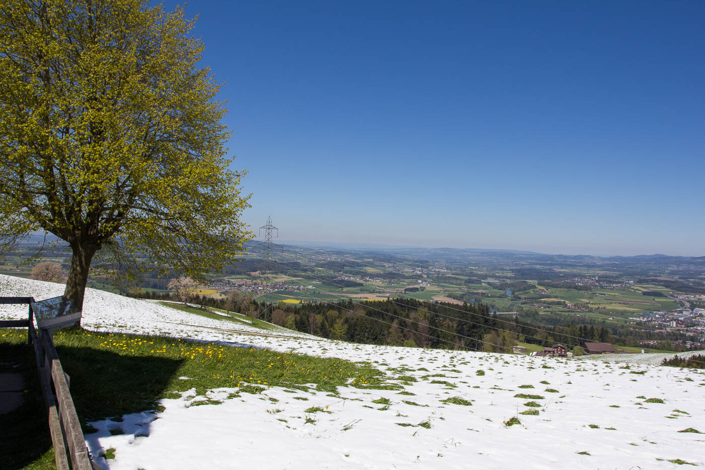 Zuerst wollen wir aber zu diesem vielgerühmten Aussichtspunkt. Der verspricht tatsächlich nicht zuviel, wunderbar die Aussicht auf Zugerberg, Rossberg, Mythen, Rossstock, Rigi, Stanserhorn und viele mehr. Auf der anderen Seite blickt man weit ins Mittelland, unser Hausberg, der Homberg, ist ebenso zu sehen wie die Lägern und der Üetliberg. Und weit hinten, ebenfalls schneebedeckt, sehen wir den Feldberg, vom Dunst schon fast verschluckt zeichnet sich schemenhaft die Jurakette ab. Nicht minder beeindruckend ist die riesige Linde vor der Kapelle, die wohl mehrere Jahrhundert alt ist. Nun ist aber ein Besuch des Restaurants fällig, wir müssen die verbrannten Kalorien ersetzen, vor allem der Jüngste, der am Abend vorher kaum etwas gegessen hat, was sich jetzt rächt. Das Restaurant ist gut besucht, aber nicht so voll wie befürchtet.