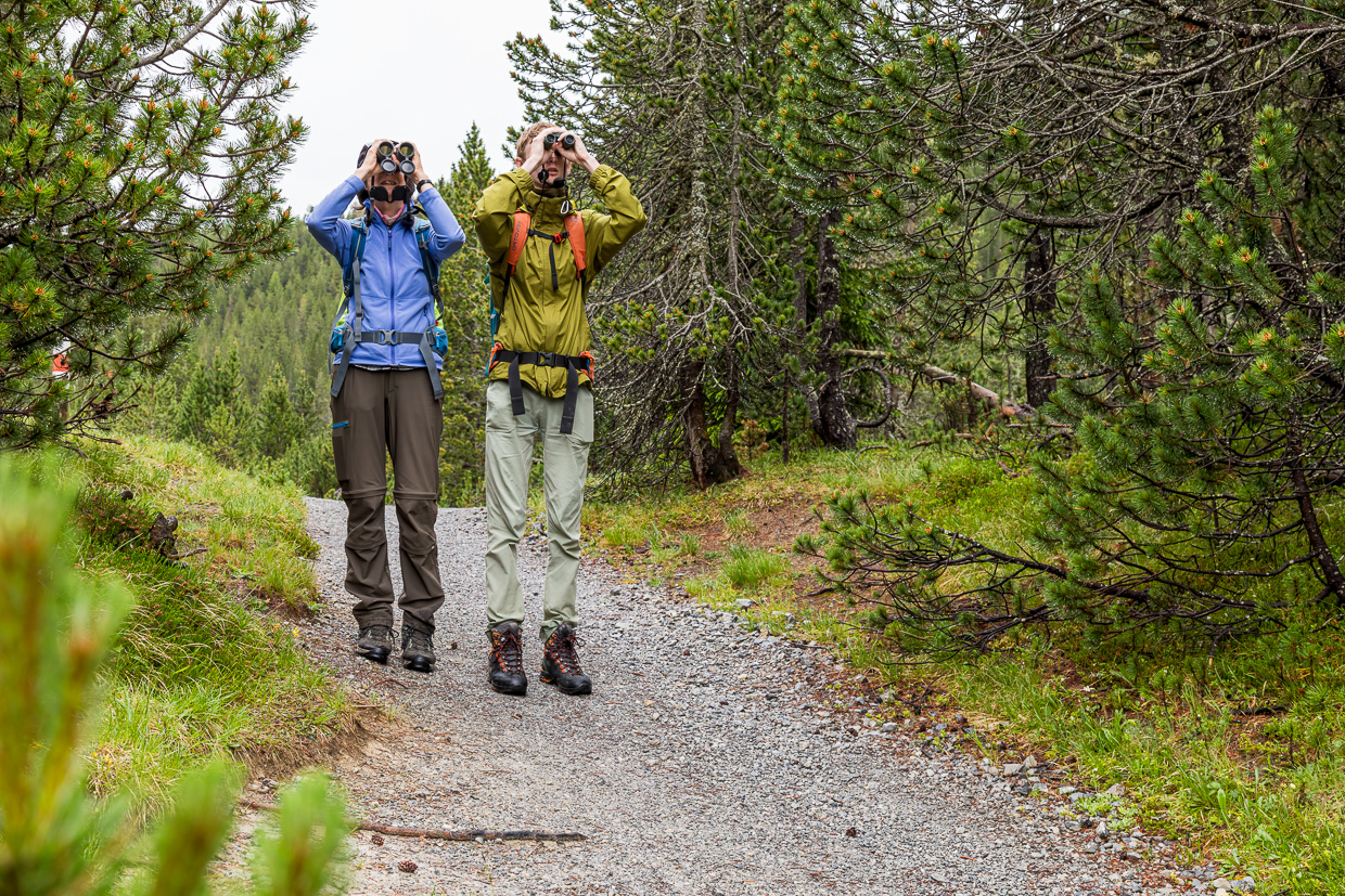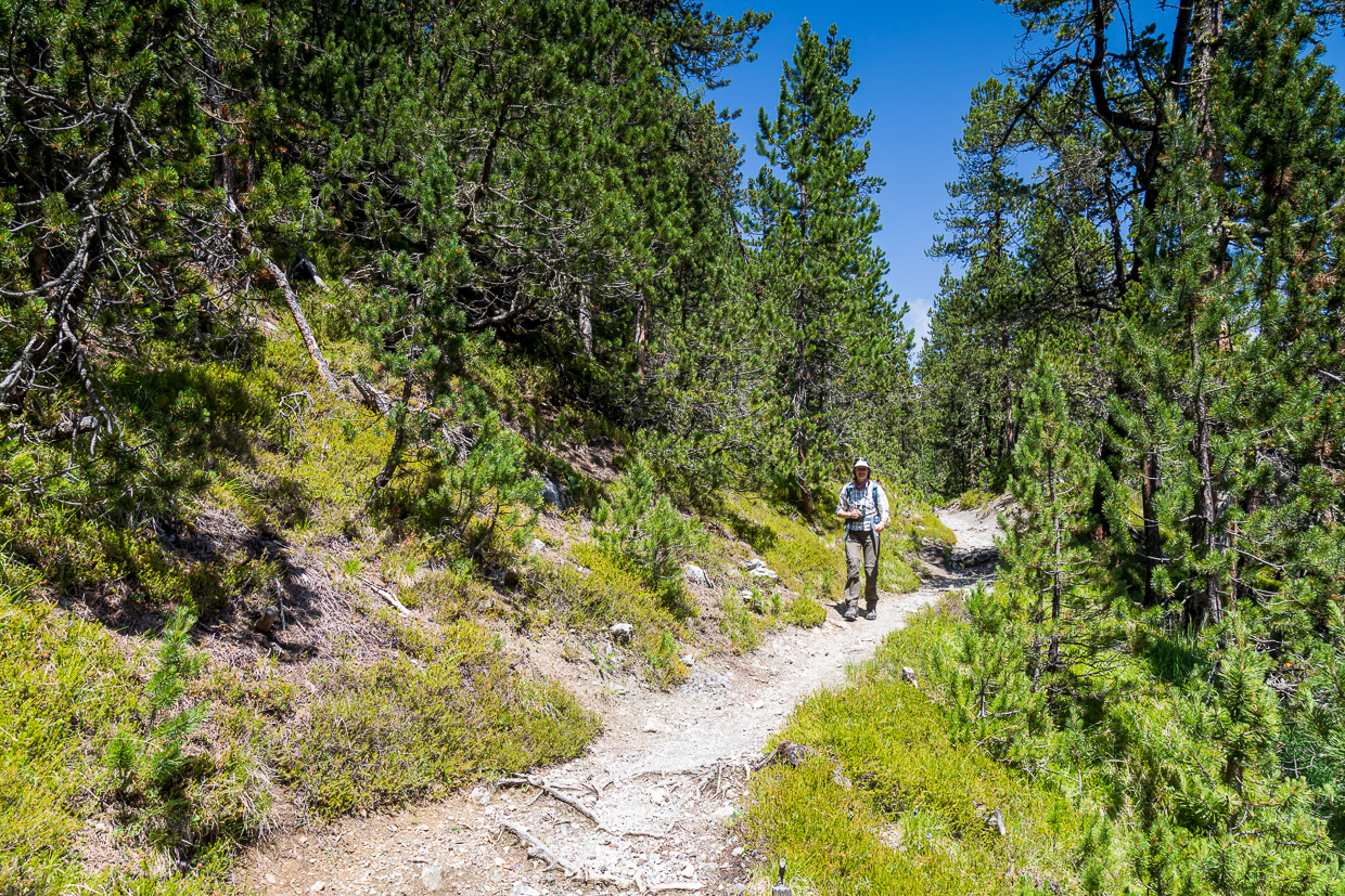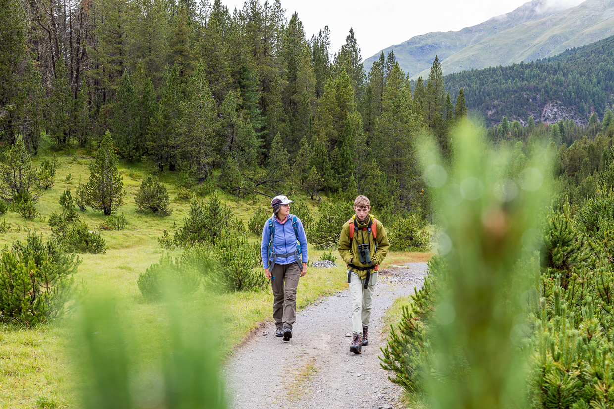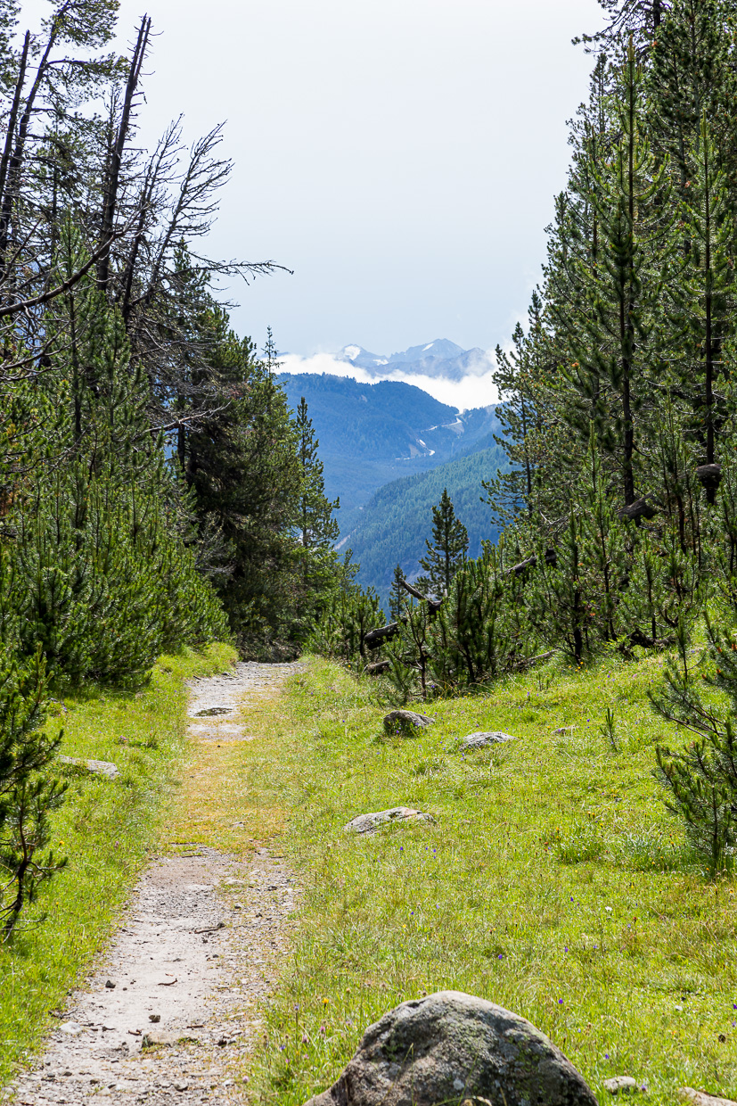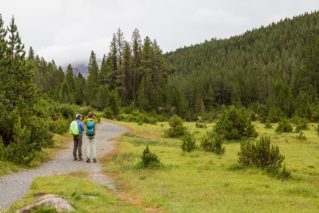 Wir steigen bei P1 aus, es regnet immer noch leicht. Kein Wunder, sind wir die einzigen. Zuerst steigt der Weg an, der gesäumt ist von Bergföhren. Es ist still, sehr still. Nur ab und zu krächzt ein Tannenhäher, ein Berglaubsänger huscht durchs Geäst. Zwei Rothirsche sehen wir gerade noch davonhuschen in den Wald.