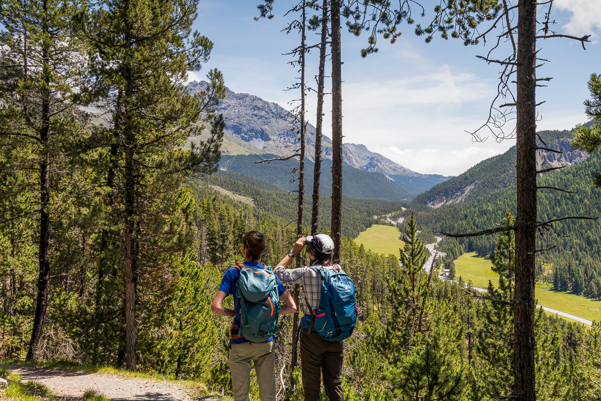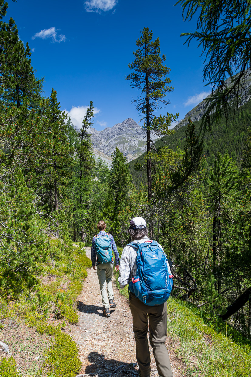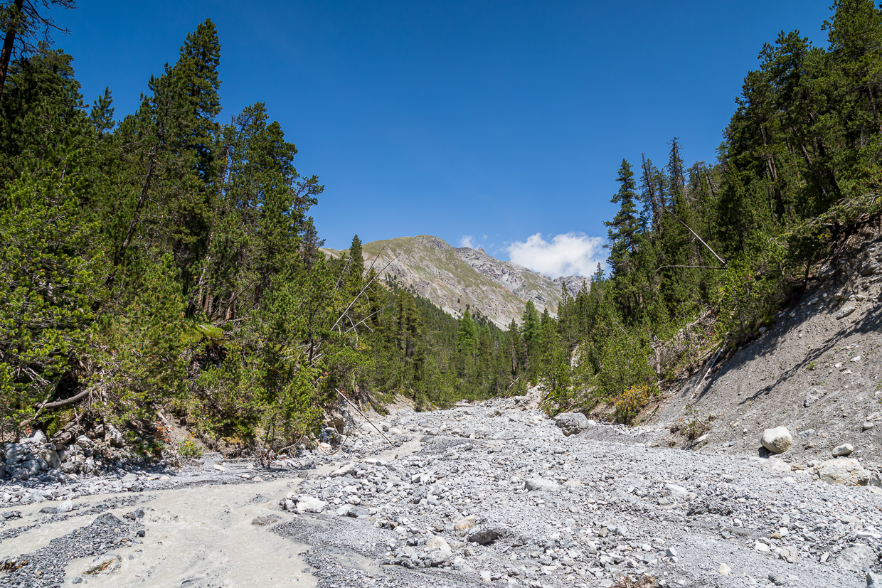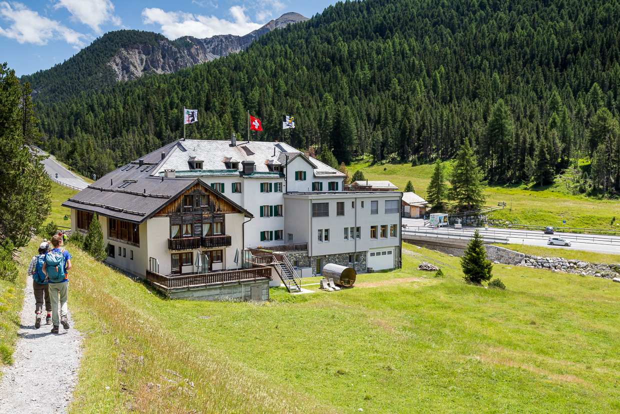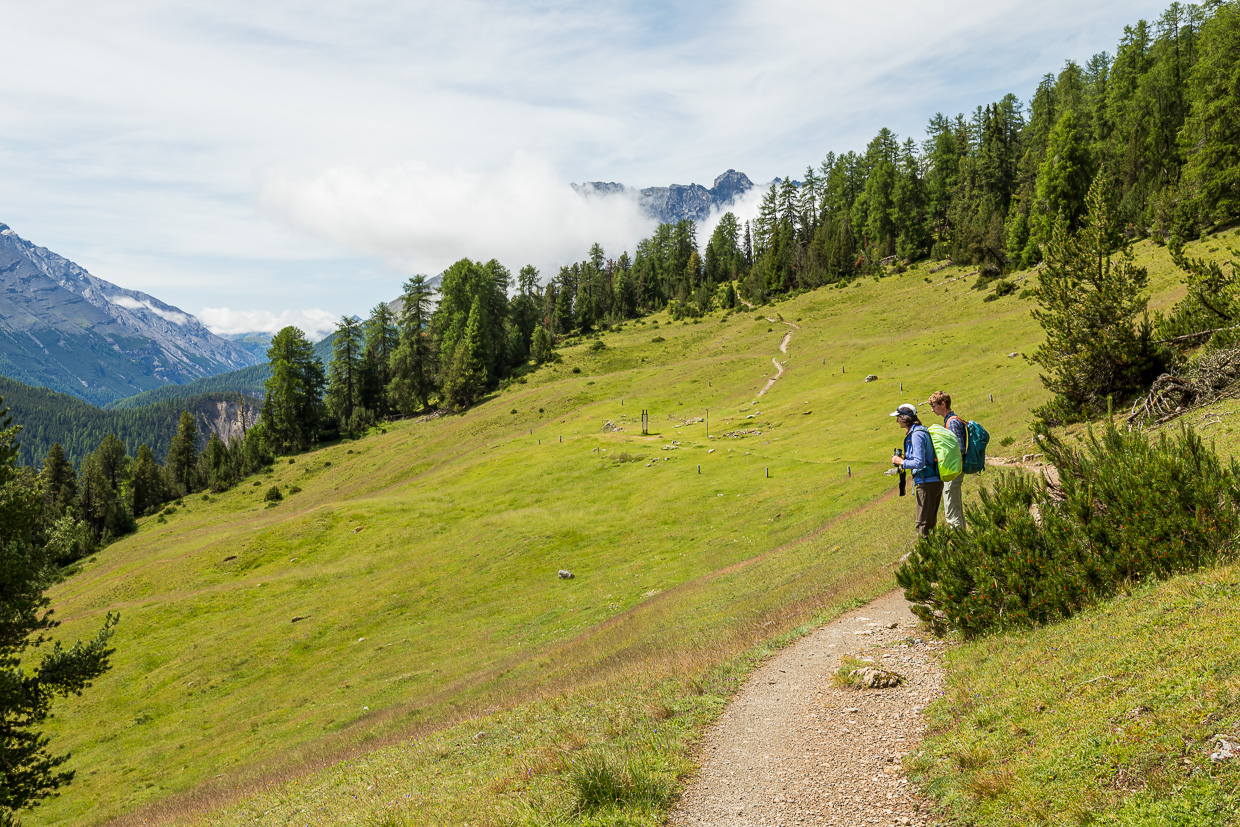 Wir wollen aufs erste Postauto und stehen entsprechend früh auf, da wir auf die Alp la Schera wollen. Doch die Ernüchterung folgt auf dem Fuss, es regnet. Na ja, mal gemütlich einen Kaffee trinken und warten. Als das Wetter auch eine Stunde später nicht besser ist, suchen wir eine Alternative: Kurz, nicht zu schwierig. Da bietet sich der Kinderpfad Champlönch an, obwohl es in unserer Familie ja keine Kinder mehr gibt. Wir nehmen also das nächste Postauto, auch wenn es noch regnet. Gemäss Wetterapp von MeteoSchweiz soll es bald aufhören. Glauben wir das mal.