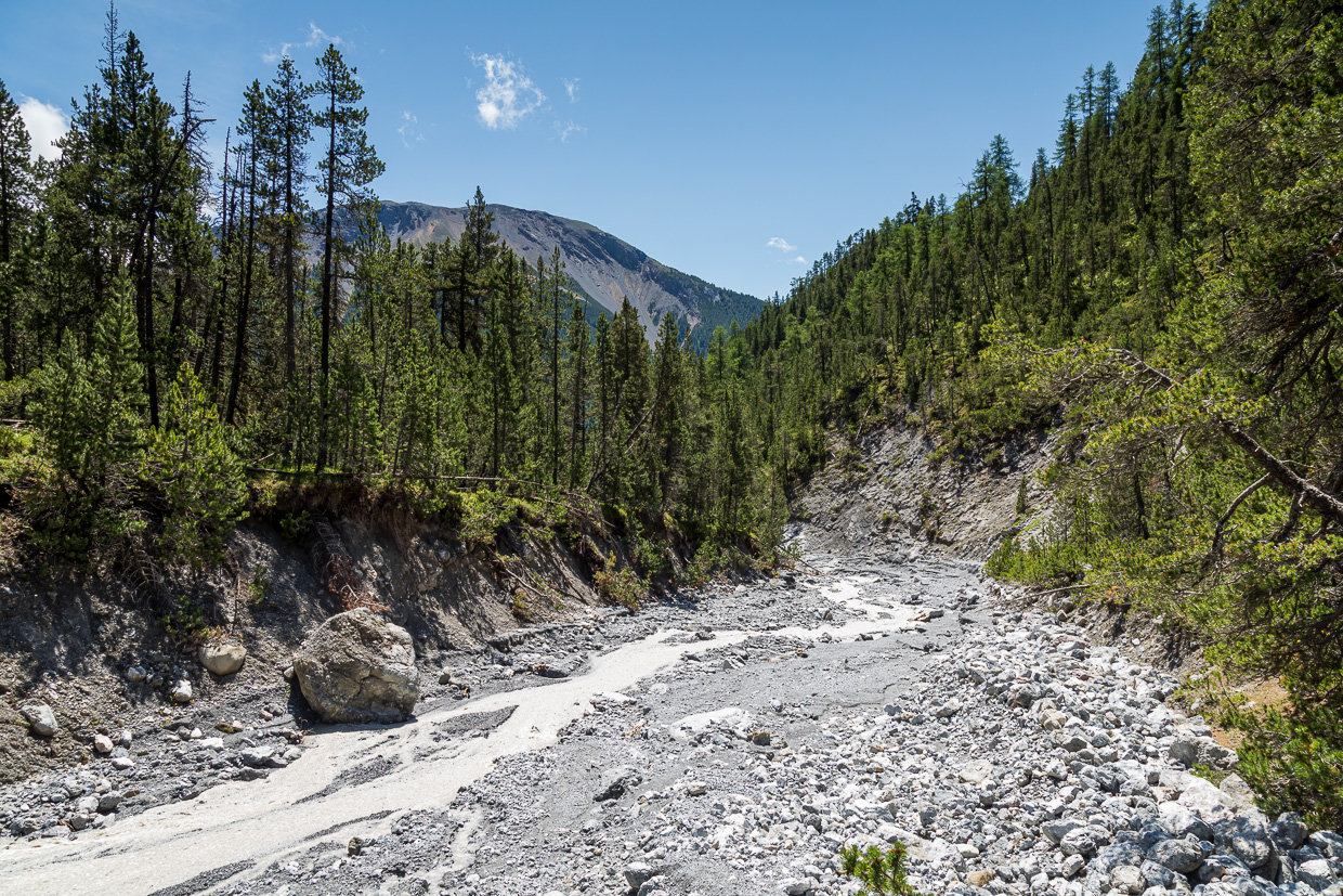 Wir kehren wieder um bis zur Verzweigung, vorher entdecken wir im Gebüsch eine Klappergrasmücke. Der Weg windet sich in grossen Kehren hinab zu einem Bach, den wir überqueren müssen. Hier sieht man, wie die Natur wirkt, wenn man sie lässt. Noch ein kleiner Anstieg, dann gehen wir unserem Ziel entgegen, dem Hotel Il Fuorn. Bei Sonnenschein löschen wir unseren Durst auf der Terrasse und genehmigen uns einen Marronikuchen. Mmmmmmh!