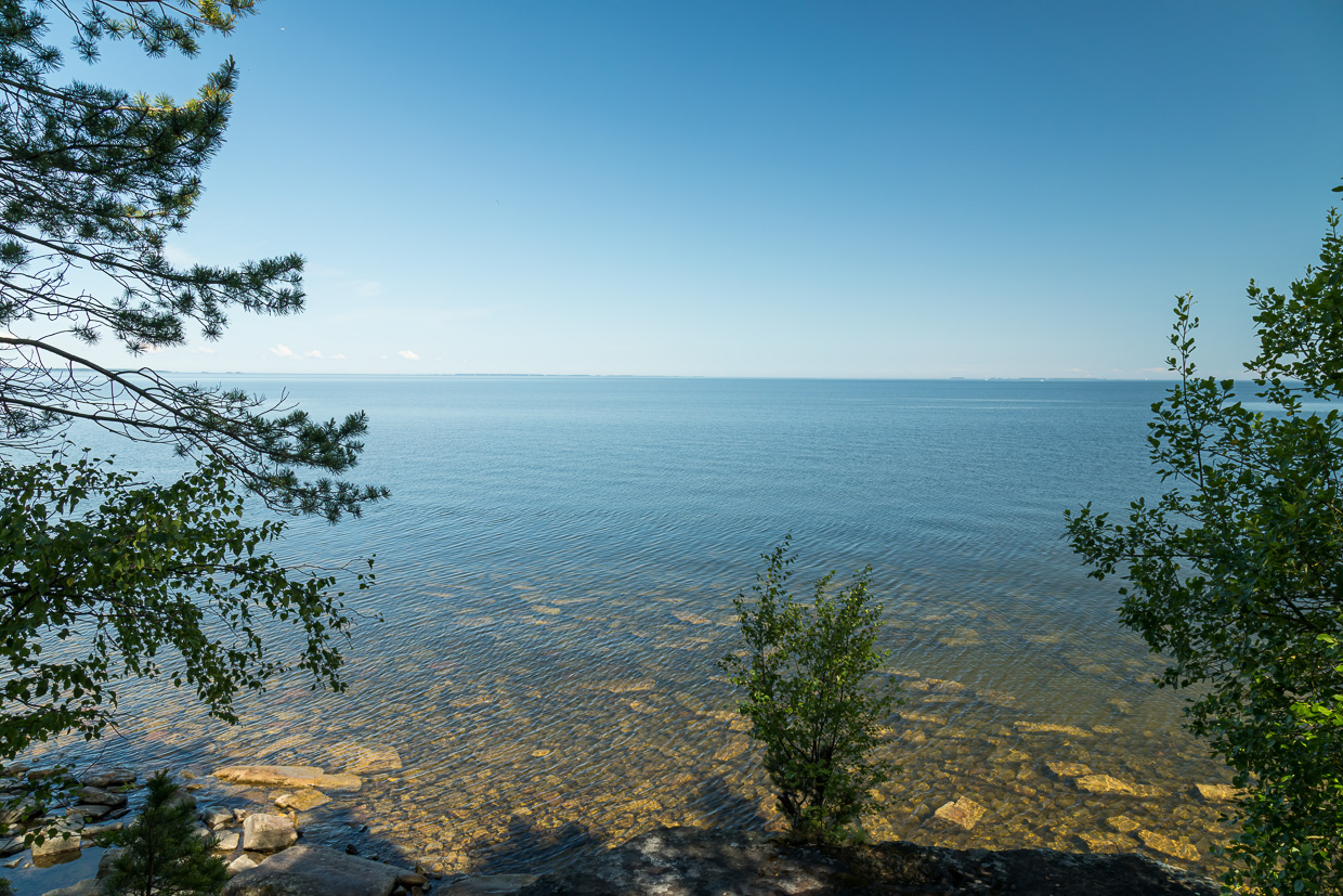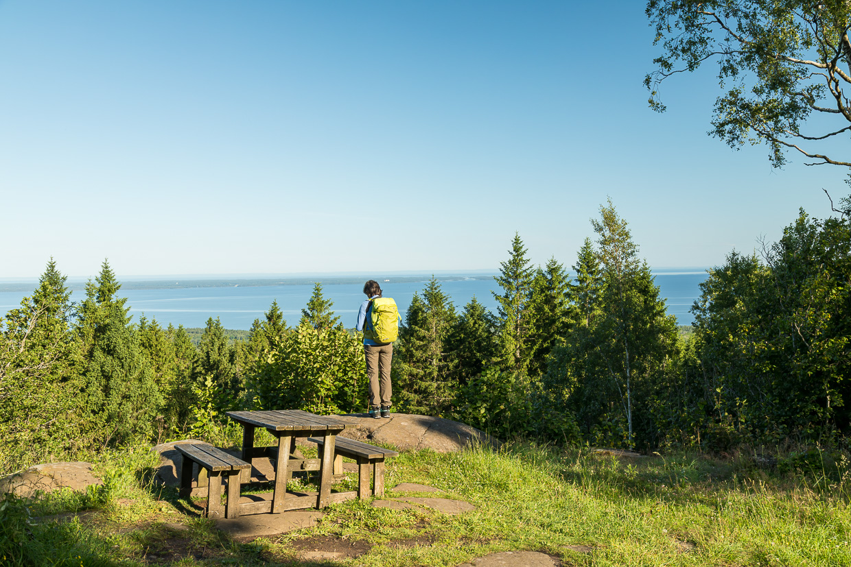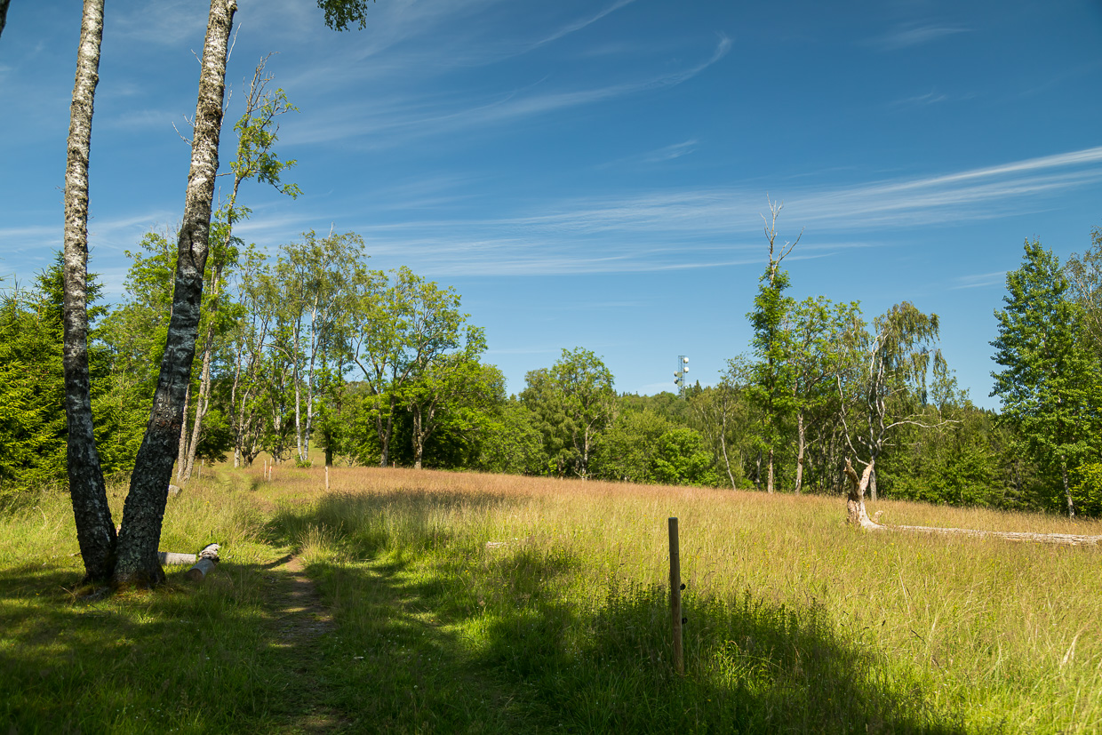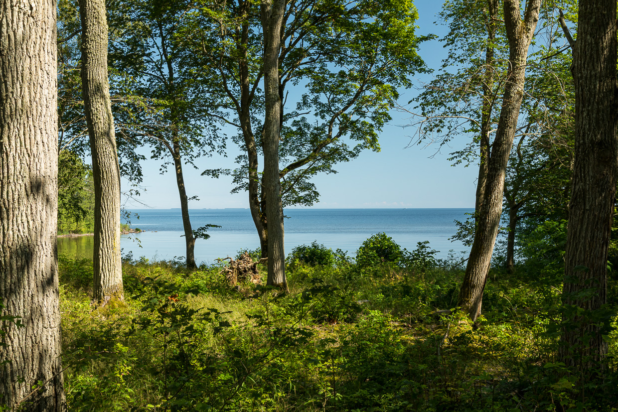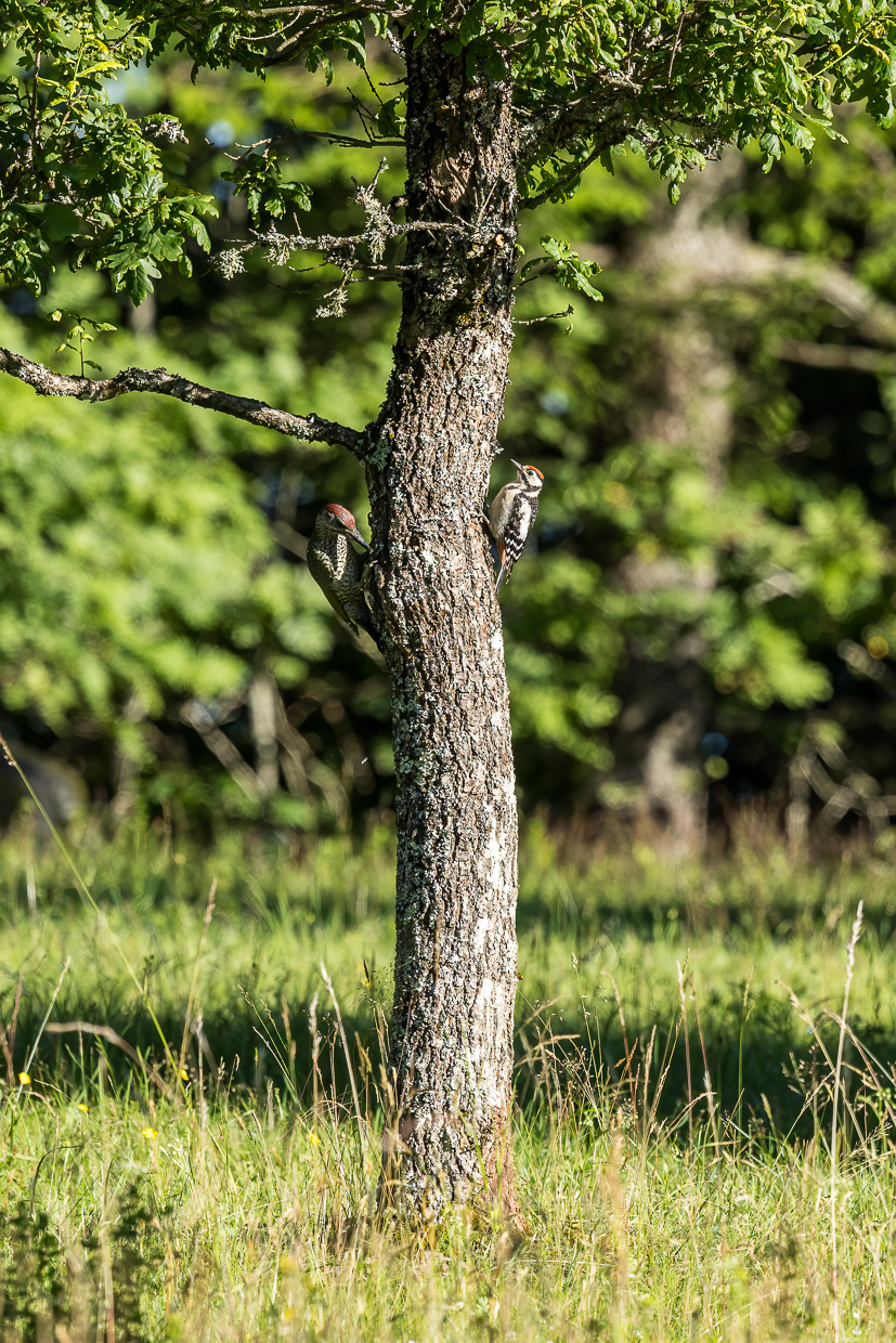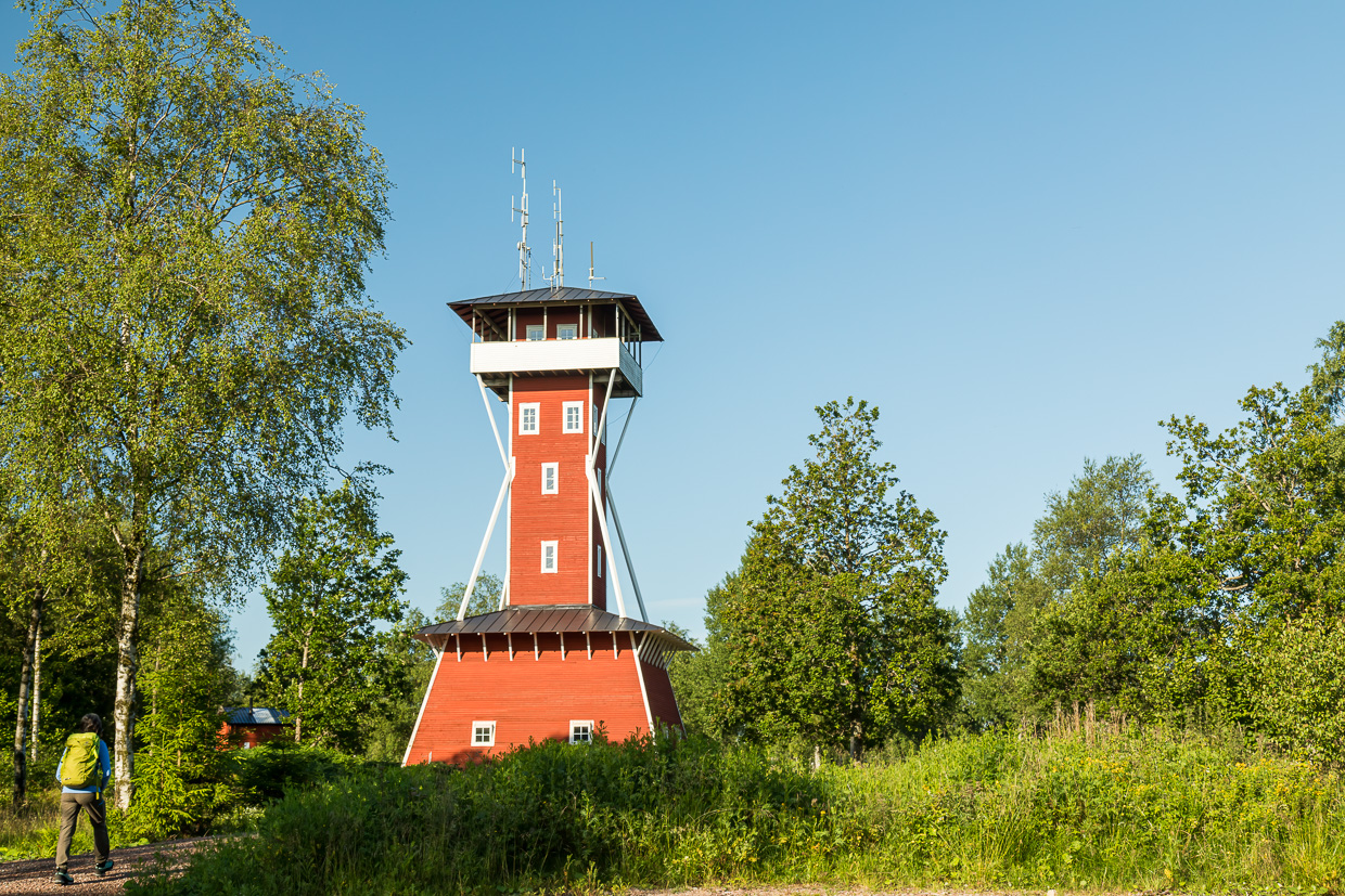 Wie erwähnt ist es nicht weit bis zum höchsten Punkt mit dem Aussichtsturm. Er ist allerdings abgeschlossen und öffnet erst um zehn Uhr, wir sind aber um halb acht gestartet. So gehen wir weiter, können dazwischen einen Blick auf den riesigen Vänernsee erhaschen. Anschliessend steigen wir abwärts. Auf einer Lichtung entdecken wir Buntspechte und einen Grünspecht.