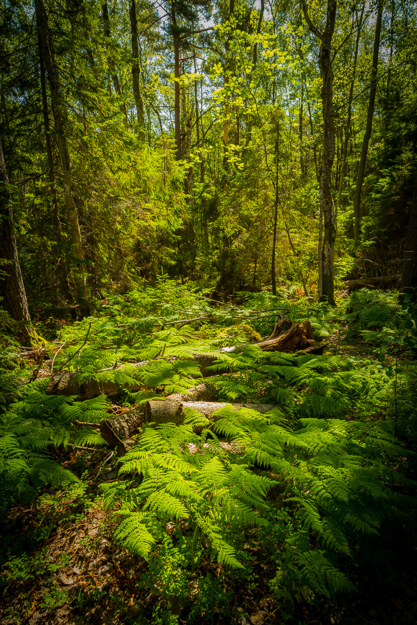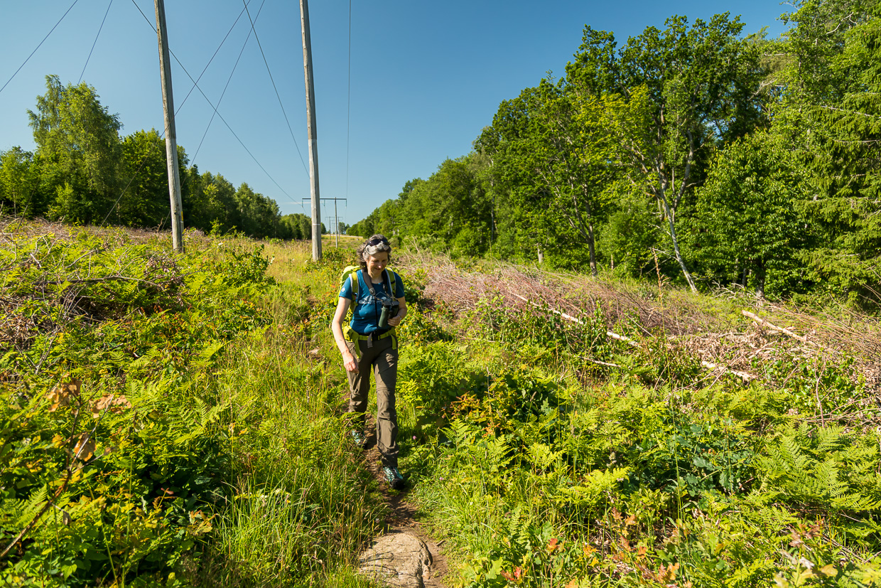 Es geht weiter abwärts, mal durch schönen Mischwald, ab und zu mal durch Fichtenplantagen. Und mitten durch den Wald wurde eine breite Schneise geschlagen für die Stromleitung. Dort hören wir eine unbekannte Vogelstimme. Merlin meint: Gelbspötter! Tatsächlich entdecken wir den Vogel, er ist wirklich gelb und rastlos ist er auch, bleibt kaum mal am gleichen Ort. So lohnt sich das Auspacken der Birderkamera gar nicht.