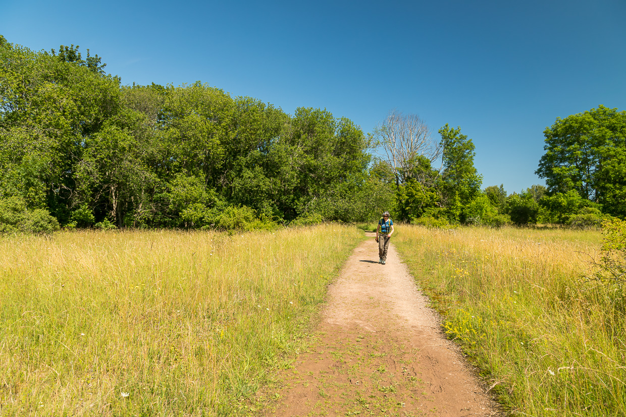 Bei einem Campingplatz verlassen wir den See wieder. Inzwischen ist es heiss geworden, wir versuchen, dem Schatten zu folgen, so weit es hat. Zum Glück kommt wieder eine Waldpartie. Auf der Lichtung, die wir durchqueren, raschelt es plötzlich neben dem Weg. Eine Schlange! Leider ist sie sofort verschwunden, ich konnte die Art nicht feststellen.
