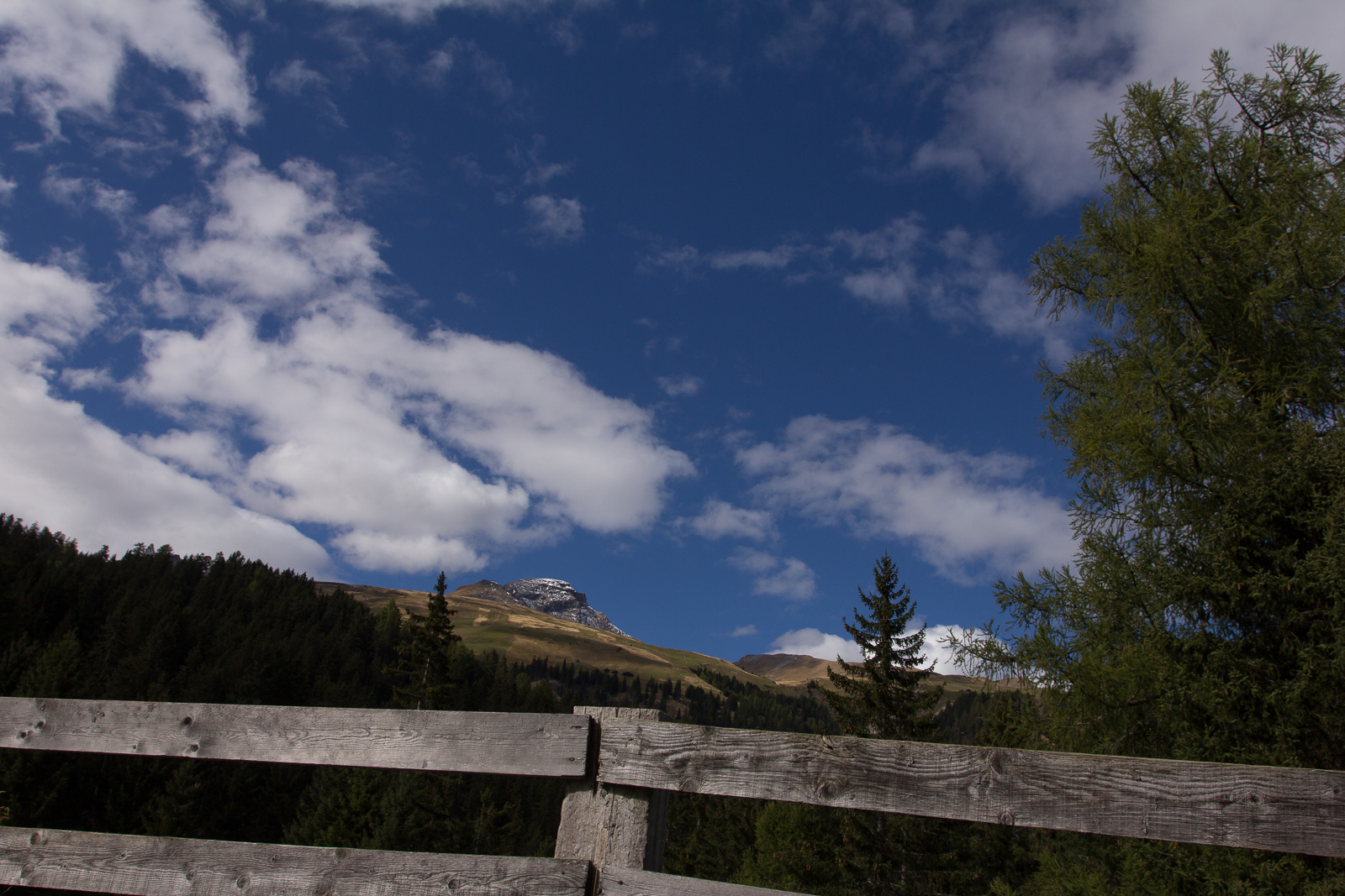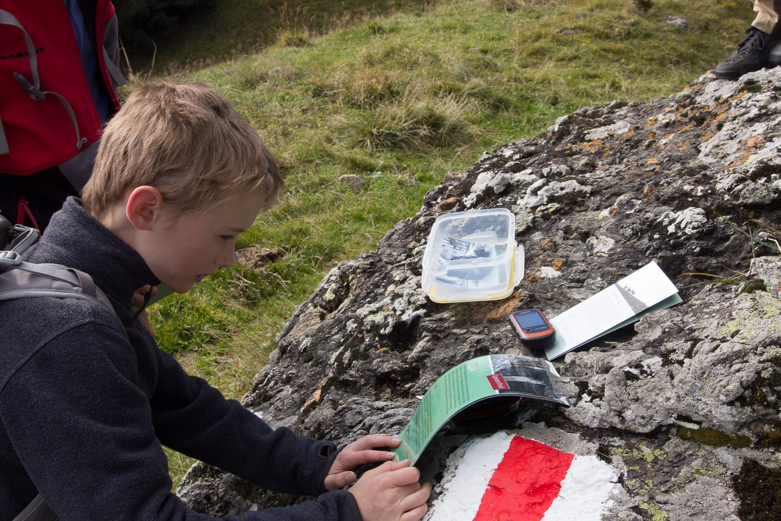Wir wandern hoch zur Alp Dumagns, über schöne Weiden und an alten Bäumen vorbei. Posten um Posten finden wir, lösen die Rätsel. Selbst Fabian hat darob das Biken für einen Moment vergessen. Und je höher wir kommen, desto besser wird (naturgemäss) die Aussicht. Fantastisch! Bei der Alp erblicken wir auch den Namensgeber des Naturparkes, den Piz Beverin. Oh, da muss ich mal rauf! Der Berg sieht wunderbar aus von hier, am liebsten würde ich sofort gehen. Muss aber warten, wir sind ja auf der Pirsch. Ab hier geht es wieder abwärts. Wir gucken nicht nur auf das Display, sondern natürlich auch rundherum und entdecken einen Grünspecht, Goldhähnchen, Tannenhäher, eine Blindschleiche und andere Tiere. Nur den Protagonisten, den Steinbock, sehen wir nie. Dazu sind wir natürlich viel zu weit unten. Beim letzten Posten müssen wir uns einen Code notieren, um das letzte Rätsel zu knacken. Dann geht es zurück nach Wergenstein.