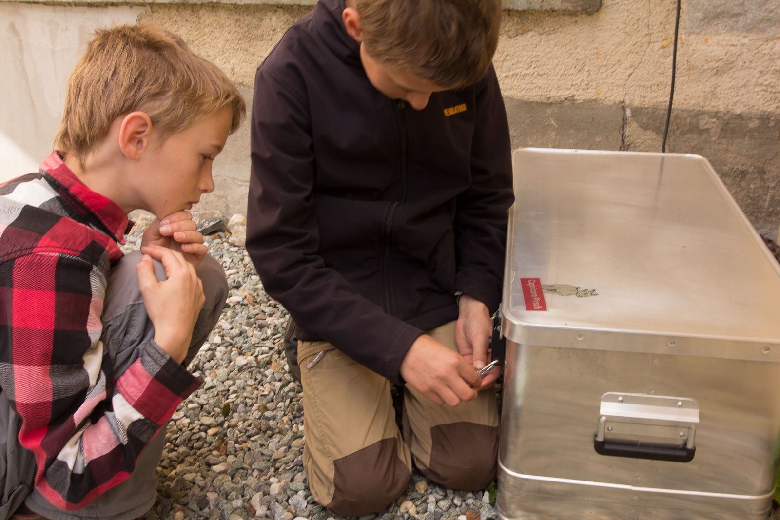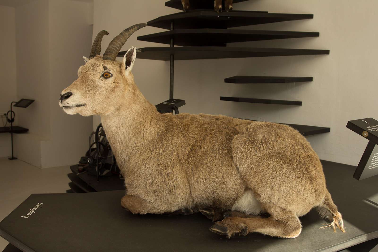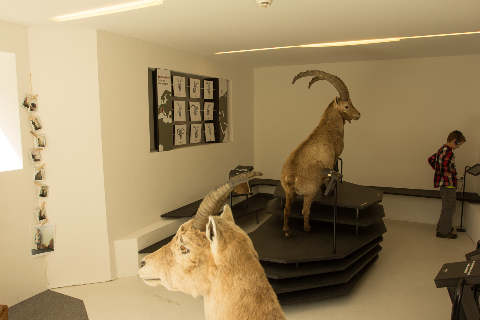 Aber wo ist jetzt dieser letzte Posten? Irgendwo zeigt das Gerät in ein Gehege. Aber halt, vielleicht muss man zuerst…? Nein, mehr wird nicht verraten. Wir finden jedenfalls das Versteck. Anschliessend sehen wir uns die Steinbock-Ausstellung an. Es gibt viele Informationen zum Steinbock in der Schweiz allgemein und im Beverin-Gebiet im Speziellen. Die Steinböcke waren ja ausgerottet worden und nur der italienische König besass noch welche im Gebiet Gran Paradiso. Höflichst ersuchte man den Regenten, ihnen doch ein paar Steinkitze zu verkaufen, dieser war aber stolz darauf, als einziger noch Steinböcke zu besitzen, und verwehrte ihnen das Ansinnen. So beschaffte man sie illegal und schmuggelte sie in die Schweiz, zog sie im Tierpark Peter und Paul in St. Gallen auf und wilderte sie später aus. Allmählich entwickelte sich die Steinbock-Kolonie und die Tiere besiedeln heute zum Glück wieder den ganzen Alpenraum.