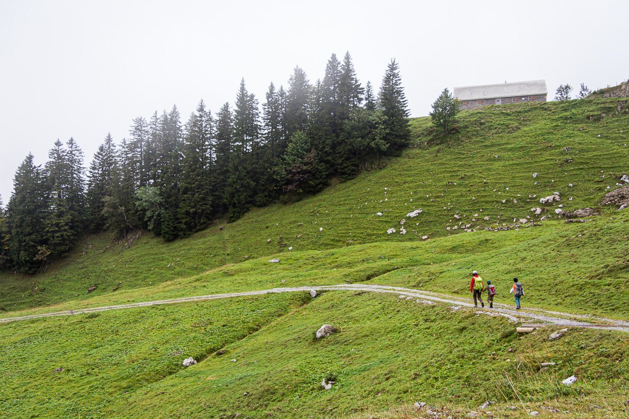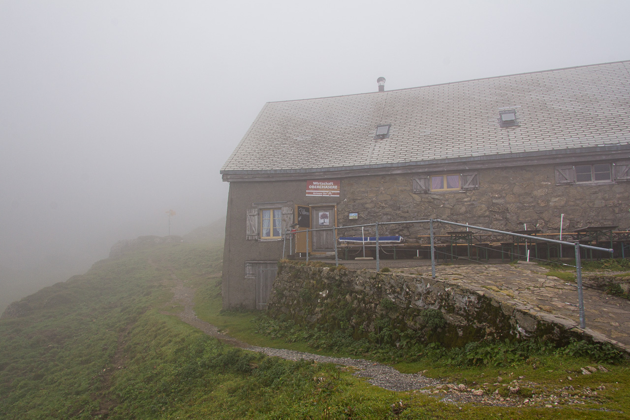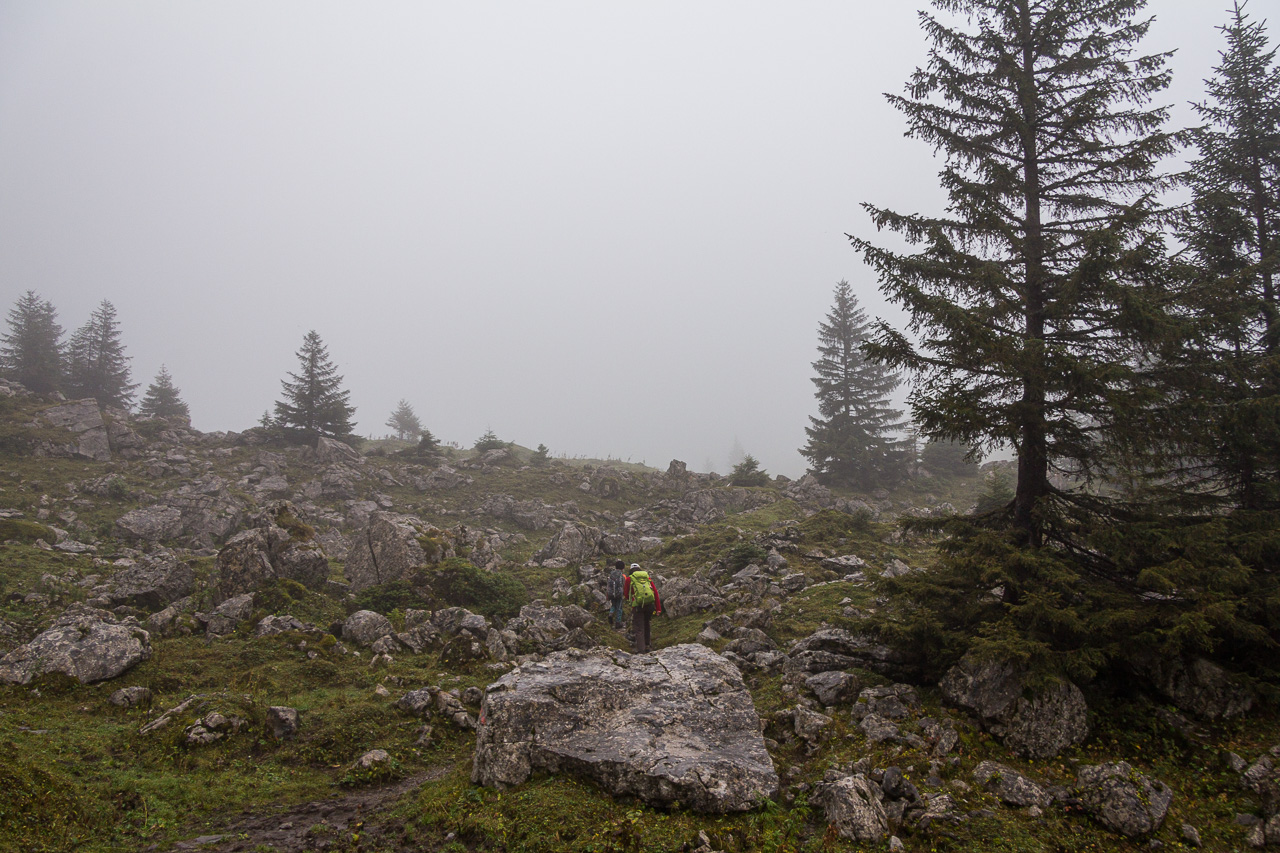 Wir sind alleine. Völlig alleine. Da wir inzwischen auf der Rückseite des Mattstockes sind, erreicht uns auch keinerlei Zivilisationslärm. Es geht auf und ab. Das Gestein wechselt vom Kalk zum Molassegestein, diesem aus Kieselsteinen zusammengebackenen Konglomerat, auch bekannt als Nagelfluh. Der Speer ist übrigens der höchste Nagelfluhberg in Europa. Nach einer Weile erreichen wir die Alp Oberchäseren, wo man auch übernachten kann. Wir Eltern möchten zuerst auf den Gipfel und anschliessend einkehren, die Kinder möchten es umgekehrt. Da sie bis hierher schon tapfer marschiert sind, geben wir nach. Im Restaurant vertreiben sich drei Jäger die Zeit mit Jassen. Nachdem unsere Flüssigkeitsspeicher wieder gefüllt sind, wagen wir uns wieder hinaus in den Nebel mit dem Auftrag der Wirtin, diesen über den Berg zu den Toggenburgern zu verjagen.