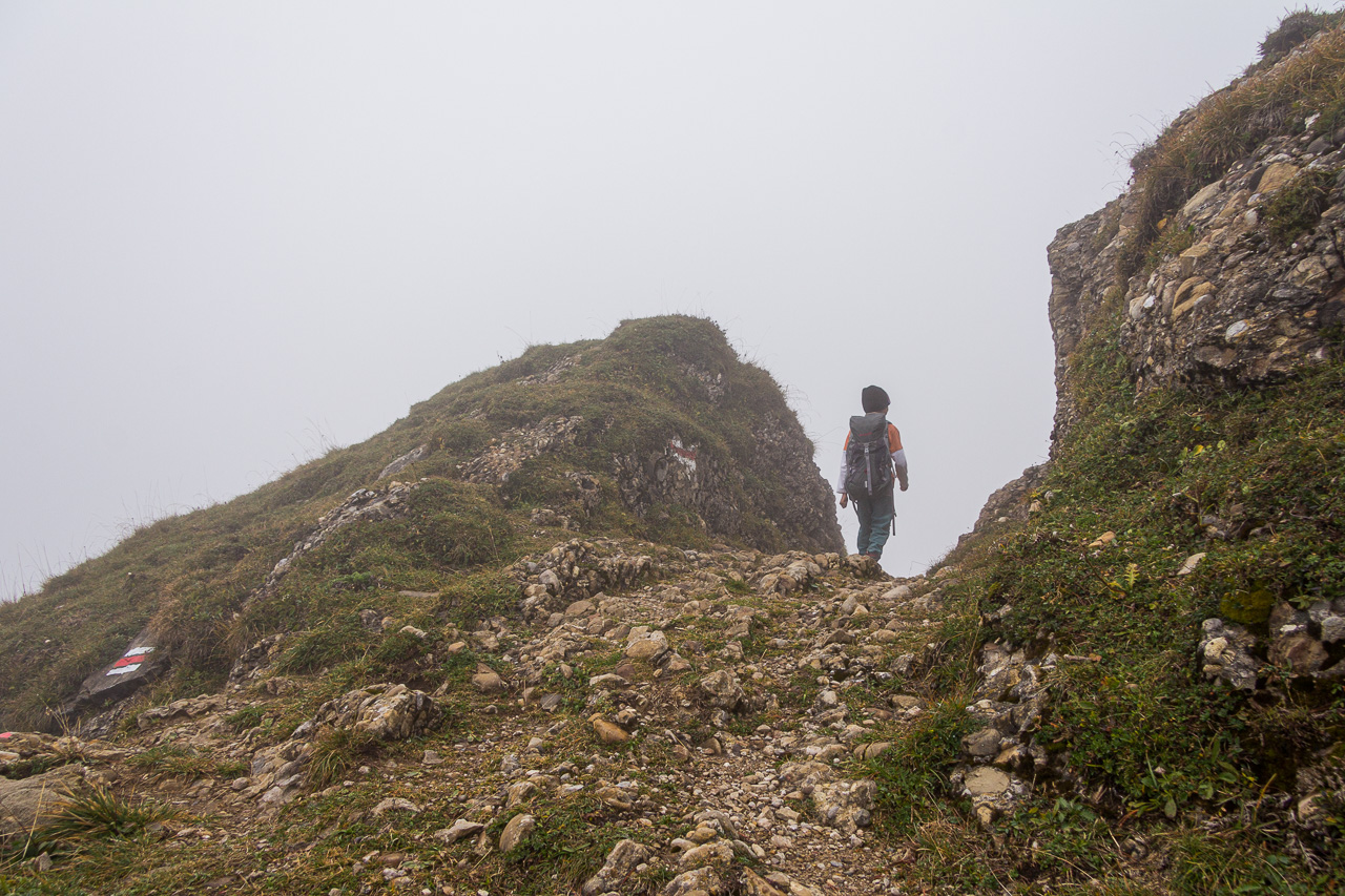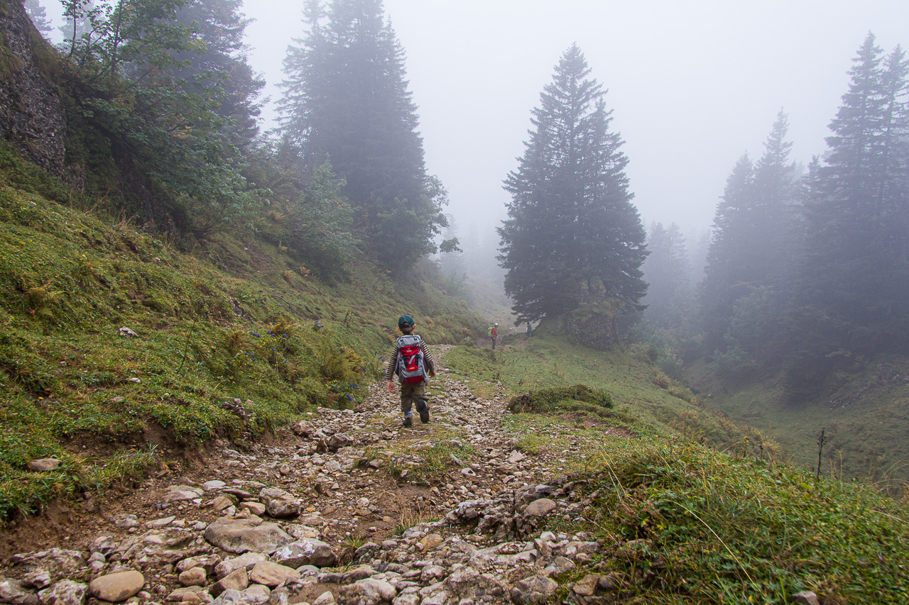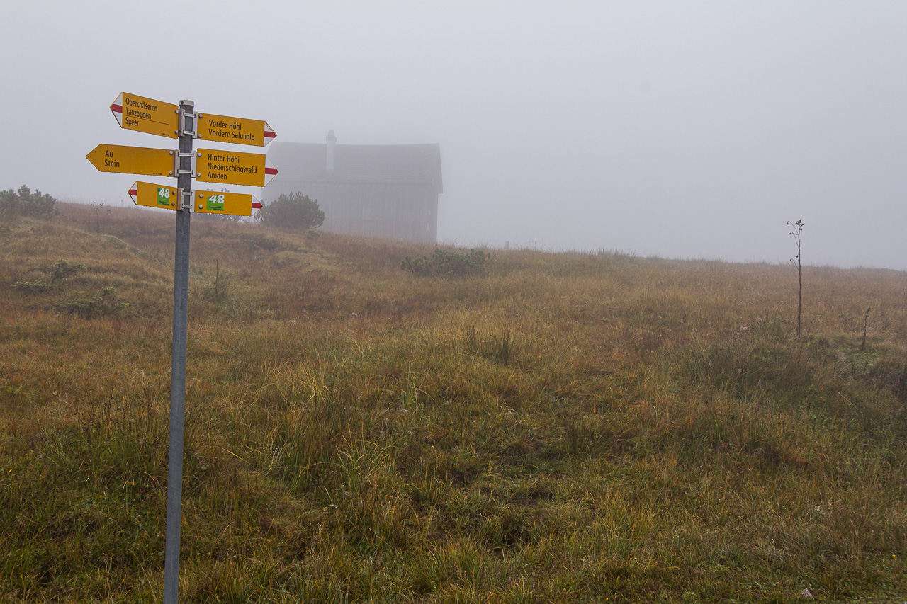 Wir sind alleine. Völlig alleine. Da wir inzwischen auf der Rückseite des Mattstockes sind, erreicht uns auch keinerlei Zivilisationslärm. Es geht auf und ab. Das Gestein wechselt vom Kalk zum Molassegestein, diesem aus Kieselsteinen zusammengebackenen Konglomerat, auch bekannt als Nagelfluh. Der Speer ist übrigens der höchste Nagelfluhberg in Europa. Nach einer Weile erreichen wir die Alp Oberchäseren, wo man auch übernachten kann. Wir Eltern möchten zuerst auf den Gipfel und anschliessend einkehren, die Kinder möchten es umgekehrt. Da sie bis hierher schon tapfer marschiert sind, geben wir nach. Im Restaurant vertreiben sich drei Jäger die Zeit mit Jassen. Nachdem unsere Flüssigkeitsspeicher wieder gefüllt sind, wagen wir uns wieder hinaus in den Nebel mit dem Auftrag der Wirtin, diesen über den Berg zu den Toggenburgern zu verjagen.