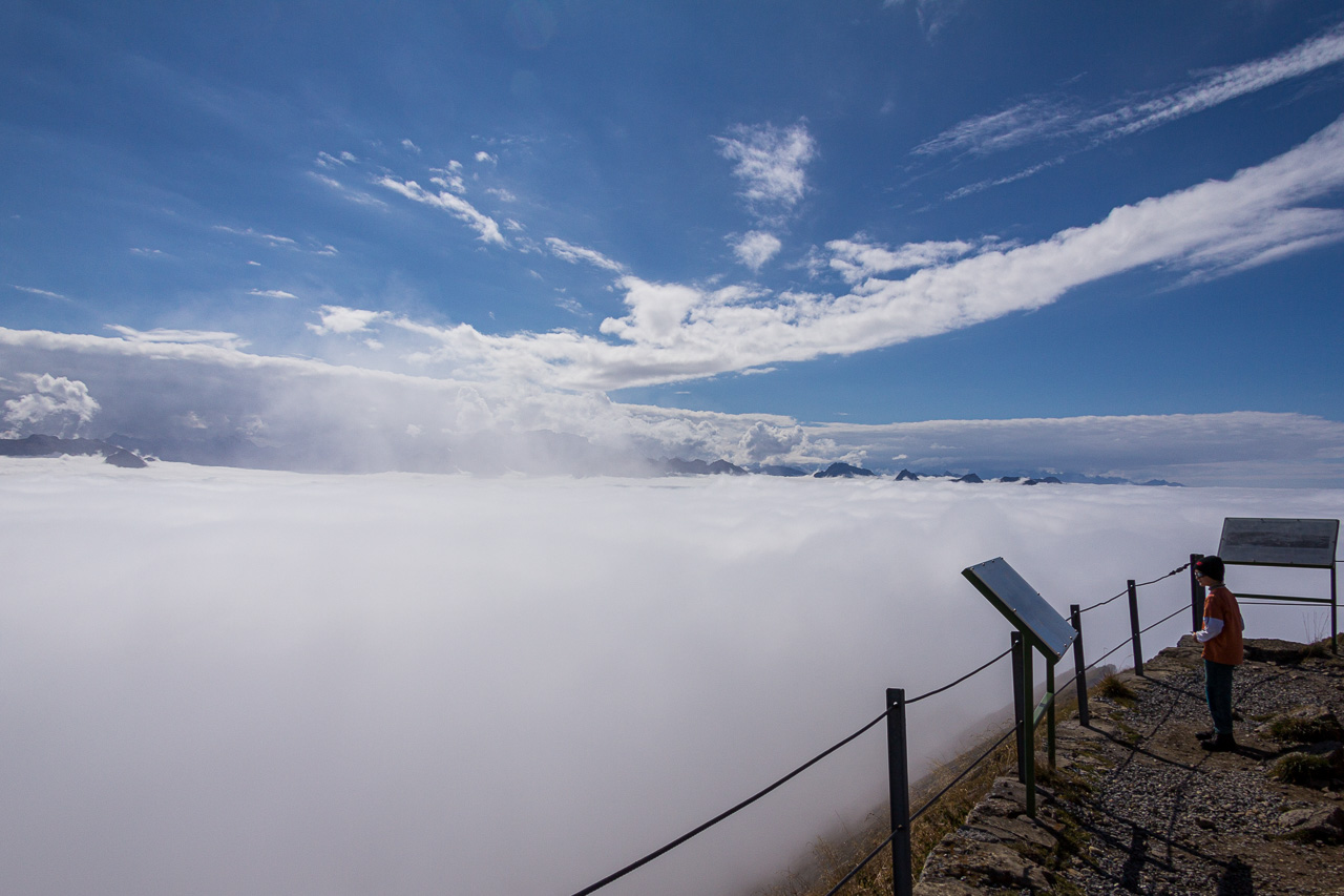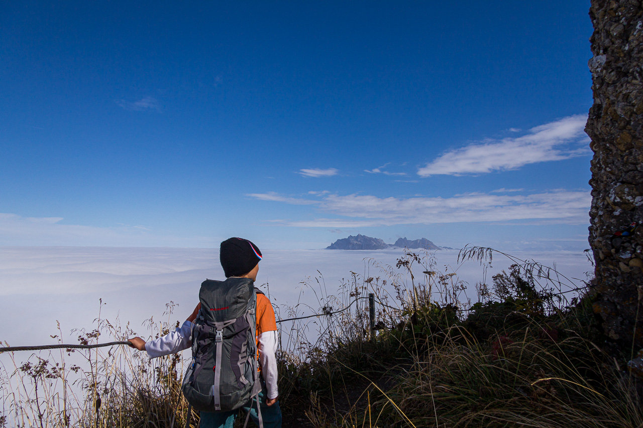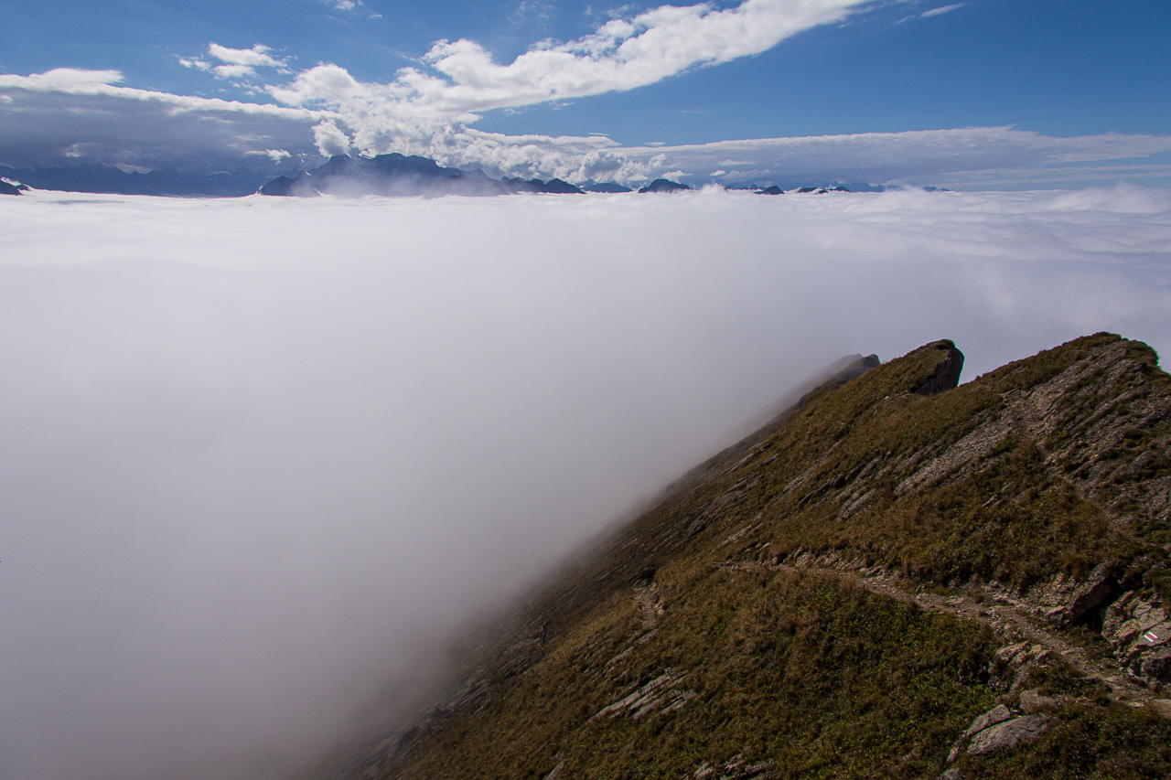 Bis Flügenspitz wandern wir auf Weiden, danach fängt der Weg an zu steigen. Die Wegbauer haben aber ganze Arbeit geleistet, bis auf den Gipfel haben sie Treppenstufen gebaut. Irgend etwas ist jetzt aber anders. Ja, richtig, die Sonne drückt durch den Nebel. Je höher wir steigen, desto mehr scheint sie. Kurz unter dem Gipfel blicken wir auf ein gewaltiges Nebelmeer. Das ganze Mittelland verschwindet unter dem Nebel, nur die Berge über 1936 Meter sehen wir. So hoch ist nämlich der Mattstock, nur 15 Meter tiefer als der Speer, aber wir sehen ihn nicht.