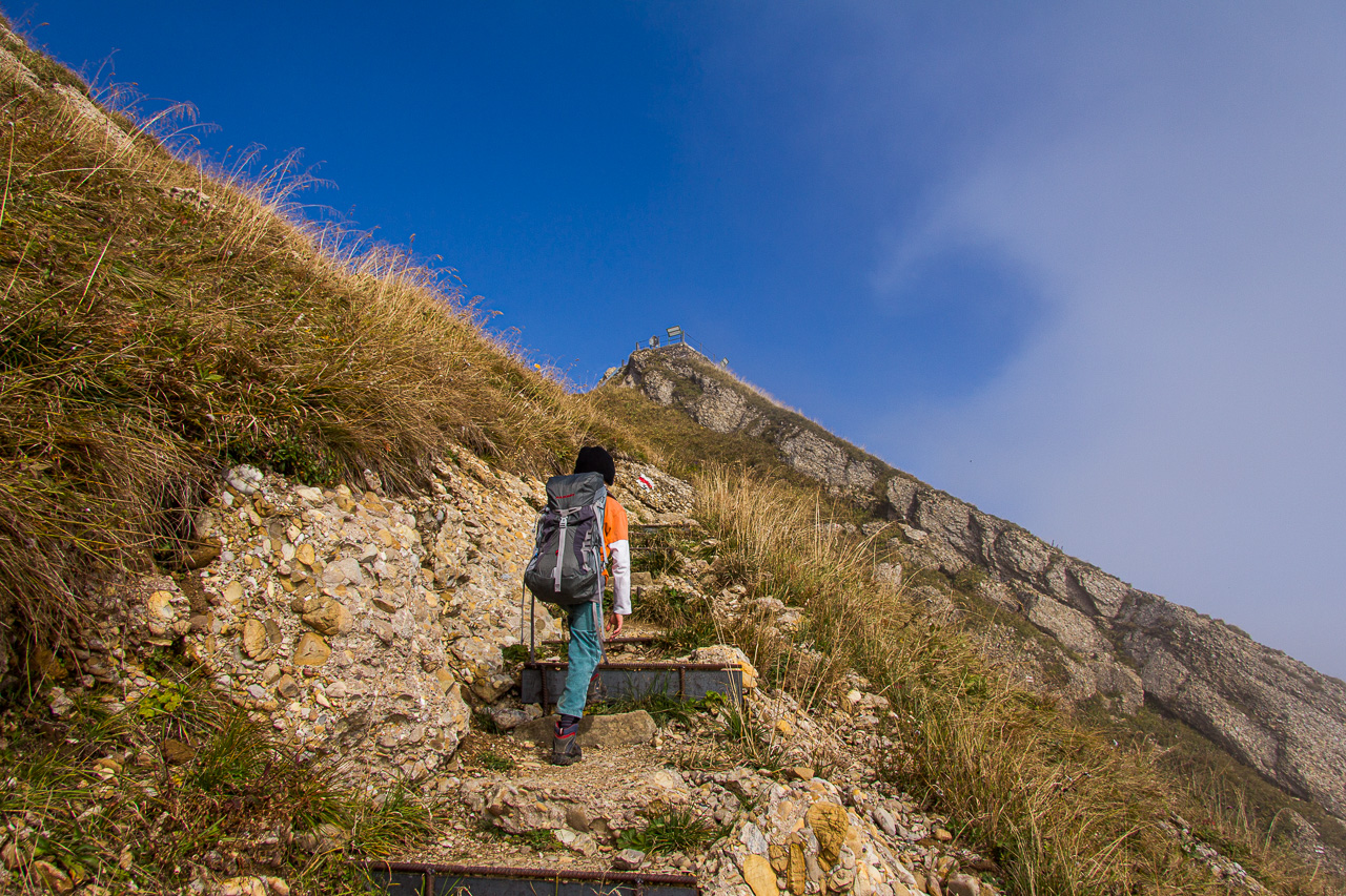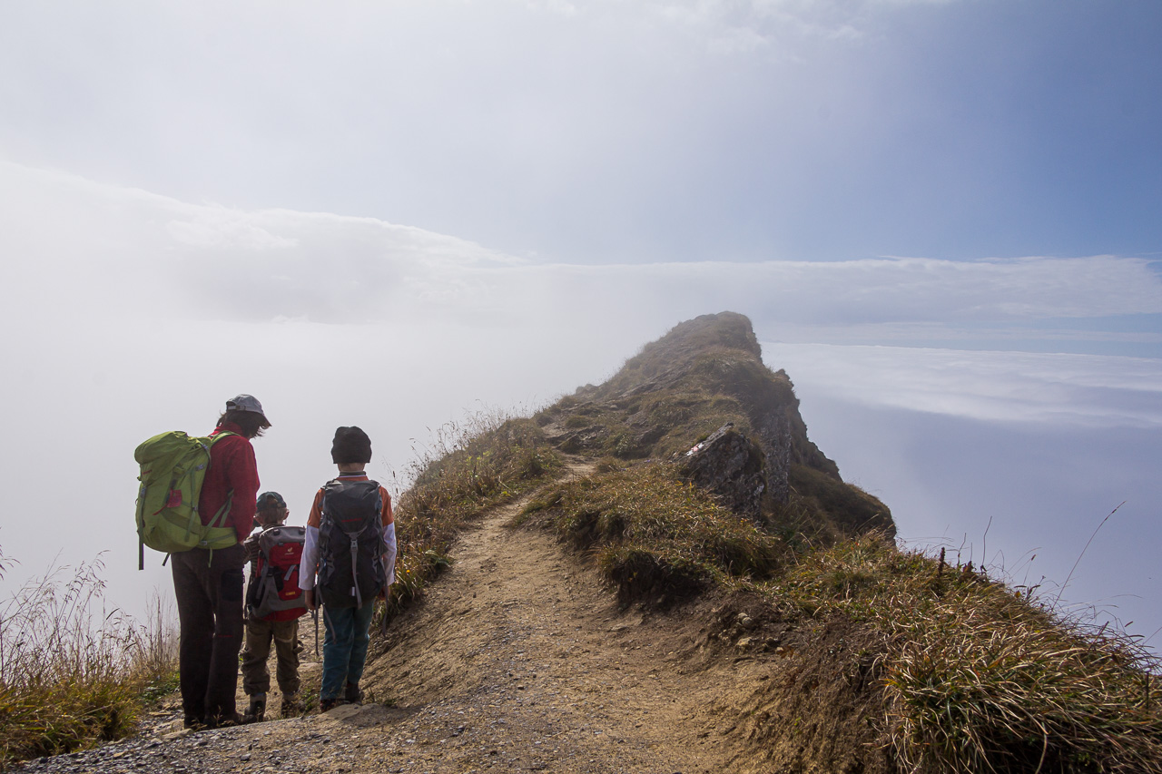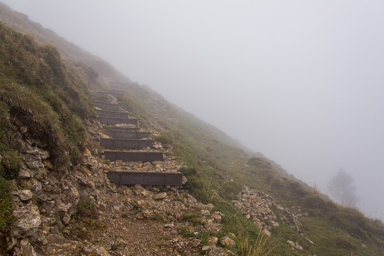 Bis Flügenspitz wandern wir auf Weiden, danach fängt der Weg an zu steigen. Die Wegbauer haben aber ganze Arbeit geleistet, bis auf den Gipfel haben sie Treppenstufen gebaut. Irgend etwas ist jetzt aber anders. Ja, richtig, die Sonne drückt durch den Nebel. Je höher wir steigen, desto mehr scheint sie. Kurz unter dem Gipfel blicken wir auf ein gewaltiges Nebelmeer. Das ganze Mittelland verschwindet unter dem Nebel, nur die Berge über 1936 Meter sehen wir. So hoch ist nämlich der Mattstock, nur 15 Meter tiefer als der Speer, aber wir sehen ihn nicht.