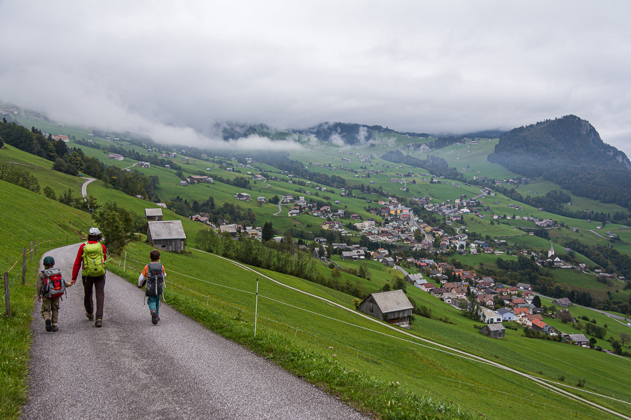 In den Nebel. Bald tauchen wir wieder in die Suppe ein. Bis Alp Oberchäseren nehmen wir den gleichen Weg zurück. Dort zweigen wir aber diesmal rechts Richtung Hintermatt ab. Wir kommen flott voran, in grossem Bogen umrunden wir den Mattstock. Bei Durschlegi kommen wir dann wieder in der Zivilisation an, die restliche Strecke legen wir auf Asphalt zurück. Ein toller Spielplatz erfreut nochmals die Kinder, bevor wir die Runde um den Mattstock schliessen. Ohne ihn je gesehen zu haben. Gibt es ihn wirklich? Schauen Sie nach!