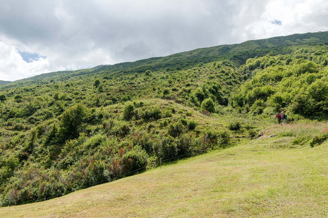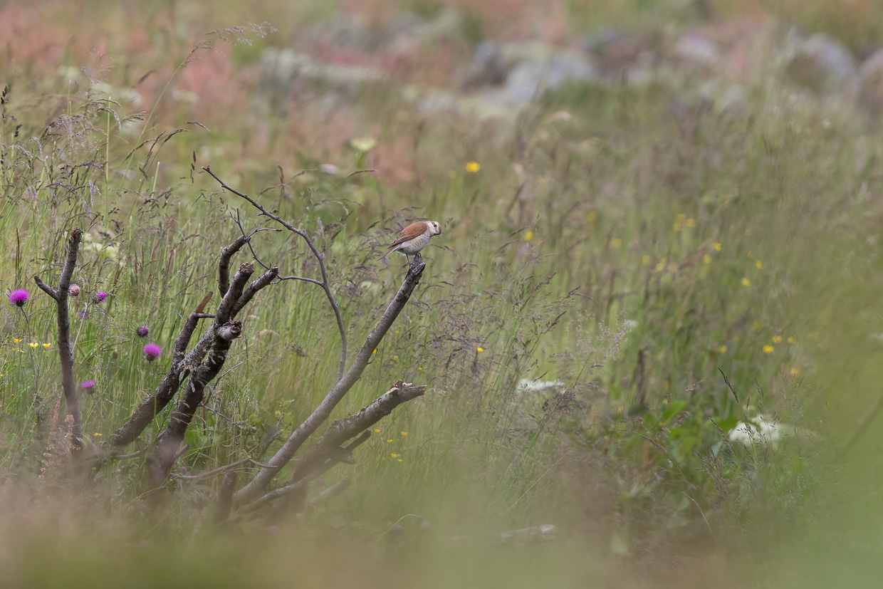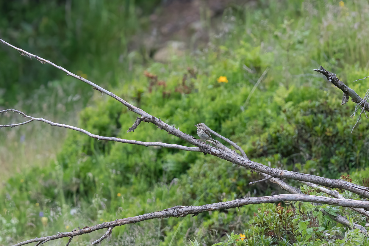 Wir gehen weiter auf der Sommerlanglaufpiste (ja, das gibt es), da entdecken wir ein Braunkehlchen. Diese sperlingsgrossen Vögel sind im Mittelland als Brutvogel ausgestorben und nur noch auf dem Zug zu beobachten. Umso erfreuter sind wir, hier ein Exemplar zu entdecken. Der Wanderweg zweigt rechts ab und steigt an. Schon kommen wir nicht mehr vorwärts, weil Silvan laufend Schmetterlinge entdeckt. Das macht nichts, ich sehe dafür einen Alpenbirkenzeisig. Die Kuhweide, die wir durchqueren müssen, ist dann wieder eine Herausforderung für die Frau, aber wir lassen die Kühe zurück nach dem Drehkreuz. Fast aus jedem Busch ertönt eine Gartengrasmücke. Sie sitzt nicht wie andere Vogelarten zuoberst auf einem Ast, wo man sie möglichst gut sieht, sondern versteckt im Busch, so dass man sie kaum je zu Gesicht kriegt. Bei der Gartengrasmückenfrauen zählen offensichtlich die klanglichen Werte mehr als die optischen.