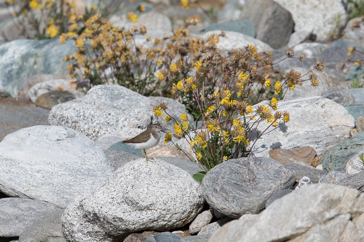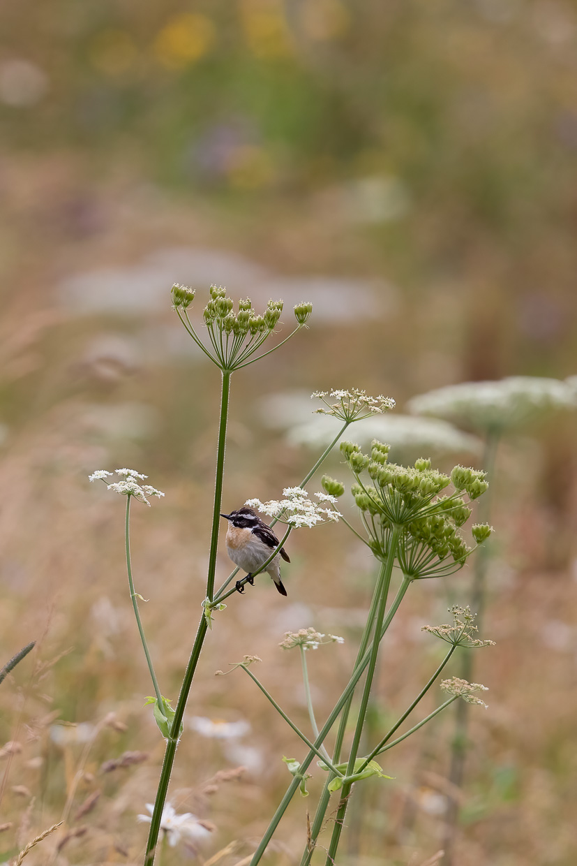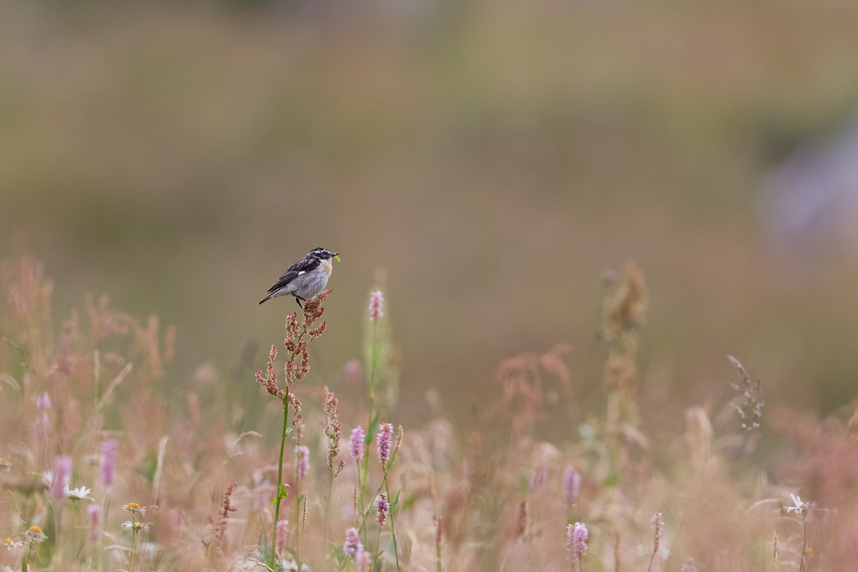 Wir gehen der Reuss entlang zurück. Eine Wasseramsel hat ihr Nest an einem Bächlein gebaut, sie wartet, bis wir vorbei sind, um den Jungen Futter zu bringen. Etwas weiter läuft ein Flussuferläufer am Ufer des Flusses. Der Weg führt nun weg von der Reuss, Wiesen entlang. Das Gras steht hoch, die Wiesenkerbel auch, ein beliebter Aufenthaltsort von Braunkehlchen. Prompt sehen wir sie hier herumturnen, aber längst nicht alle, überall piept es in der Wiese. Etwas weiter, in kürzerem Gras und mit Steinen durchsetzt, hüpfen Steinschmätzer umher und füttern Junge. Der erste Tag war also schon mal erfolgreich, auch wenn wir den Karmingimpel noch nicht gefunden haben.