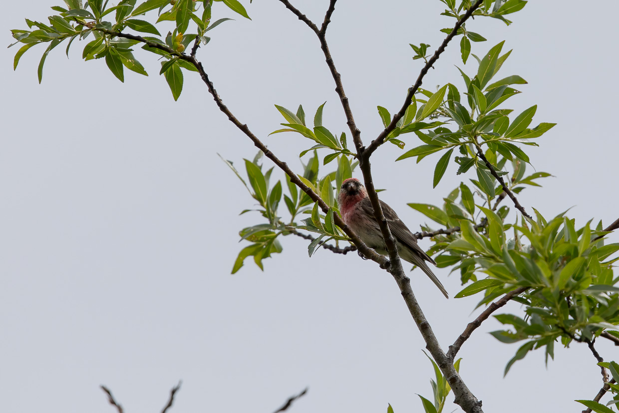 Bei einer Brücke zu einem Kraftwerk sage ich zu Silvan: „Komm, wir gehen da noch rüber und schauen dort auf der Wiese, ob wir ihn entdecken. Wenn nicht, lassen wir es sein für heute.“ Als wir auf der Wiese stehen, hören wir plötzlich den Gesang des Karmingimpels! Wir gehen noch etwas weiter auf der Wiese (sie ist frisch gemäht), schauen mit den Ferngläsern angestrengt. Auf einmal ruft Silvan: „Dort! Dort sitzt er auf einem Ast!“ Dann versucht er zu erklären, wo ‚dort‘ genau ist. Nach einer Weile finden die Frau und ich ihn auch. Da schlägt das Birderherz gleich höher! Ich hole die Kamera hervor und Pirsche mich näher ran. Ich erwische ihn recht gut, aber er ist halt doch immer noch weit weg, zudem ist ziemlich wenig Licht vorhanden. Unter diesen Umständen bin ich zufrieden mit den Bildern. Glücklich kehren wir zur Pension zurück.