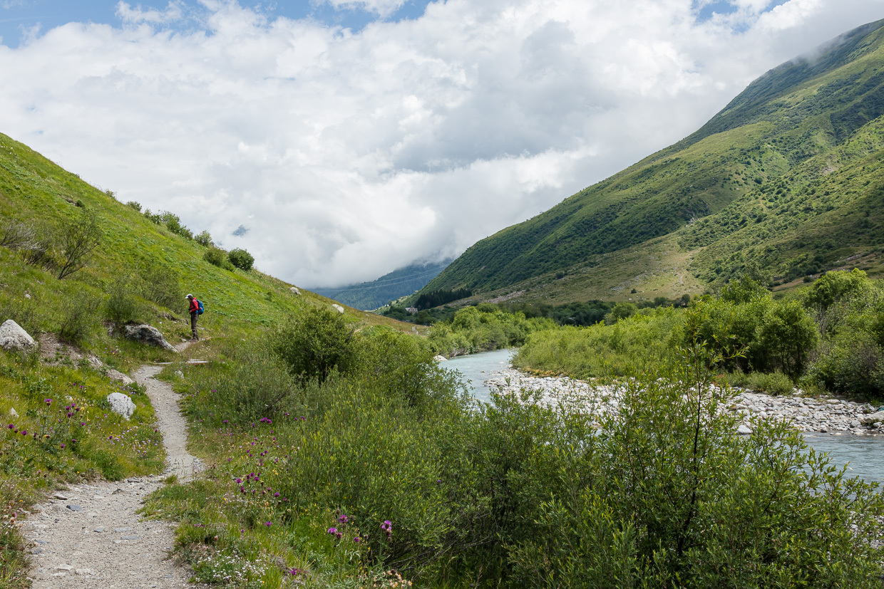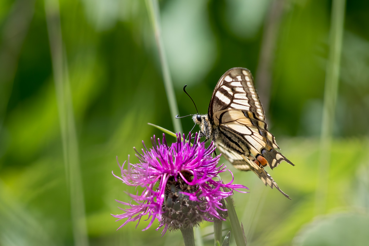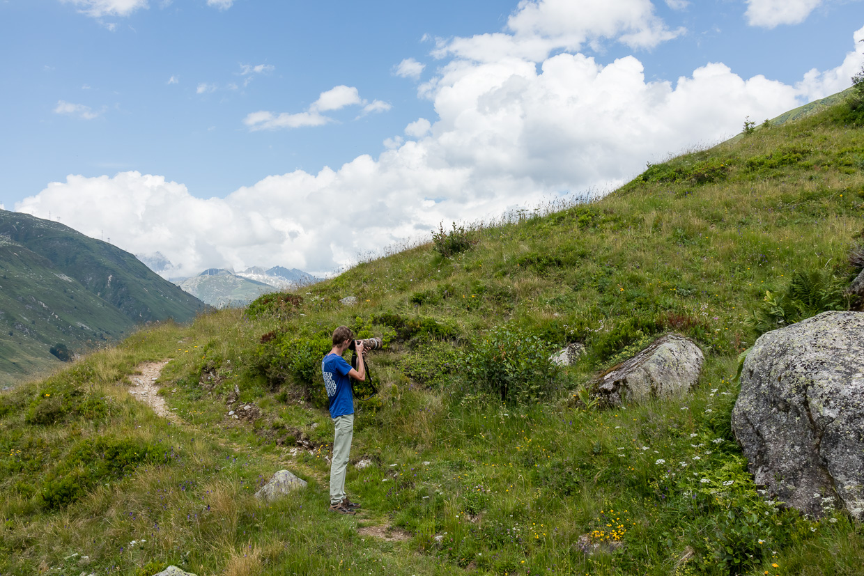 Neuer Tag, neue Hoffnung. Nach dem Frühstück geht Silvan schon mal voraus zu seiner Schmetterlingswiese, die Frau und ich kommen etwas später nach. Auch wir machen uns dort auf die Suche nach Schmetterlingen. Nachdem Silvan viele neue (für ihn) Arten gefunden hat, steigen wir ab zur Reuss, immer noch auf der Suche nach dem Karmingimpel. Wir gehen talabwärts, überqueren eine Brücke, gehen wieder hoch, aber kein Karmingimpel weit und breit. So kehren wir zur Pension zurück und essen erst mal was. Auf ornitho.ch haben wir gesehen, dass am anderen Ende des Dorfes einer gemeldet wurde. Also brechen wir wieder auf und suchen die Bäume ab, horchen. Nichts. Wir gehen bis zur Brücke über die Reuss, kehren dort wieder um.