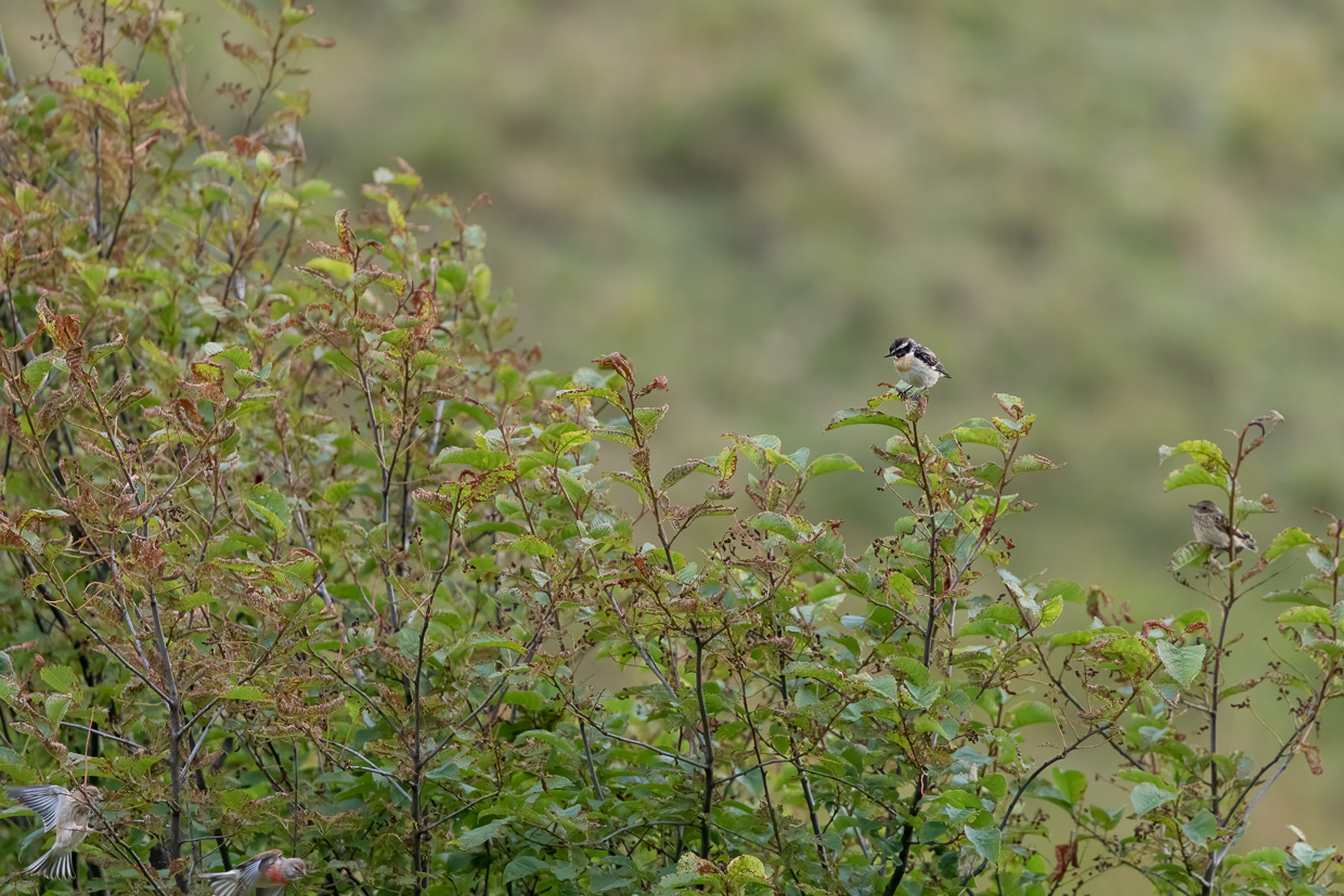 Bei der Braunkehlchenwiese muss ich nicht lange suchen, ich entdecke überall welche. Diese Dichte! Im Mittelland können wir davon nur träumen. Ein Männchen sitzt auf einem Strauch und singt, daneben ein kleines Braunkehlchen. Ich fotografiere sie. Erst am Bildschirm entdecke ich auch noch die zwei Bluthänflinge, die ebenfalls im Busch sassen.