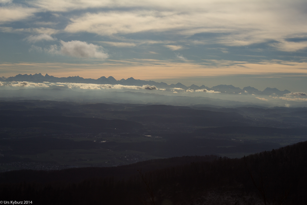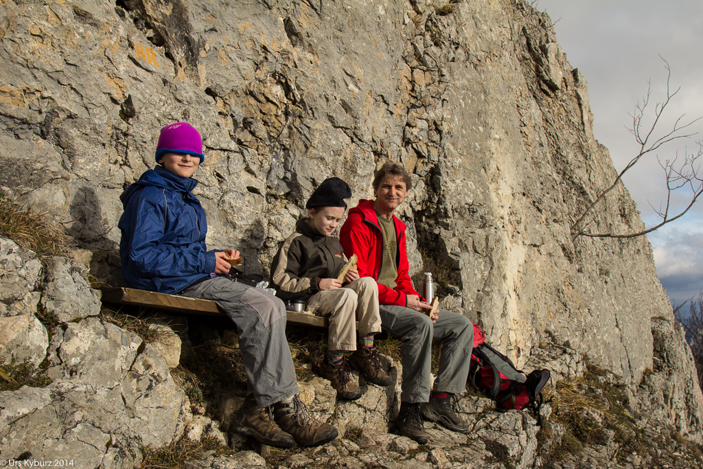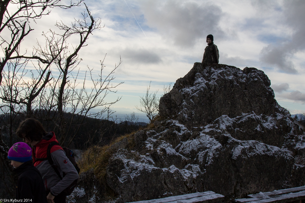 Dort, hinter einer Kurve, entdeckten wir ihn dann auch: Den Winter. Ganz scheu versteckte er sich vor der Sonne und wagte sich nicht hervor. Wir erklommen über eine Treppe die Spitze der Belchenflue, welche in den Weltkriegen als Beobachtungsplattform diente und entsprechend zurechtgesprengt wurde. Man genoss von hier wirklich eine hervorragende Aussicht: In den Schwarzwald, ins Mittelland und die Alpen schienen auch nicht fern. Wir konnten uns kaum satt sehen. Irgendwann machten wir uns trotzdem an den Abstieg, nicht aber ohne vorher noch eine Pause einzulegen unterhalb des Gipfelfelsens.