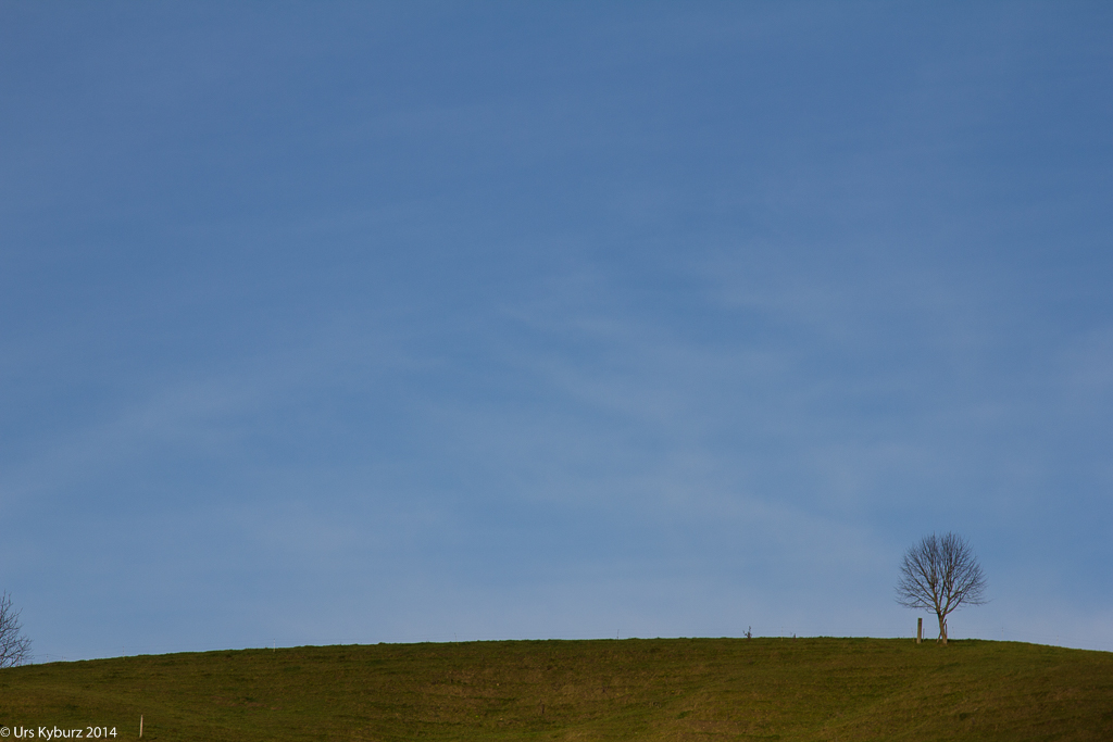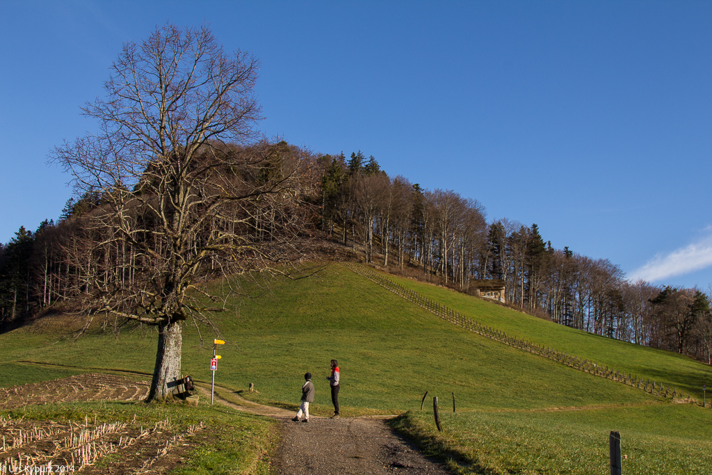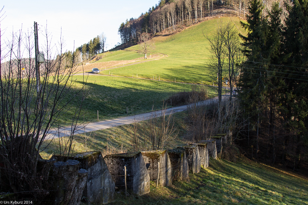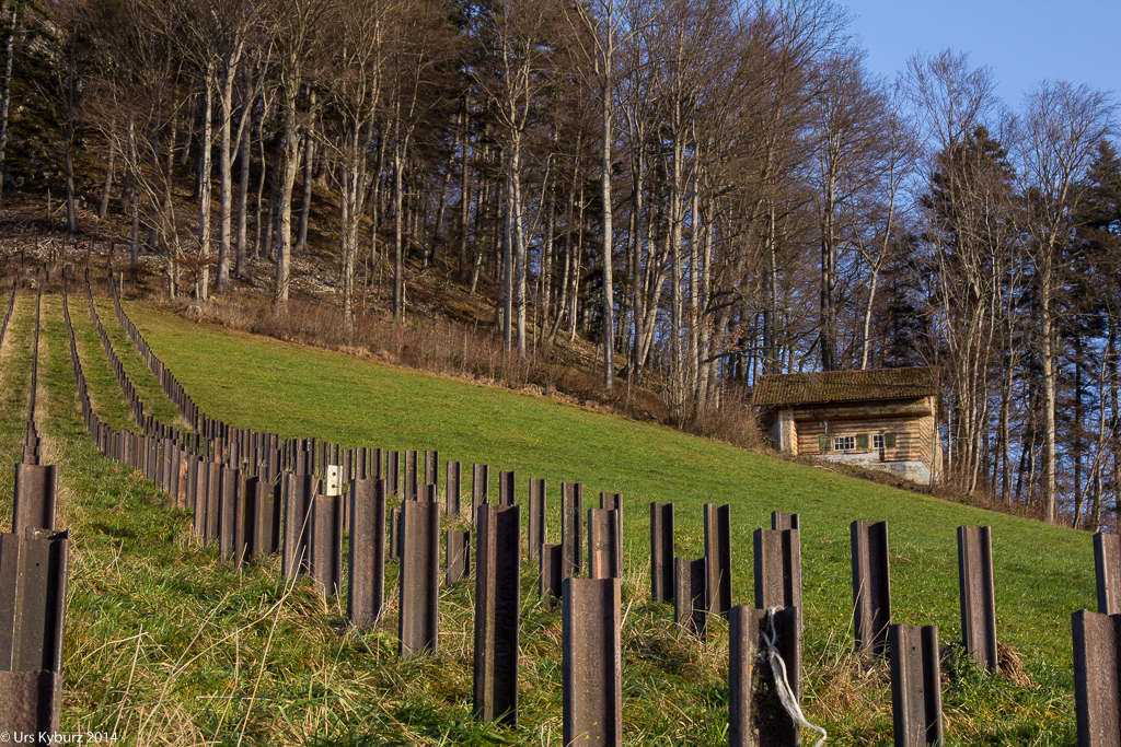 Der Vorteil vom Winterwandern hier ist ja, dass man alleine unterwegs ist. Mutterseelenalleine. Bis zur Challhöchi, das war immerhin eine Stunde Wanderzeit, begegneten uns gerade mal zwei Personen. Bei diesem Übergang fielen uns zwei Sachen auf: Zum einen ragten vom Berg her kommend mehrere Reihen Eisenbahnschwellen aus dem Boden, zum anderen war oben am Waldrand ein Chalet. Eine eigenartige Lage für ein Ferienhaus oder so. Beim genaueren hinsehen fiel uns auf, dass die Balken und Fenster bloss aufgemalt waren, das ganze Haus aus härtestem Beton bestand: Ein Bunker, getarnt als Häuschen. Willkommen bei der Fortifikation Hauenstein. Diese wurde während des Ersten Weltkrieges erbaut und bestand aus Bunker, Schützengräben und anderen Bewehrungen. So sollte verhindert werden, dass weder die Deutschen noch die Franzosen eine Umgehung der feindlichen Linie über die Schweiz vornehmen konnten. Im Zweiten Weltkrieg kamen die Panzersperren hinzu.