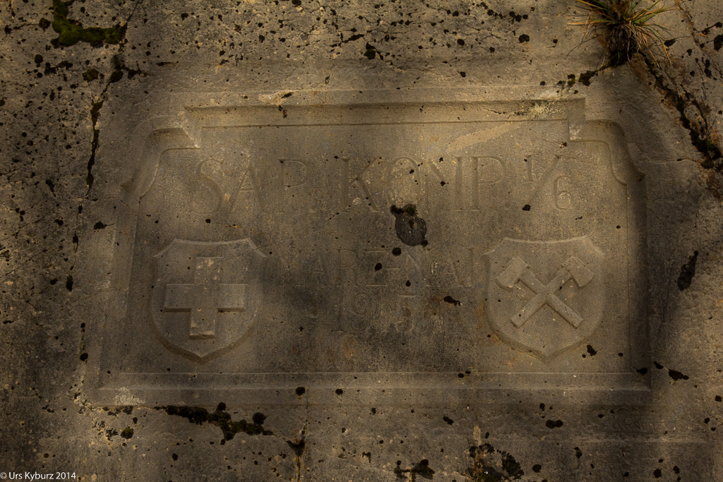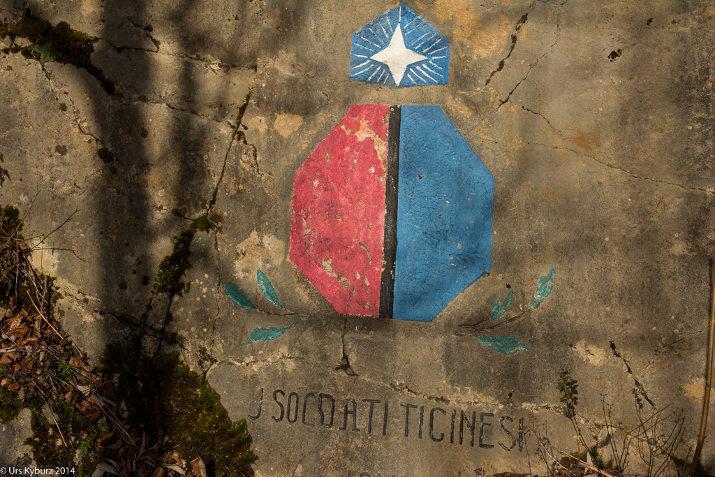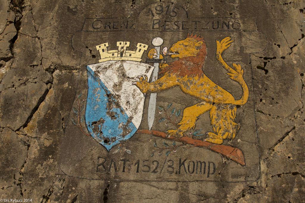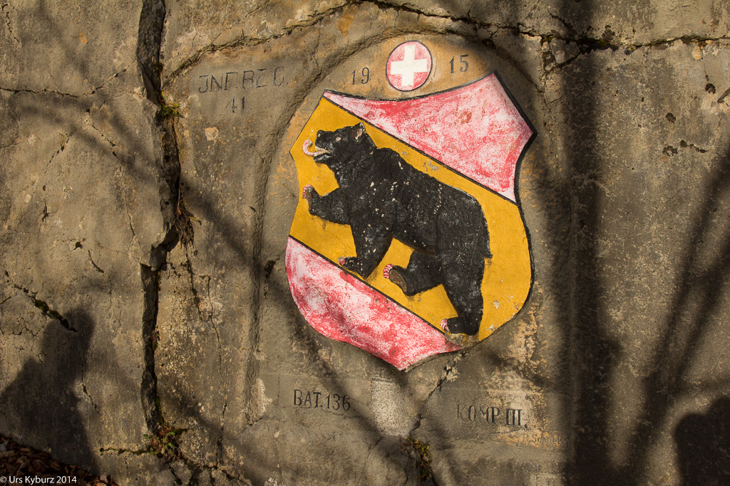Von der Challhöchi her wechselte der Charakter von Einsamkeit zu Trubel. Kein Wunder, konnte man doch bis hier hin mit dem Auto fahren und dann schnell auf die Belchenflue steigen. Wir liessen uns aber nicht abschrecken, wir wanderten weiter. Unterwegs holten wir noch schnell einen Geocache, der natürlich bei einem Bunker versteckt war. Wir passierten das General-Wille-Haus, das im Winter von der SAC-Sektion Olten bewirtet wird, kamen an den Wappen vorbei, die die verschiedenen Militäreinheiten hinterlassen hatten, bis wir die Belchenflue erreichten.