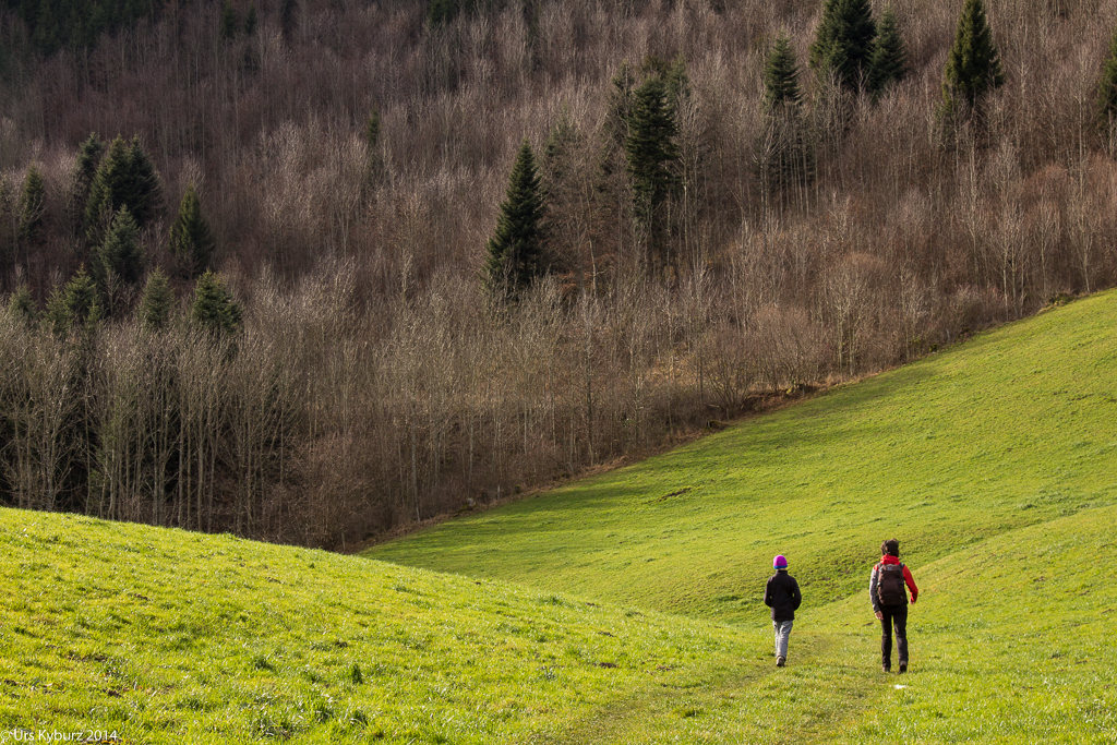 Nachdem uns der Chauffeur auf dem Hauenstein endlich ausstiegen liess („Ach, ihr wollt hier aussteigen?“), konnten wir unsere Wanderung starten. An Bauernhöfen vorbei, durch hügeliges Gelände, erreichten wir bald den Wald.