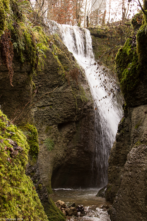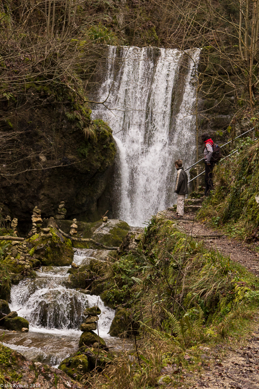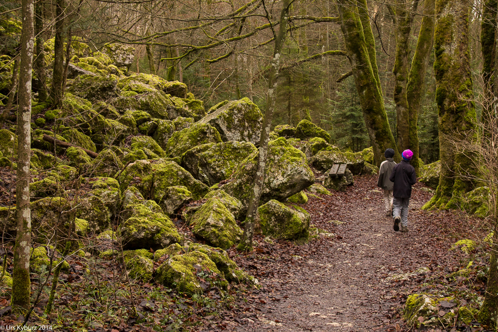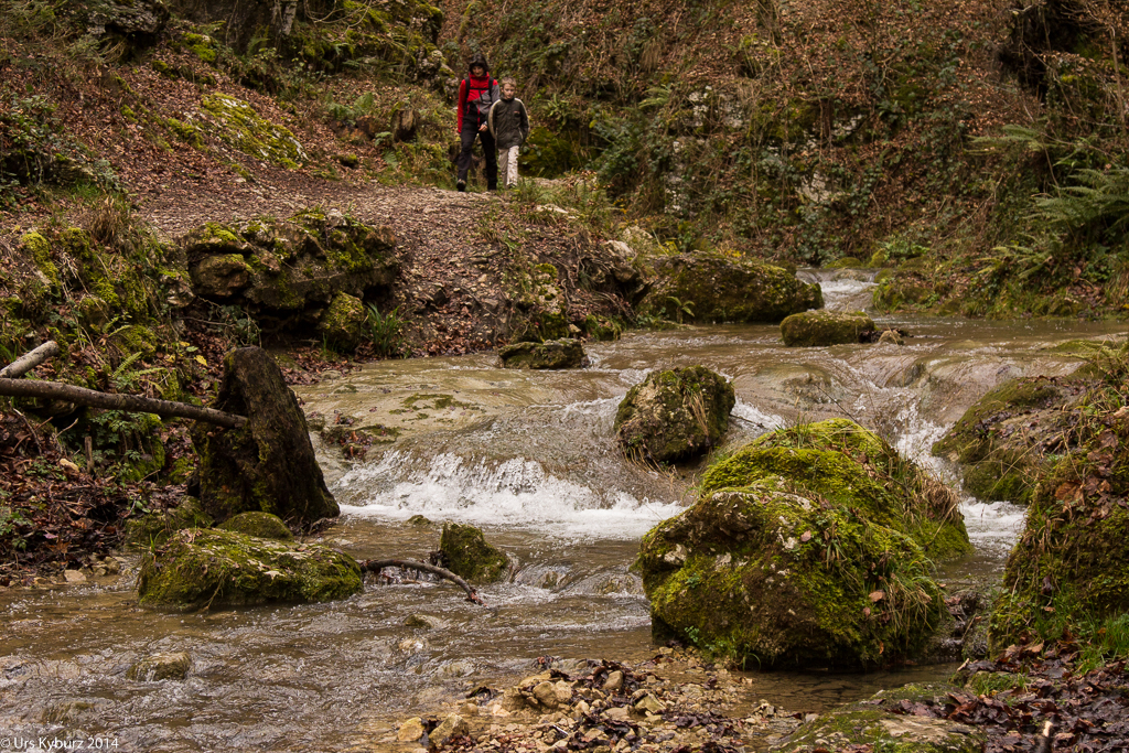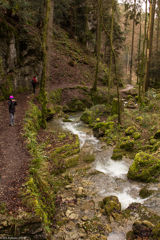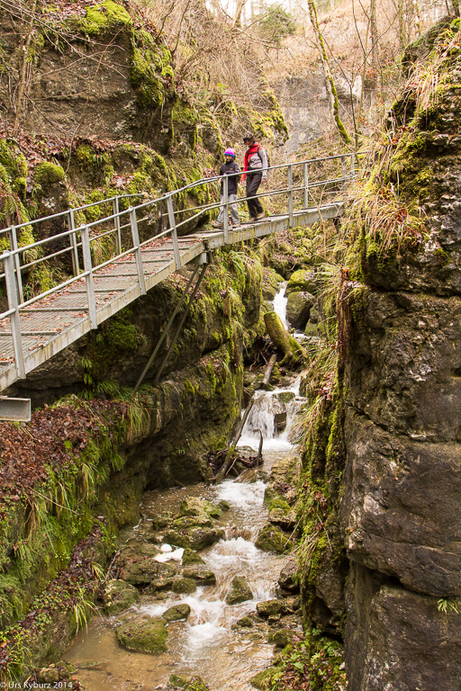 Nach der Pause machten wir uns auf zum nächsten Ziel: Der Tüfelsschlucht. Wieder begegneten uns viele Leute, die von irgendeinem Parkplatz her aufstiegen. Erst als wir mal nicht autogerecht abbogen, waren wir wieder alleine. Am Alterszentrum und Restaurant Allerheiligenberg (dieses hatte aber geschlossen) vorbei, erreichten wir bald besagte Schlucht. Dies war keine wilde Sache mit steil aufragenden Felswänden, sondern eher ein munter sprudelndes Bächlein, das sich durch ein Tobel zwängte. Schön war es allemal. Nach der Querung der Strasse erreichten wir den zweiten Teil der Schlucht, wo es schon mehr Wände und Brücken und Stege über den Bach hatte.