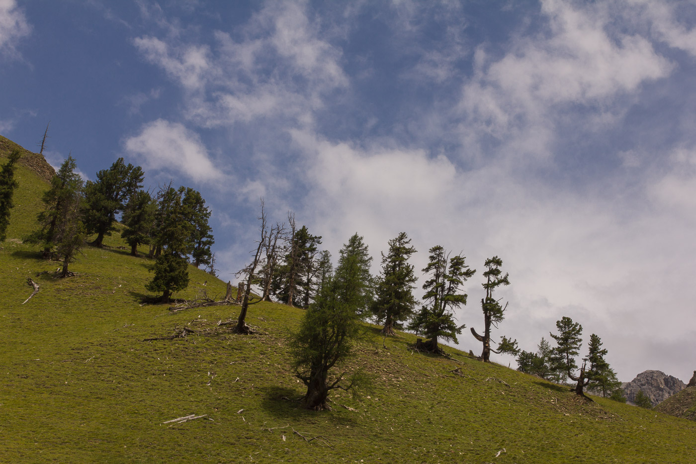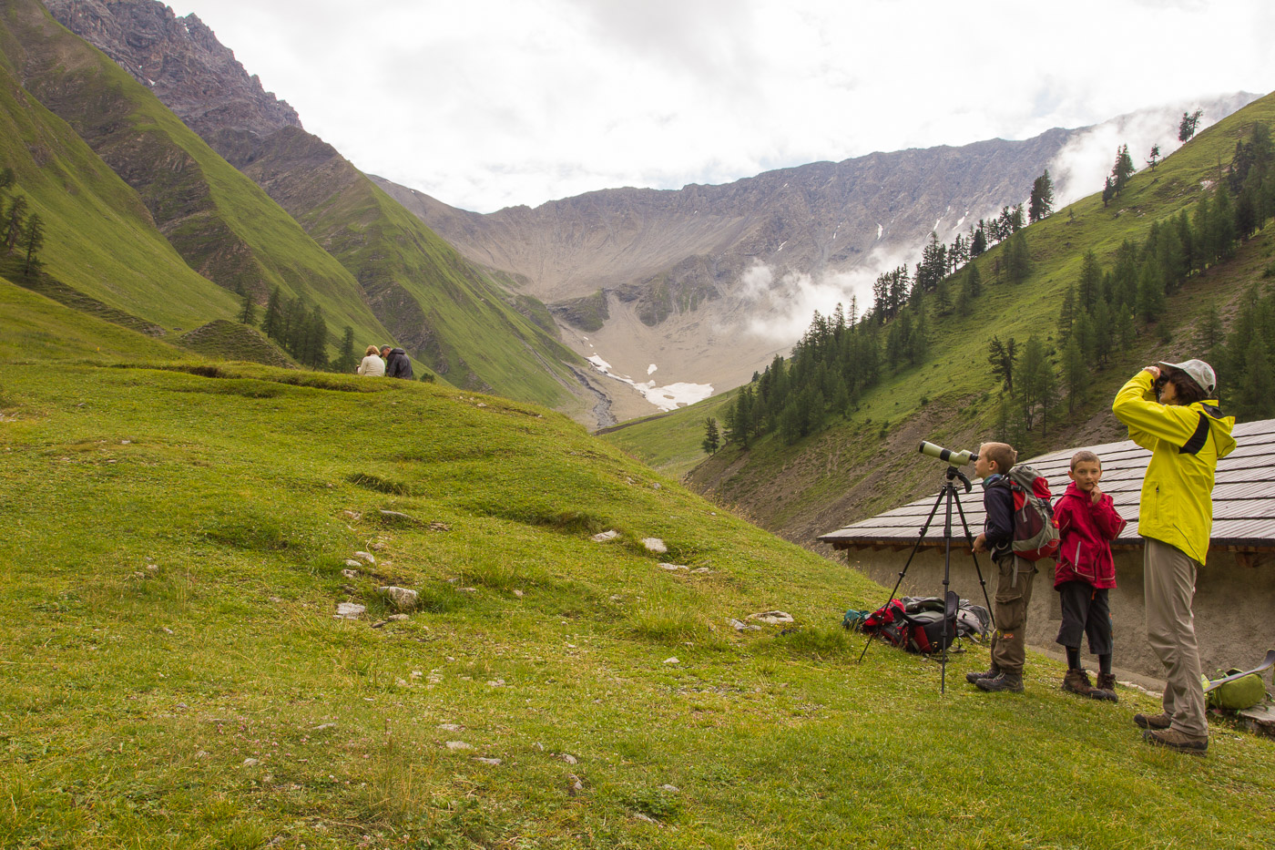 An einer einigermassen trockenen Stelle unter einer Lärche spähte ich auf die andere Talseite – und entdeckte Rothirsche. Ich packte mein Fernrohr aus und richtete es auf die Gruppe. 15 Exemplare zählten wir, alles Männchen mit mächtigem Geweih. An einer anderen Stelle sahen wir graue Tiere. Durch den Feldstecher war nicht klar, ob es sich um Schafe (die Tiere befanden sich ausserhalb des Nationalparkes) oder um Gämsen handelte. Auch hier schaffte das Fernrohr Klarheit: Es handelte sich um Gämsen. Am anderen Ufer des Baches lugte ein Murmeltier aus seiner Höhle hervor. Somit fehlten nur noch die Steinböcke.