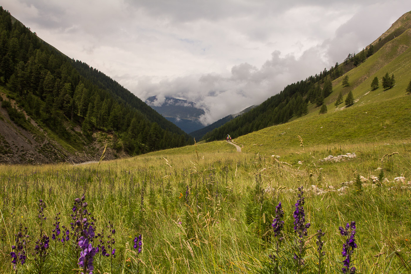 Unterdessen setzte der Regen wieder ein, zuerst zuhinterst im Tal. Wir hofften, noch davon zu kommen, aber bald traf auch uns die Regenwolke. Erst als wir S-chanf erreichten, hörte der Regen wieder auf. Unsere Hosen waren klitschnass, dafür die mitgeführten Regenhosen noch trocken – im Rucksack.